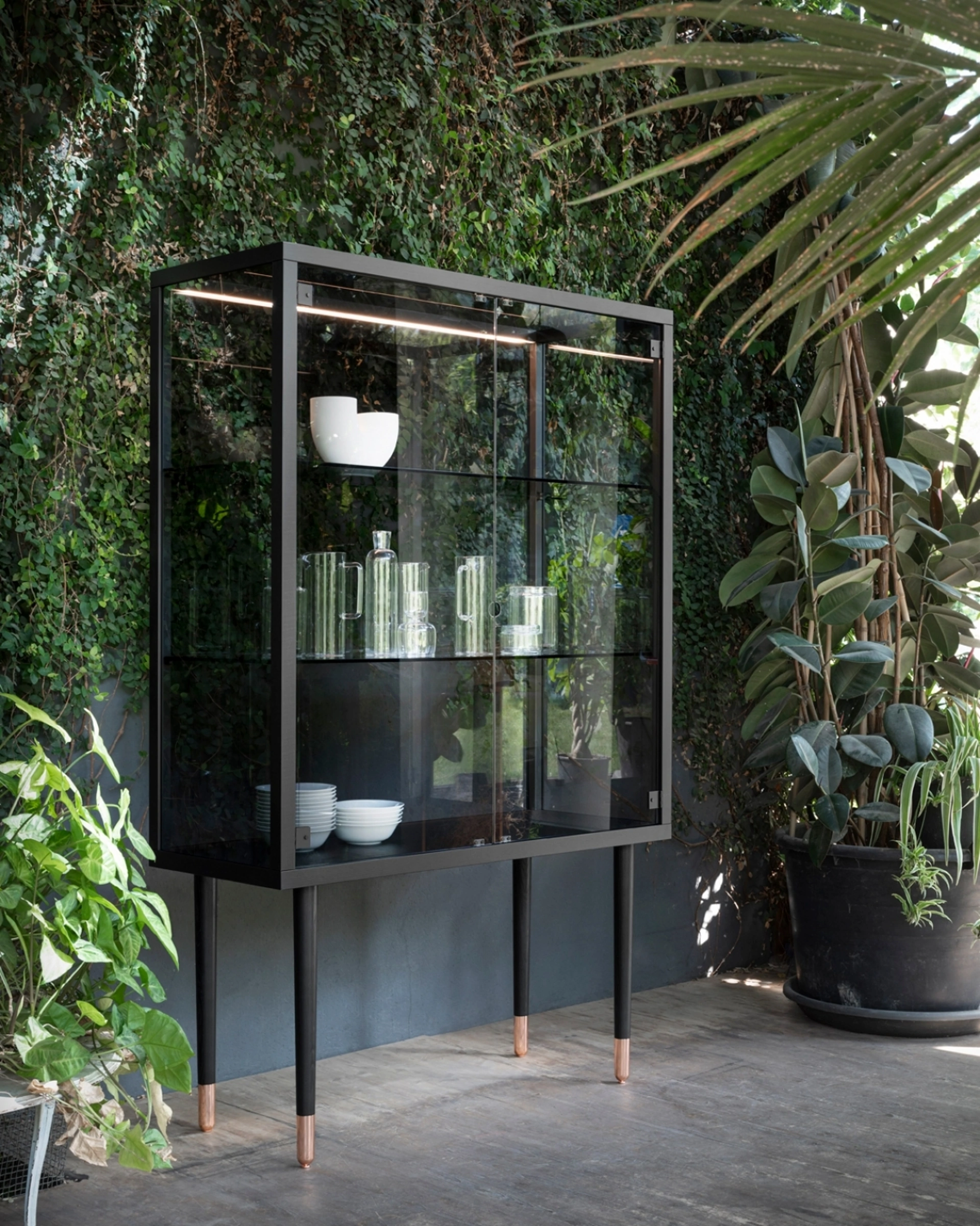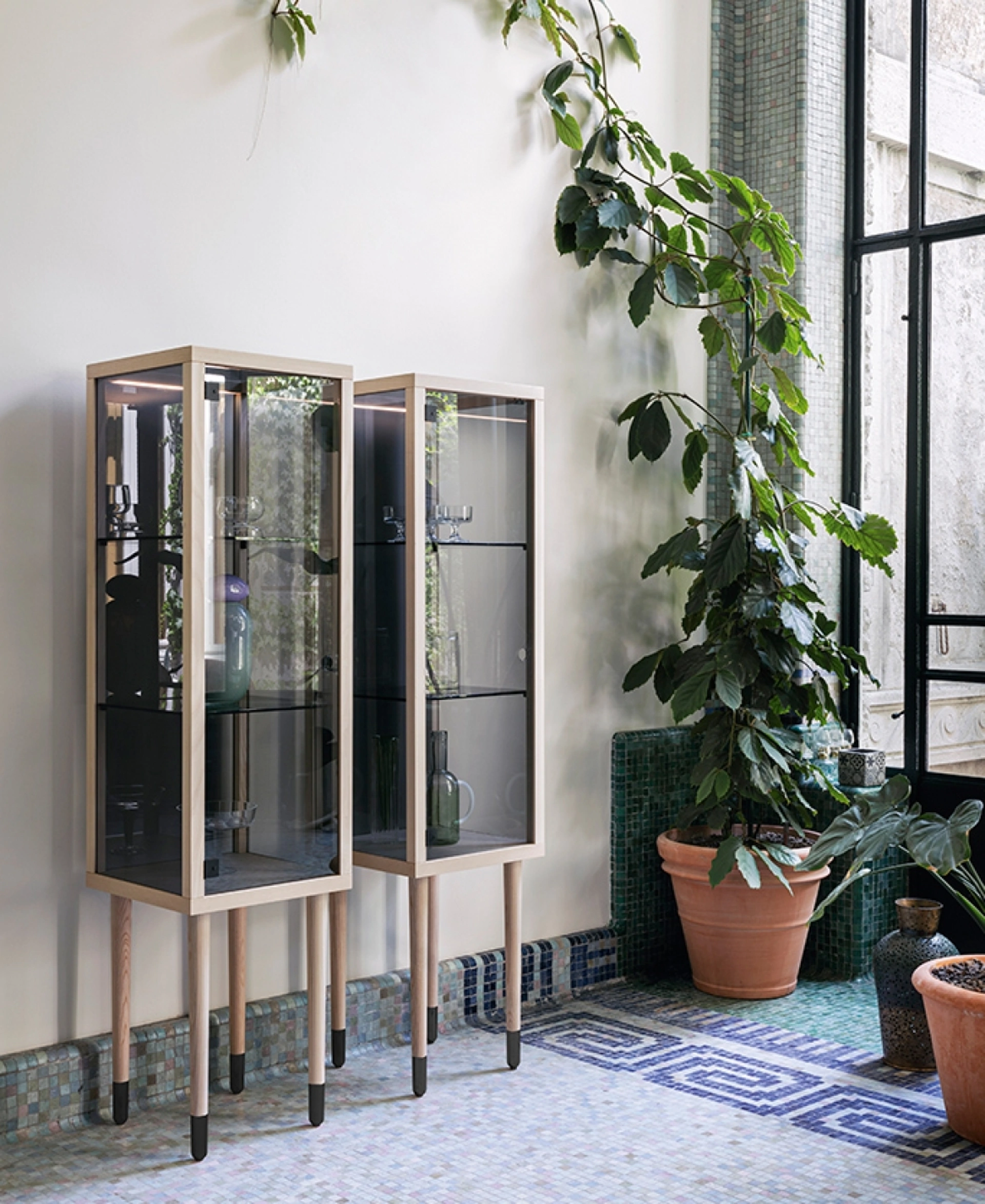 | Materiale: | Struttura in frassino (naturale, tinto noce o nero), lati e ripiani interni in vetro grigio Europa. |