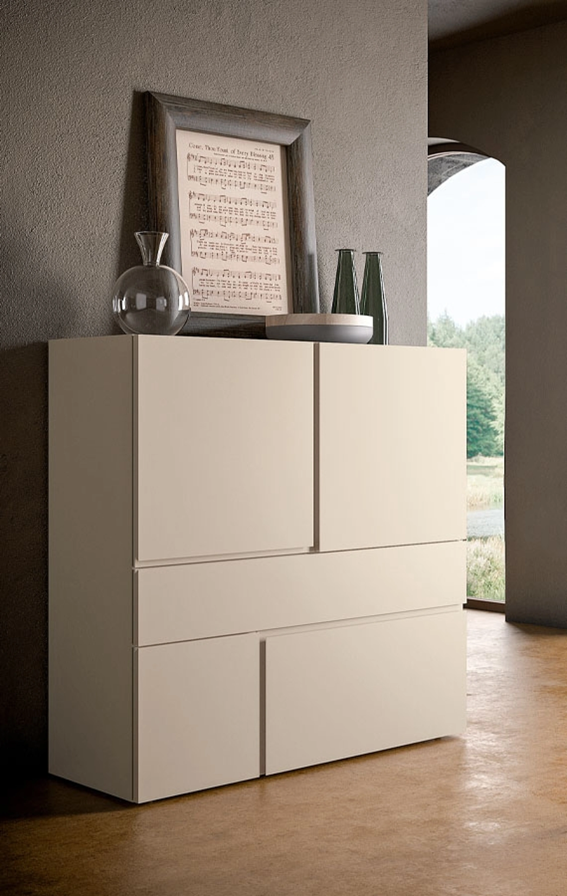 La Madia Quadra opaca Seta offre un design raffinato e una funzionalità superiore, disponibile con il nostro servizio completo di consegna e montaggio professionale. Serviamo con cura e precisione le aree di Como, Varese, Tradate, garantendo che ogni aspetto dell'installazione sia gestito con la massima perizia. Questa madia si distingue per i volumi puliti e le superfici impeccabili, arricchite da angoli netti e una lavorazione artigianale del legno massello per le ante con gole. Realizzata con pannelli di legno e ripiani in vetro trasparente, la Madia Quadra opaca Seta è una scelta di stile e durata. La tua completa soddisfazione è la nostra priorità, con un'assistenza post-vendita dedicata per assicurare la massima tranquillità e valore nel tempo.