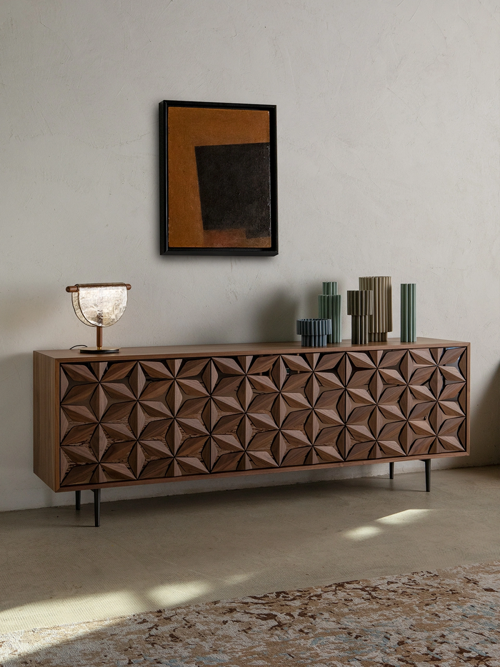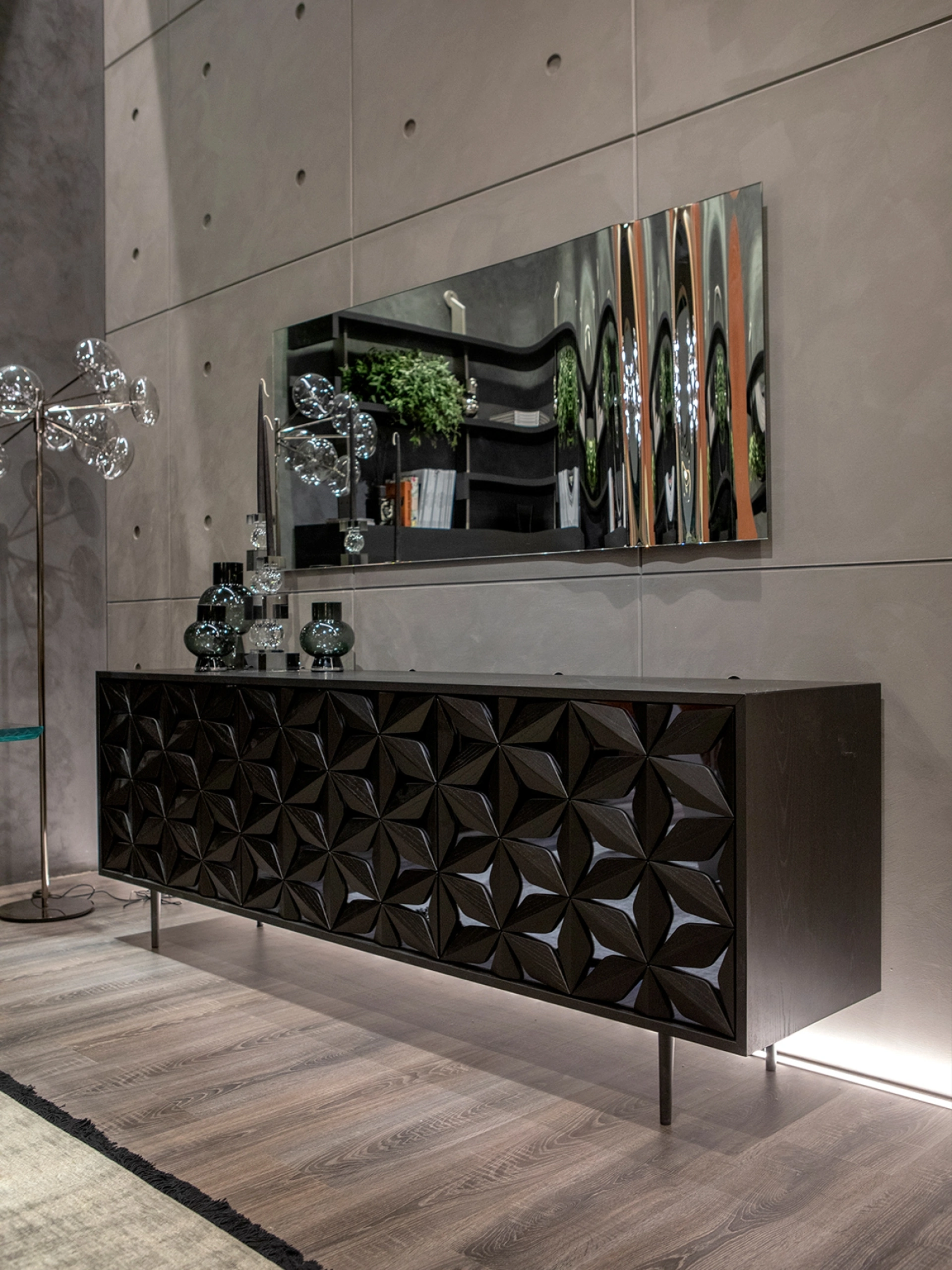 Scopri la Madia All Star di Tonin Casa, un'esclusiva disponibile nel nostro showroom Rusconi Arredamenti s.r.l. a Cirimido. Disegnata da Angelo Tomaiuolo, questa madia si distingue per le sue linee pulite e la raffinata decorazione delle ante: una 'costellazione' di petali in legno massello, applicati artigianalmente, che dialogano splendidamente con le basi specchiate. Un vero capolavoro di design e artigianato italiano che puoi ammirare dal vivo. La soluzione d'arredo ideale per chi vive tra Lugano e Varese e cerca qualità e stile per la propria casa. Ti invitiamo a visitare il nostro negozio per esplorare le diverse configurazioni e finiture e trovare la soluzione perfetta per il tuo ambiente.