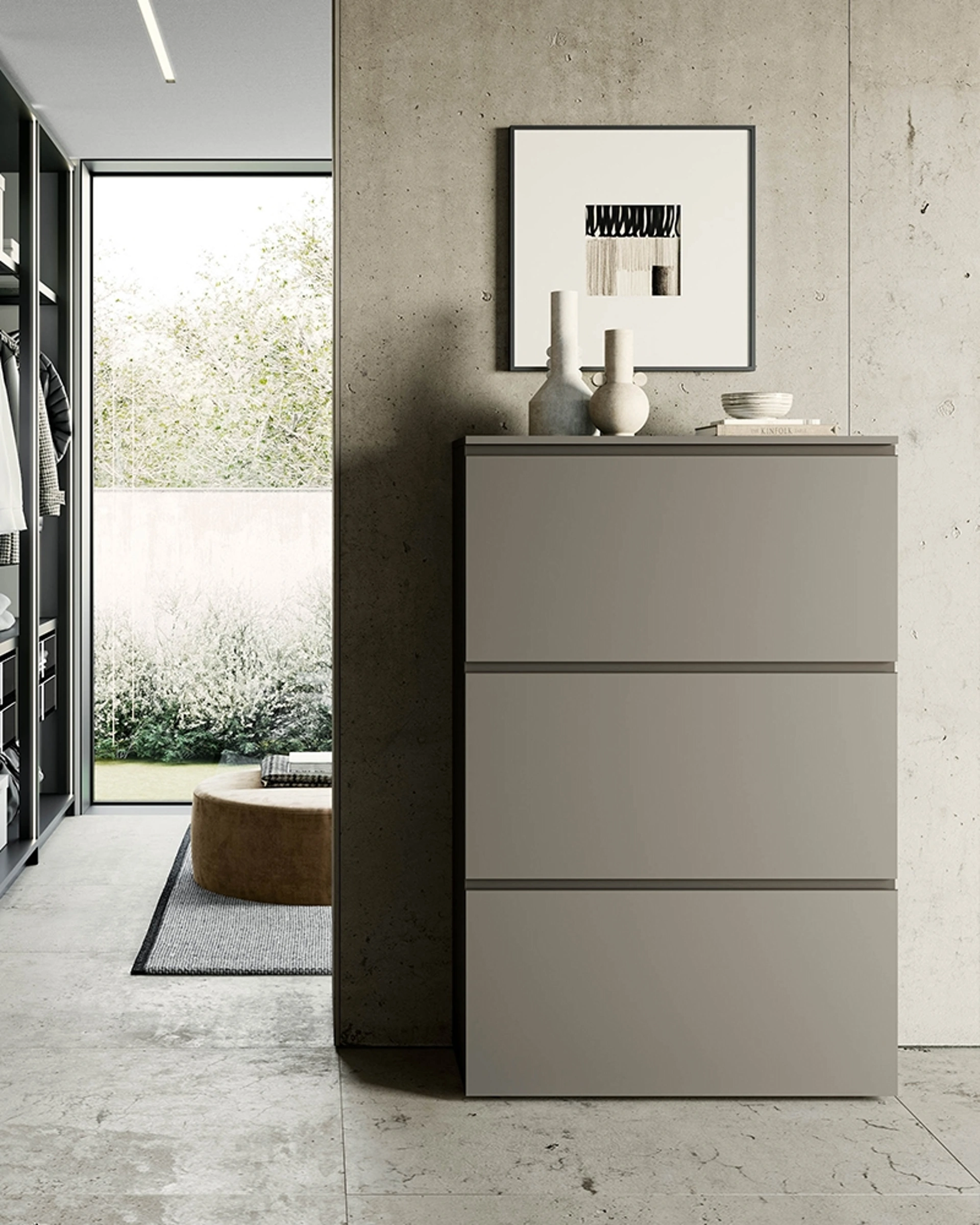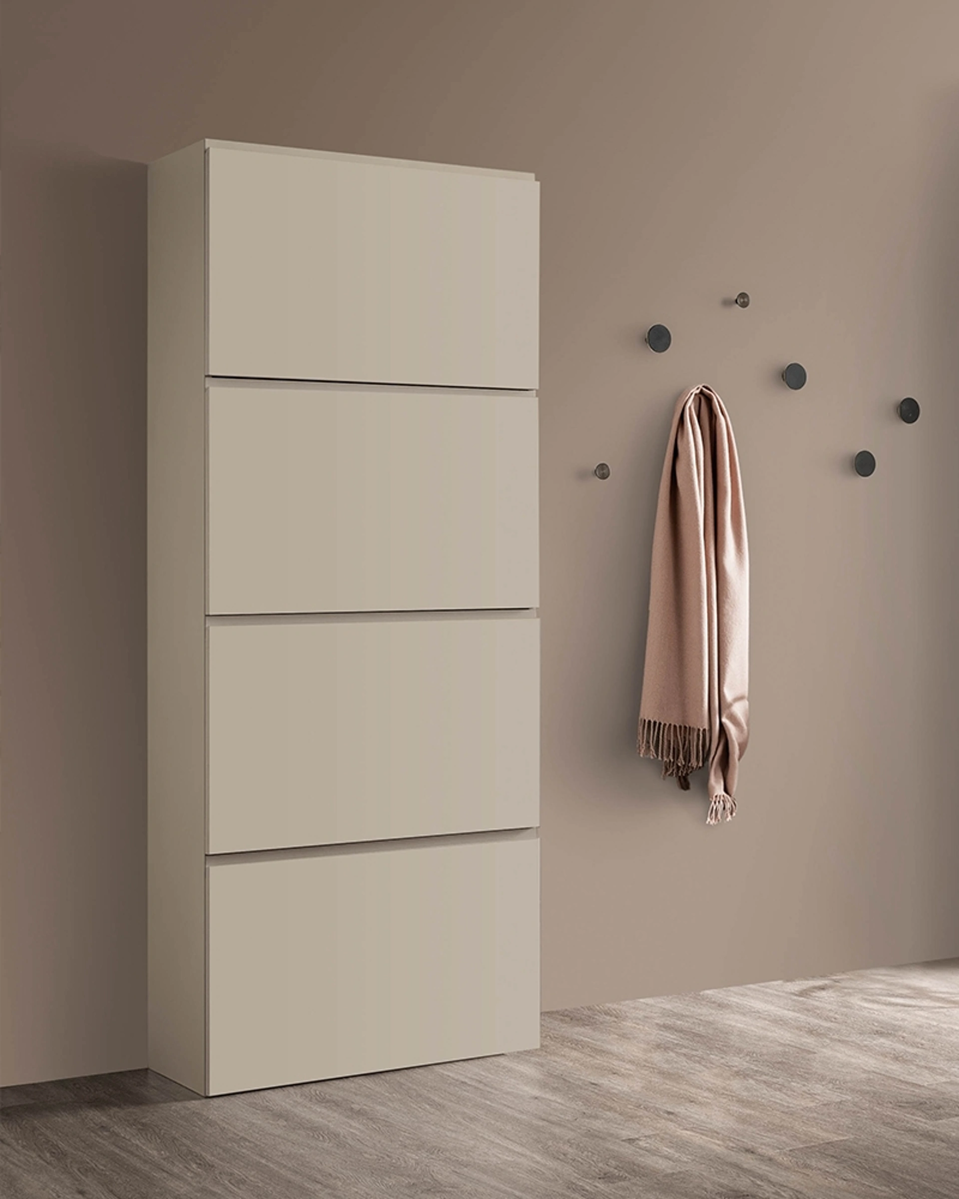 La scarpiera Minima di Birex incarna un'estetica puramente lineare e un'eleganza funzionale, definita dall'integrazione di una maniglia a gola. Questo sistema di contenimento è configurabile con moduli da una a quattro ante a ribalta, offrendo una versatilità adattabile a svariati contesti d'arredo. Le opzioni di finitura sono ampie, spaziando da laccature opache e lucide a superfici con effetti legno, pietra o metallo. L'organizzazione interna è altamente personalizzabile: ogni vano può ospitare da uno a tre scomparti, e la possibilità di rimuovere le divisioni interne consente l'alloggiamento di calzature di dimensioni maggiori. Un modulo opzionale di sanificazione dell'aria può essere integrato per ottimizzare l'igiene. La struttura permette installazioni sospese, su piedini regolabili o tramite supporti metallici sottili, garantendo massima flessibilità di posizionamento. La progettazione avanzata assicura un'ottimizzazione degli spazi e una durabilità superiore.