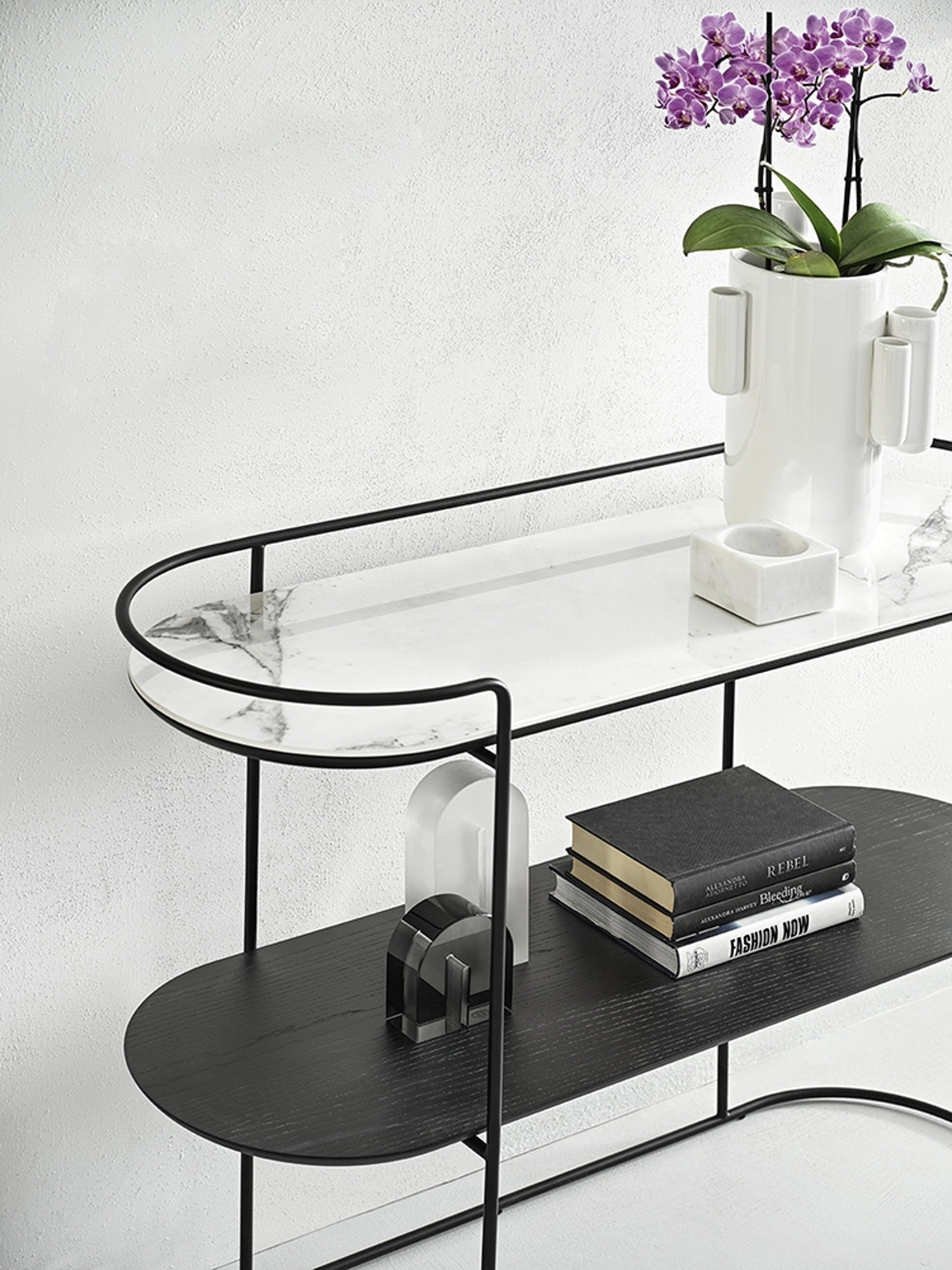 Il modello Atollo in ceramica presente in foto, uno dei mobili Calligaris per ingressi moderni, ti sta aspettando