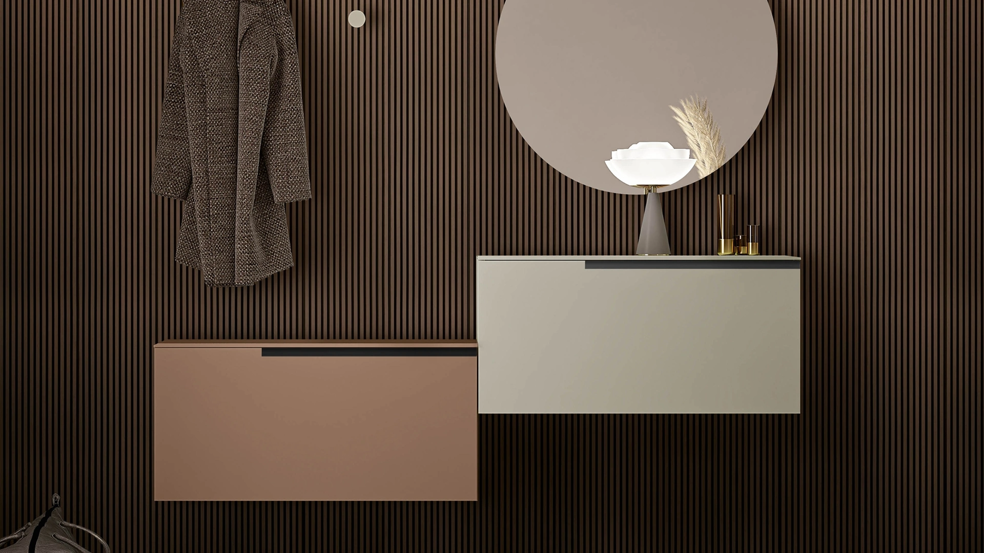 Il modello Gola Up Orizzontale in laccato opaco visibile in foto, uno tra i mobili Birex per ingressi moderni, ti aspetta