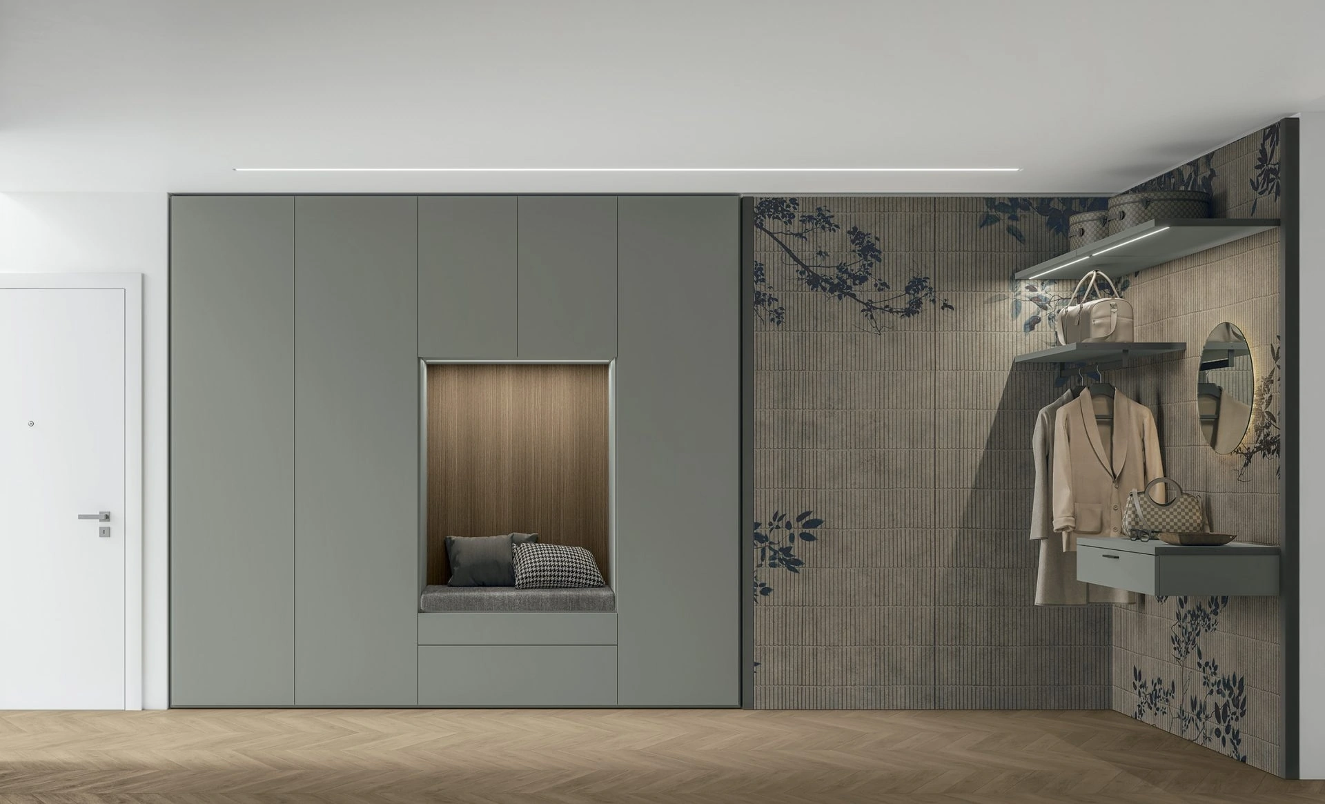 Il nostro showroom Rusconi Arredamenti s.r.l. a Cirimido è lieto di ospitare Logica Plus UNIT_05, una delle soluzioni d'arredo più richieste e vendute nella nostra area, un'autentica eccellenza per l'ingresso. L'ingresso Logica Plus UNIT_05 di Tomasella è un sistema d'arredo intelligente, ideato per trasformare ogni corridoio in un ambiente accogliente e altamente funzionale. Caratterizzato da un'armadiatura funzionale con seduta e spazio contenitivo, e una sezione guardaroba completamente a vista, questo sistema assicura ordine e praticità all'arrivo e alla partenza. Le superfici dell'ingresso si distinguono per un'attenta scelta di finiture e soluzioni d'arredo: l'armadiatura si presenta in materico opaco Basalto, mentre il modulo panca con cestoni sfoggia una schiena in materico Traccia Rovere Cognac. La parete attrezzata per l'entratina è arricchita da decorazioni in Grafica 1062, con mensole e cassetto perfettamente abbinati alle ante.
