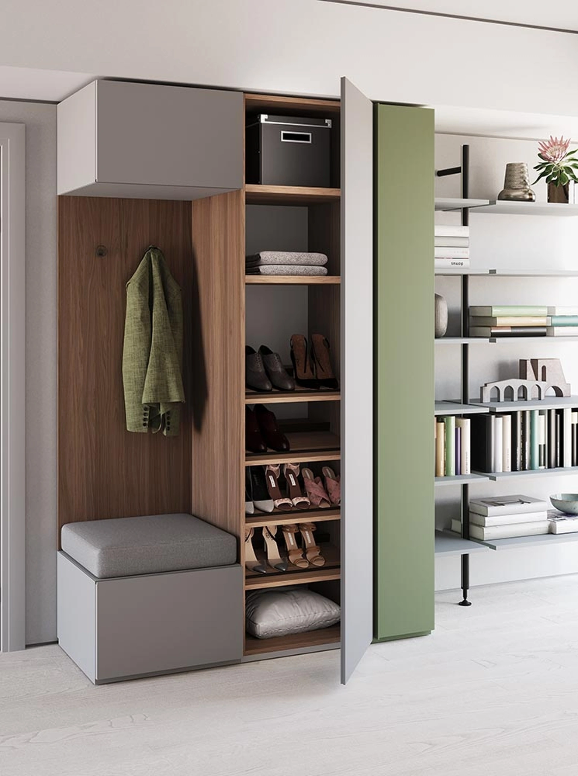 L'arredo per ingresso Type 06, firmato da Astor Mobili, si distingue per la sua estetica essenziale e la struttura visivamente leggera. Progettato per ottimizzare e definire gli ambienti con raffinatezza, propone un'integrazione funzionale e stilistica. La configurazione comprende moduli contenitore realizzati in noce canaletto, con frontali disponibili in finitura laccato ardesia o verde oliva, offrendo versatilità cromatica. La composizione è arricchita da una libreria con sistema a pali 'Sunrise', dotata di mensole in laccato ardesia, e da un pannello a muro attrezzato con elementi appendiabiti, anch'esso in noce canaletto, massimizzando l'efficienza spaziale. L'innovazione nel design e la funzionalità avanzata sono i pilastri di questa proposta, che si integra armoniosamente in contesti moderni ed evoluti, offrendo soluzioni complete.