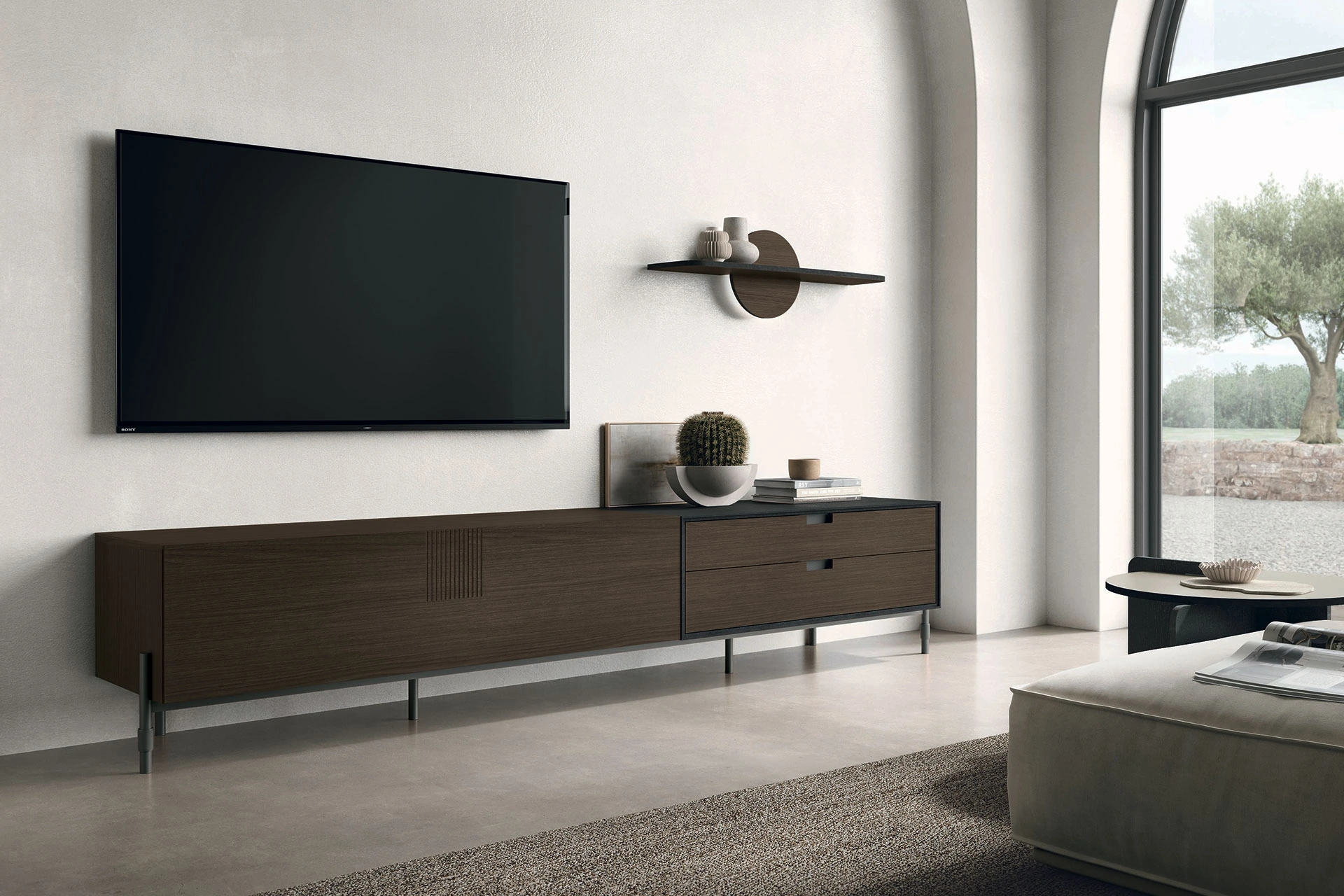 Quali sono le opzioni di personalizzazione disponibili per il mobile porta TV TIME UNIT TI 130?Rusconi Arredamenti s.r.l. offre la possibilità di personalizzare le dimensioni standard degli arredi e scegliere tra diverse finiture. Presso la nostra materioteca potrai visionare i campioni di materiali (legni, laccati) e definire il progetto con l'aiuto dei nostri esperti.