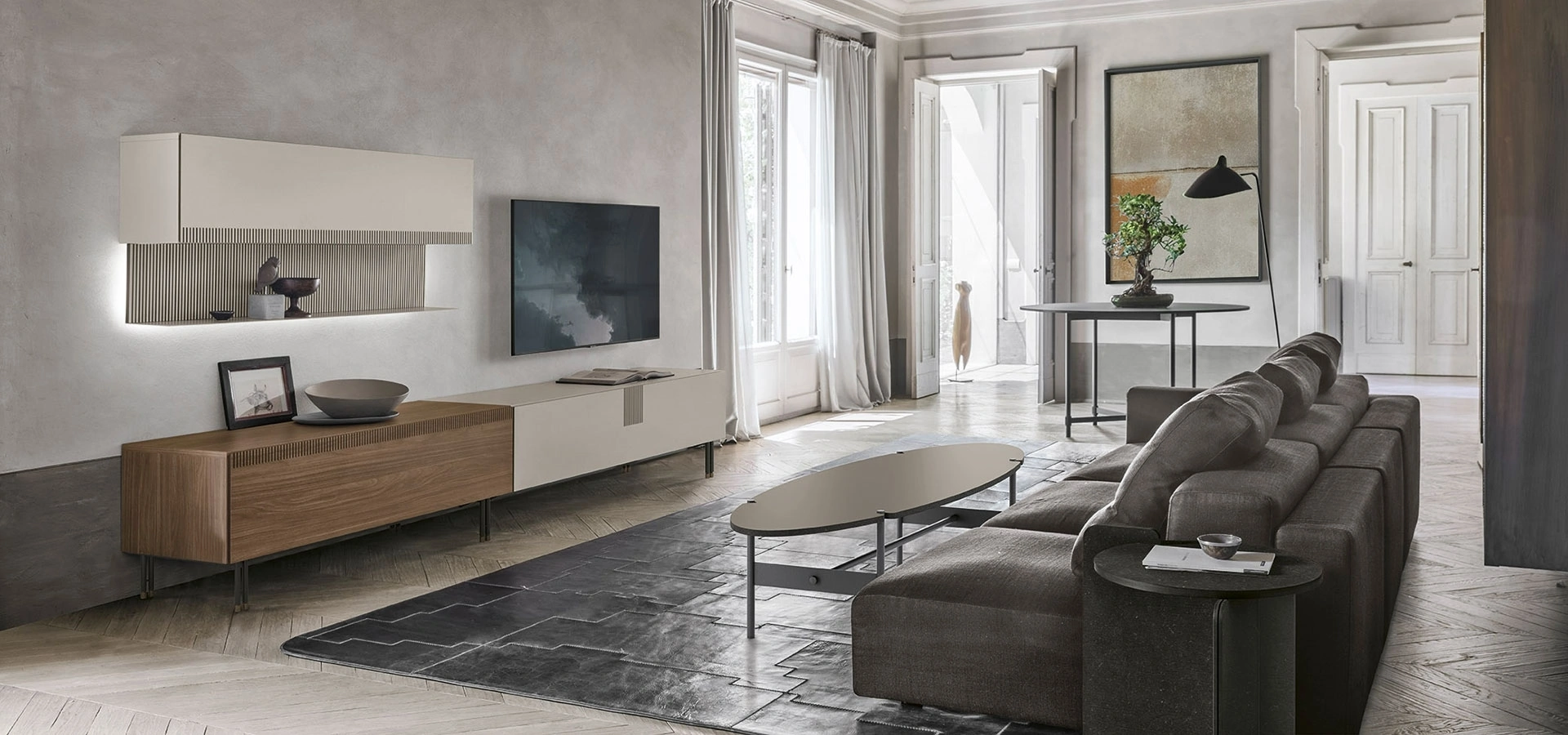 Il mobile porta TV TIME UNIT TI 105 di Tomasella si distingue per una meticolosa lavorazione delle superfici, caratterizzata da un raffinato effetto cannettato che impreziosisce ogni elemento: il pensile, la mensola e la base. Questa soluzione di design esclusiva è stata progettata per esaltare l'ambiente living, conferendogli uno stile inconfondibile e contemporaneo. Le finiture disponibili, illustrate nelle immagini, comprendono il CDF noce ambra e il CDF madreperla, abbinate a una boiserie in CDF madreperla canetté e una laccatura opaca madreperla 124, completate da un solido basamento TRACKS. L'integrazione di questi materiali e tecniche costruttive assicura non solo un'estetica di alto livello ma anche una notevole durabilità e funzionalità. Per un'analisi approfondita delle specifiche tecniche e delle opzioni di personalizzazione, è consigliabile consultare la documentazione tecnica del prodotto.