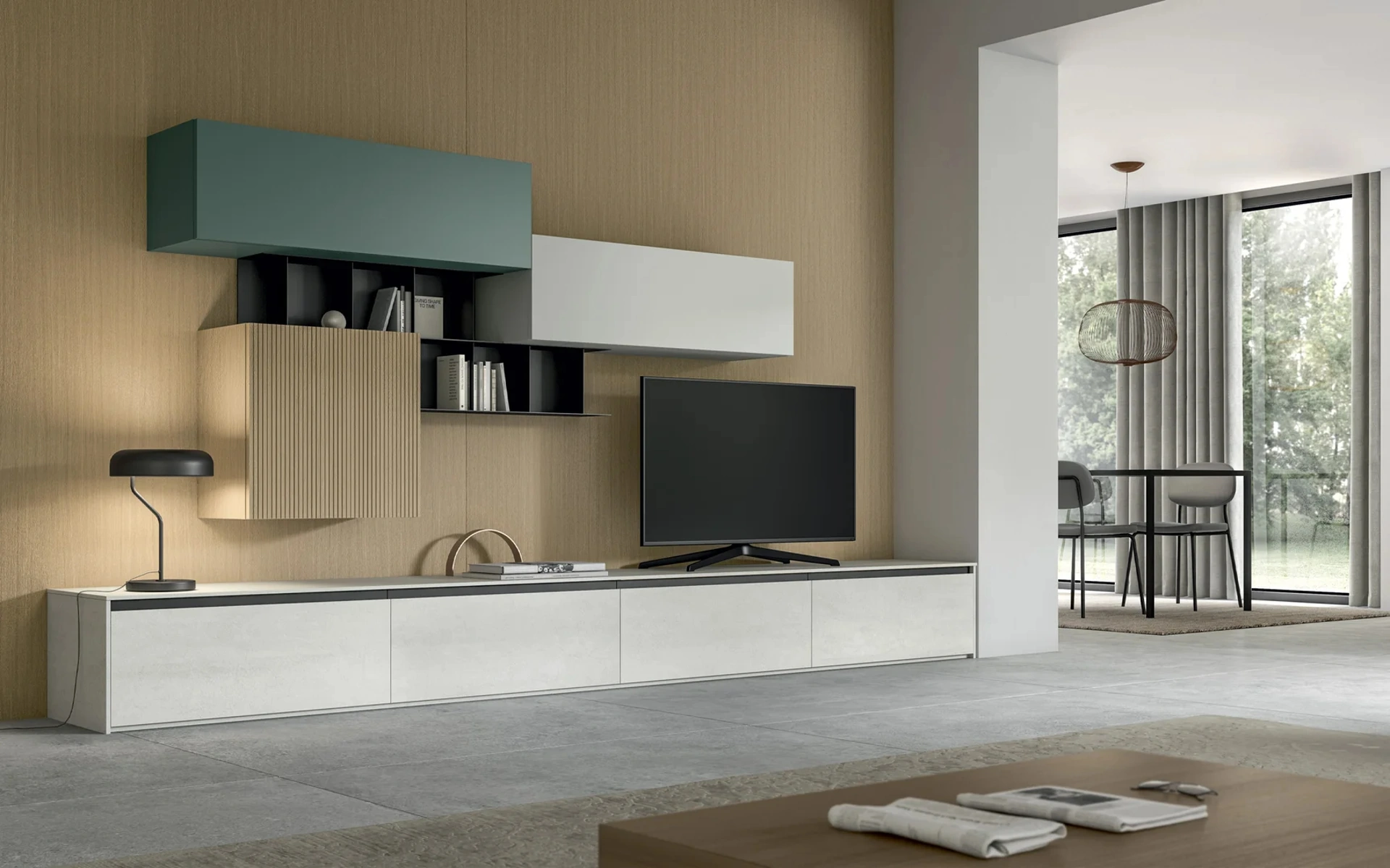 Quali opzioni di modularità e composizione offre la collezione Living Glass di Arredo3?La collezione Living Glass è altamente modulare, permettendo composizioni personalizzate con basi, pensili, colonne e mensole a giorno. Include moduli TV con passacavi integrati e ante con diverse aperture come battenti, ribalta o push-pull.