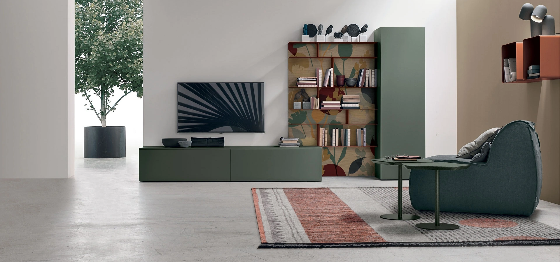 Parete Attrezzata Atlante UNIT AT137 di Tomasella: scopri una delle più originali soluzioni in laccato opaco per arredare il living con noi