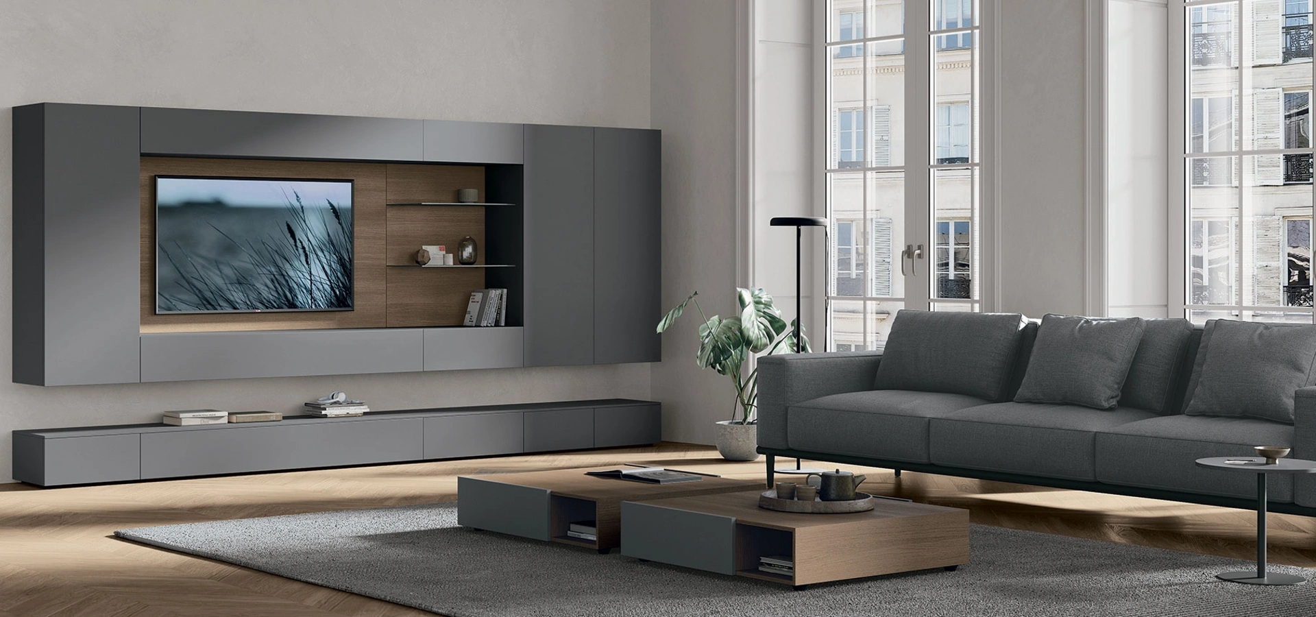 Quali opzioni di modularità offre la parete attrezzata Atlante UNIT AT143?La parete attrezzata Atlante UNIT AT143 di Tomasella è altamente modulare e configurabile. Include basi, pensili, colonne, moduli TV con passacavi integrati e mensole a giorno per adattarsi a ogni esigenza di spazio.