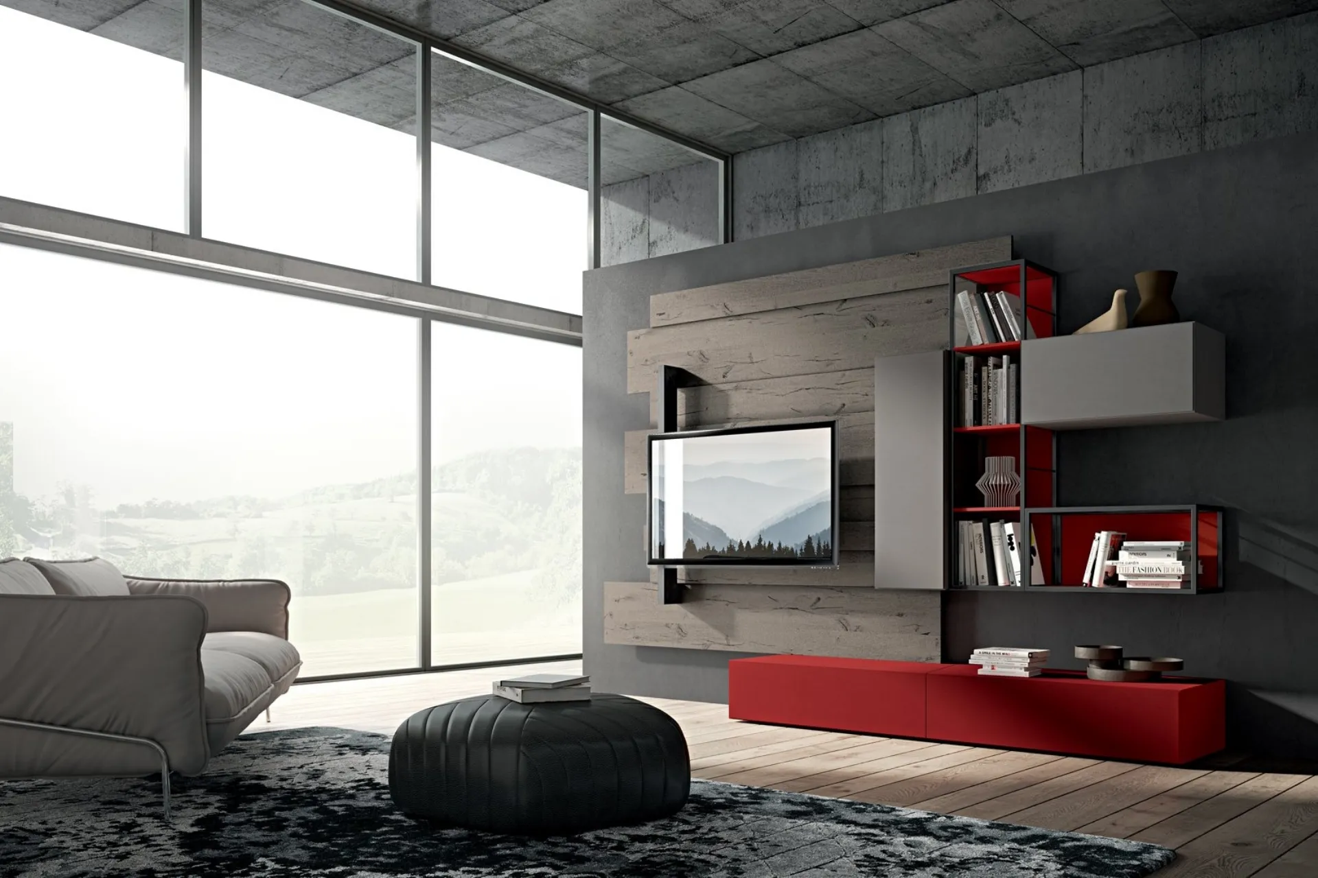 Quali sono le caratteristiche principali della parete attrezzata Fimar Rebel R 06?La parete attrezzata Rebel R 06 offre una composizione versatile con basi, pensili, colonne e moduli TV. Include mensole e ripiani a giorno, oltre a diverse opzioni di ante come battenti o a ribalta, configurabili per ogni esigenza di spazio.