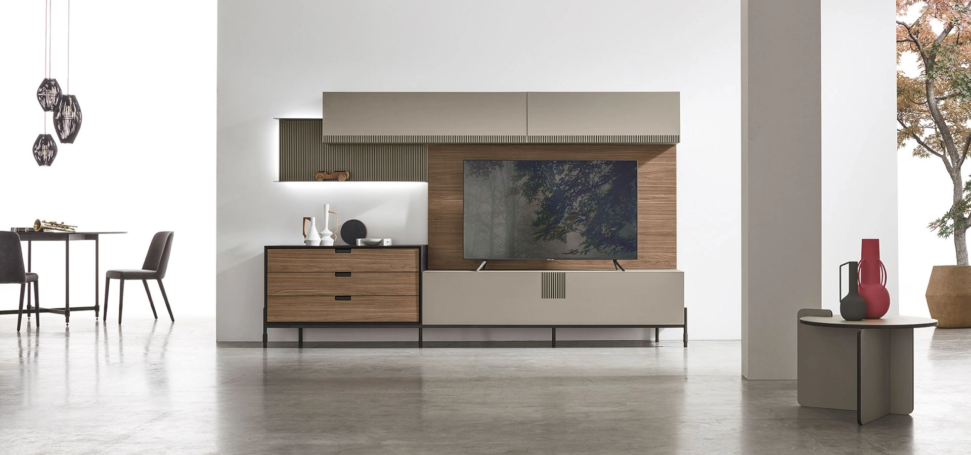 Quali materiali e finiture sono disponibili per la parete attrezzata TIME UNIT TI 104?La parete attrezzata TIME UNIT TI 104 di Tomasella offre diverse opzioni di materiali e finiture, come melaminico o laccati. Presso il nostro negozio, potrai visionare i campioni nella materioteca e scegliere la soluzione ideale per il tuo ambiente.