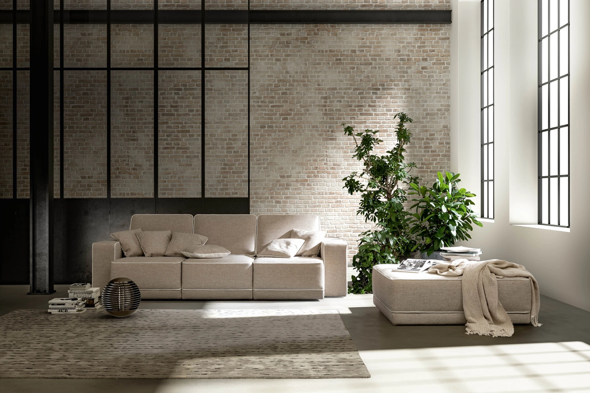 Divano dallo stile impattante con sedute a box addolcite dalla cromaticità chiara del bordino perimetrale