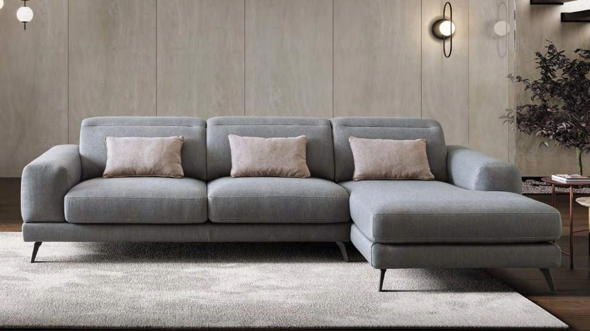Divano con penisola, moderno, con piedini in metallo o legno e imbottitura in poliuretano