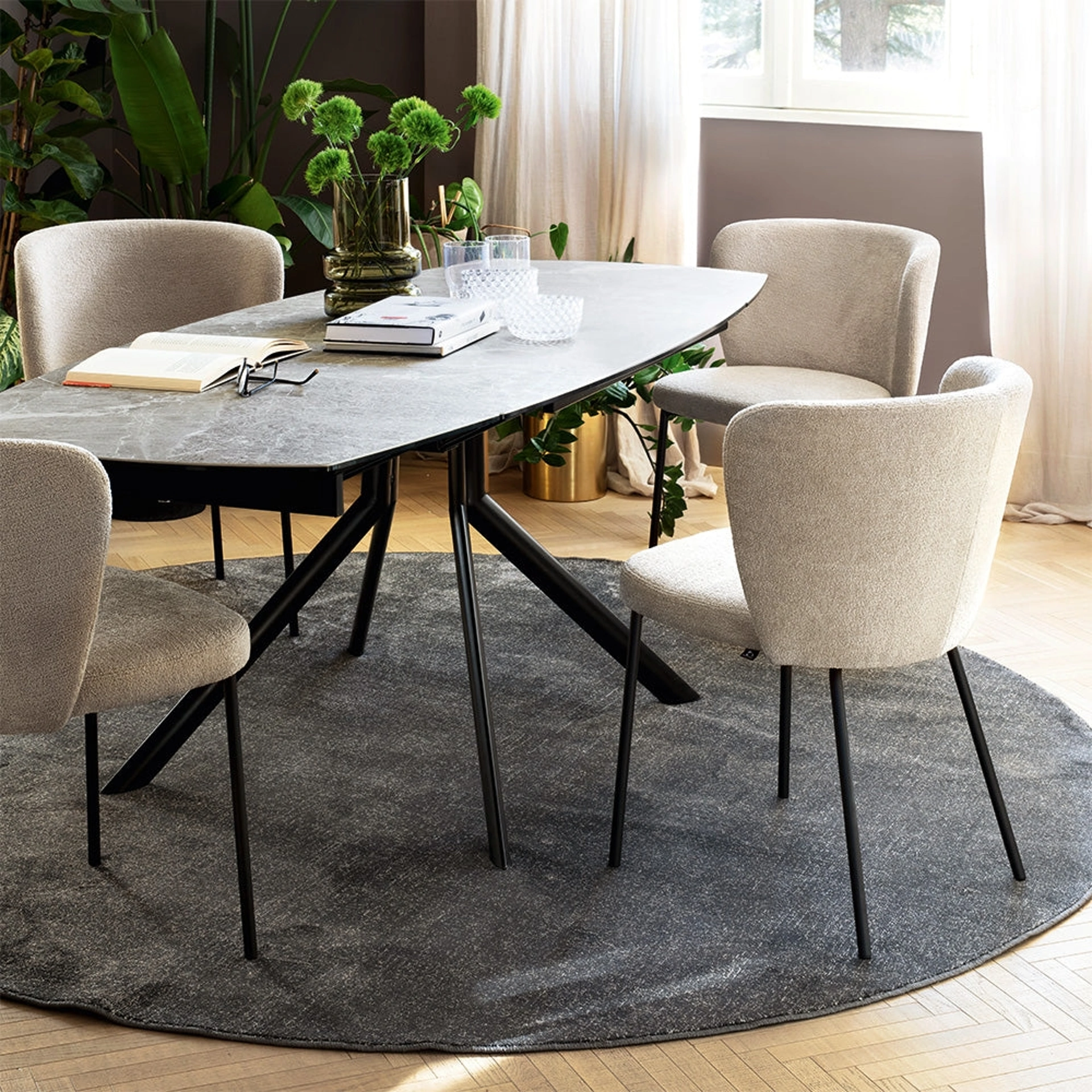 | Materiali: | Struttura in metallo verniciato, seduta e schienale imbottiti e rivestiti in tessuto Etienne (bouclé, 100% poliestere). |
