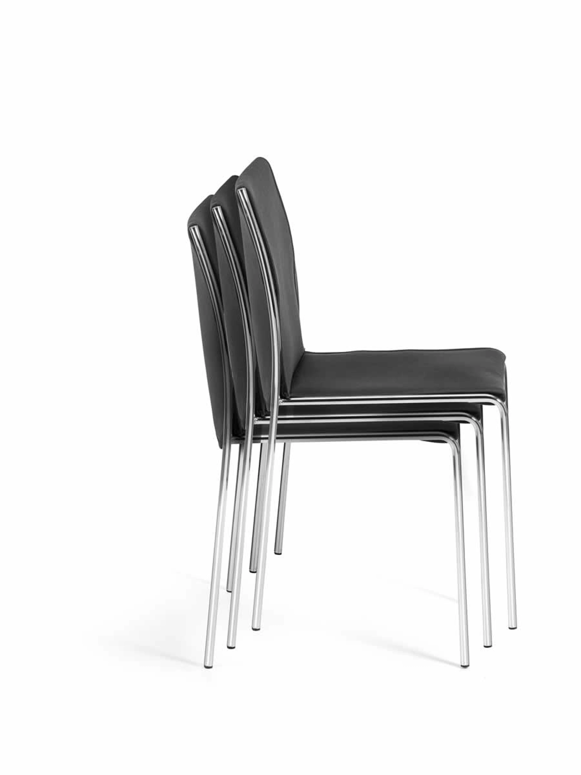 Sedia impilabile con struttura in acciaio e rivestimento a due cuscini in pelle nera