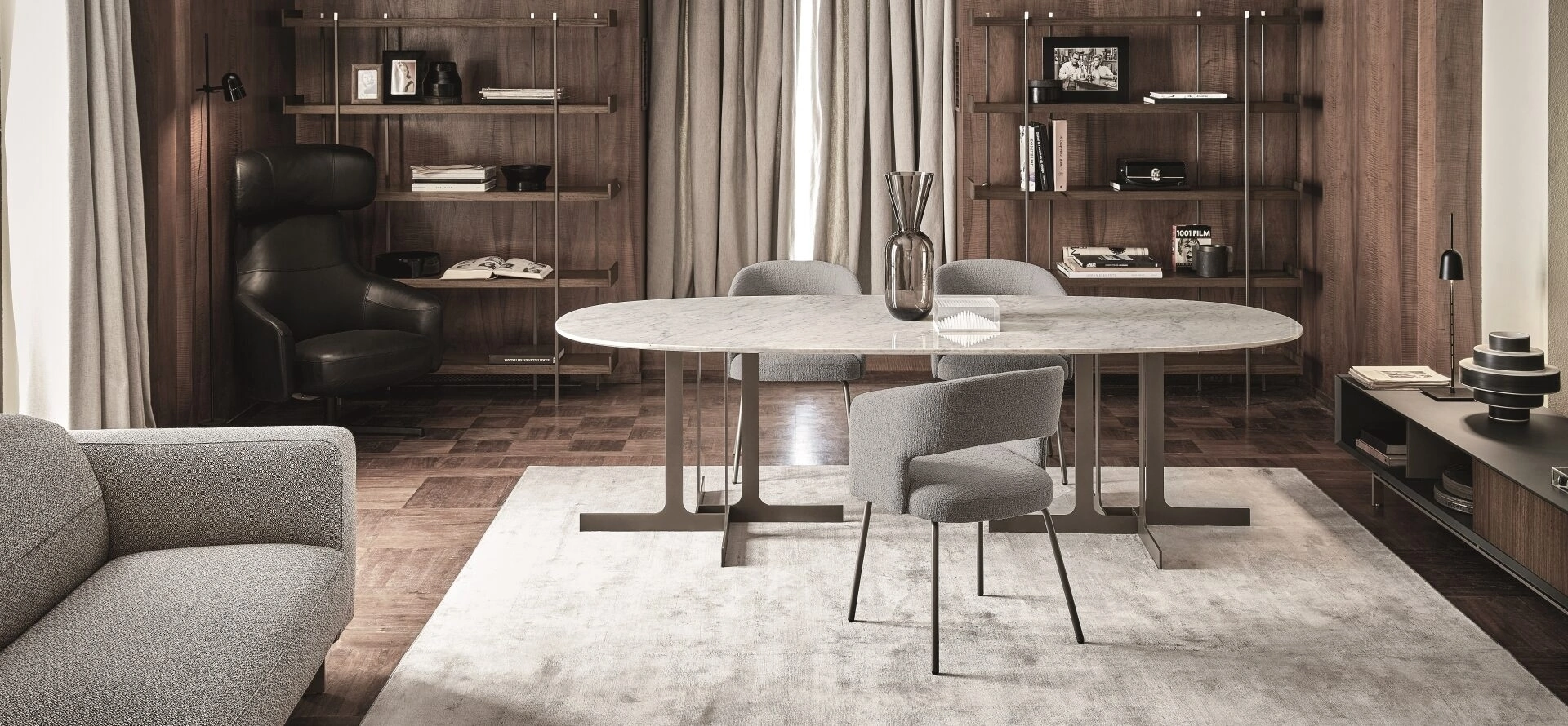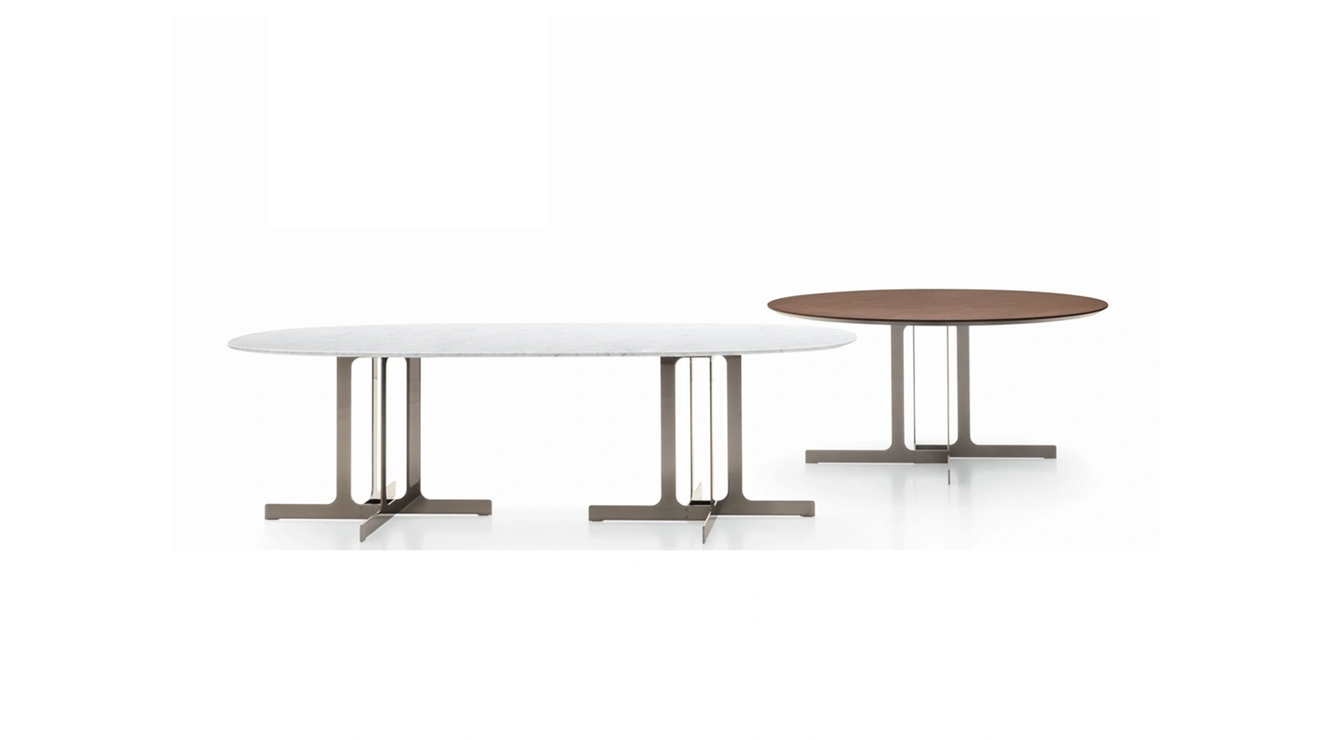 I tavoli della serie Nell di Ditre Italia si distinguono per un'estetica raffinata, evidenziata dal piano superiore disponibile in diverse finiture materiche come legno, marmo o vetro, che crea un interessante contrasto visivo. La base, realizzata con una struttura metallica di estrema leggerezza, presenta un design a lame sottili. Questa configurazione ingegneristica ne permette un impiego versatile, sia come elemento d'arredo singolo che in composizioni accoppiate. La gamma offre inoltre una varietà di geometrie, includendo varianti rotonde, ovali e rettangolari, per adattarsi a diverse esigenze progettuali. Un sistema costruttivo che assicura solidità e durata, offrendo soluzioni di arredo all'avanguardia.