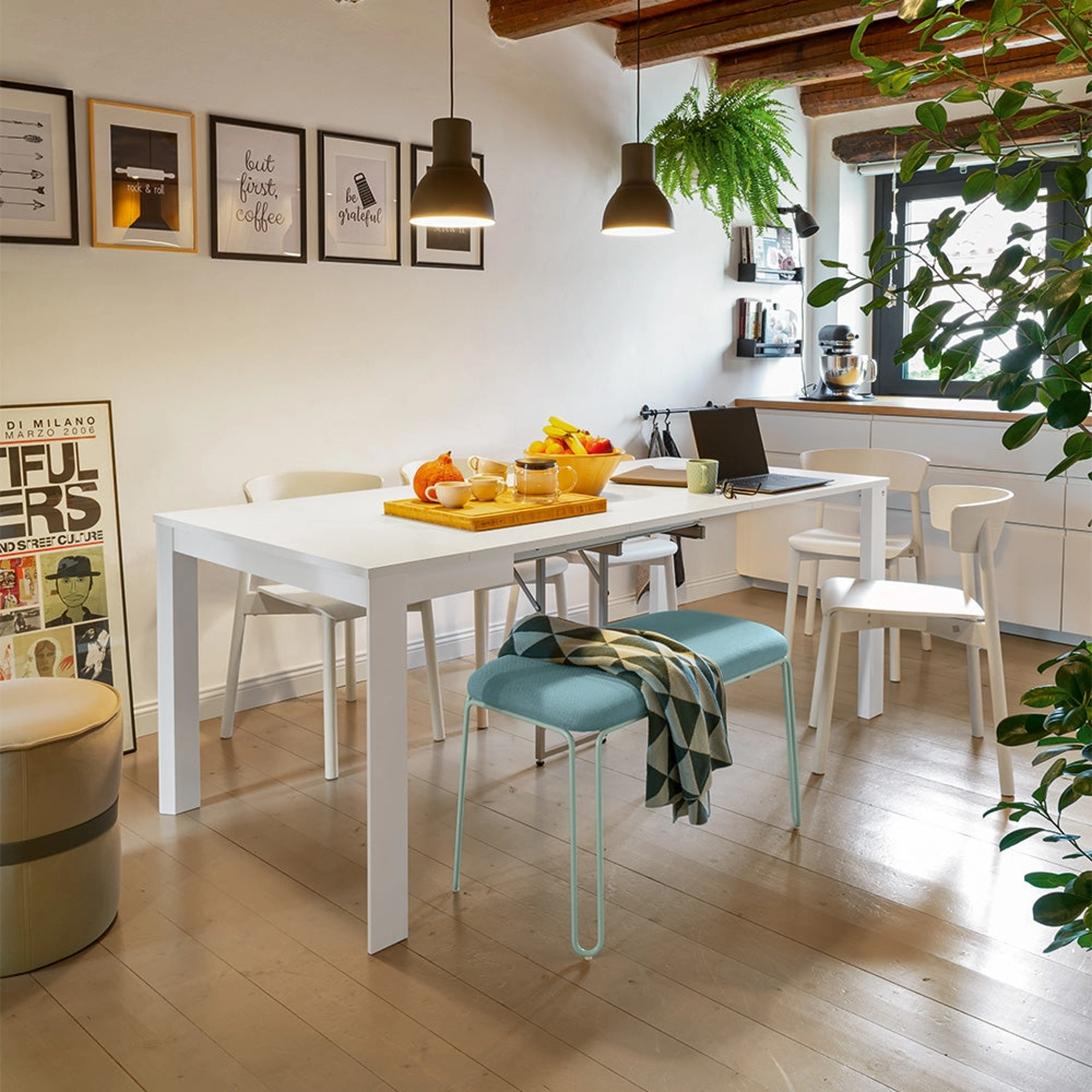 | Materiali: | Struttura in metallo, gambe e cassonetto in legno di faggio, piano e allunghe in legno nobilitato |
