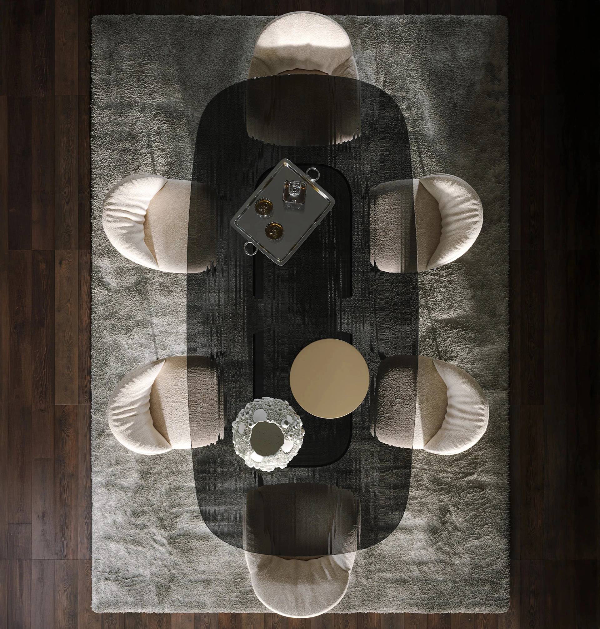 Il tavolo Millerighe di Tonin Casa incarna un equilibrio studiato tra solidità e leggerezza, grazie a una struttura in vetro fuso con lavorazione a righe che interagisce con la luce in modo dinamico. Le sue basi, elegantemente incurvate e simmetriche, supportano un piano a botte, evidenziando la robustezza del vetro e la fluidità del design. La finitura unica del vetro genera un gioco di riflessi sofisticato, conferendo un'estetica raffinata a qualsiasi ambiente. Questo pezzo d'arredo d'eccellenza offre un'integrazione stilistica perfetta, elevando ogni spazio con la sua presenza distintiva.