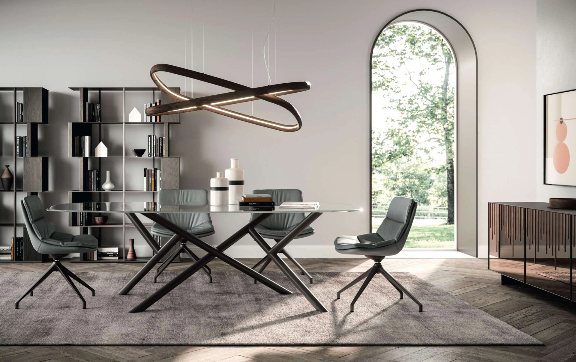 Il tavolo fisso Random di Ozzio si distingue per il suo design intrinsecamente scultoreo e le opzioni di piano in Cristallo, Ceramica o l'esclusivo Marble Glass, garantendo versatilità estetica. La base, una complessa struttura architettonica di tubi metallici, è disposta in un intreccio geometrico che cattura lo sguardo, con saldature e giunzioni sapientemente esposte per esaltarne il carattere industriale e la precisione costruttiva. Questo pezzo d'arredo incarna una fusione armoniosa tra l'innovazione del design e la robustezza dei materiali selezionati, assicurando una durabilità e uno stile che trascendono le tendenze.