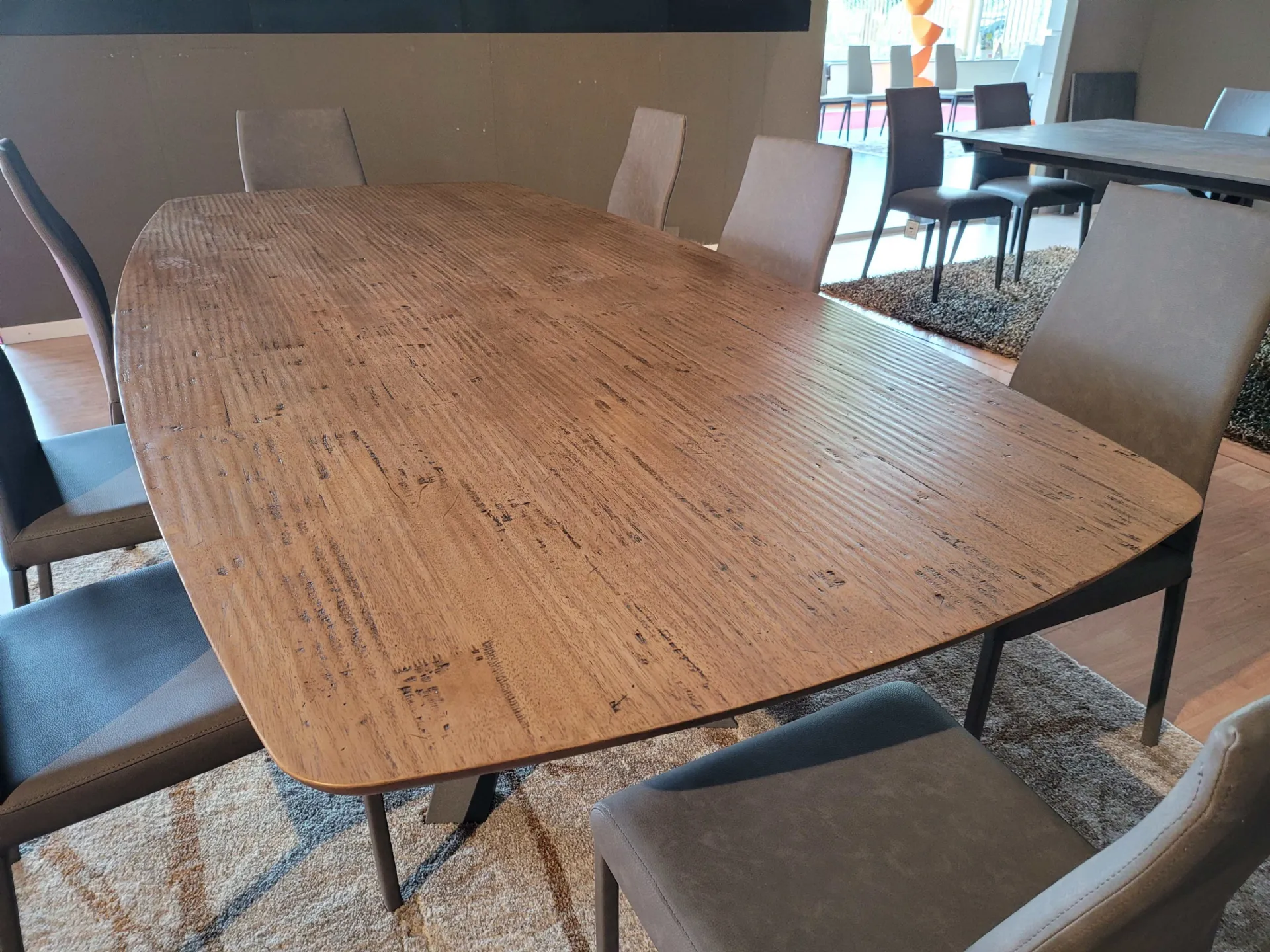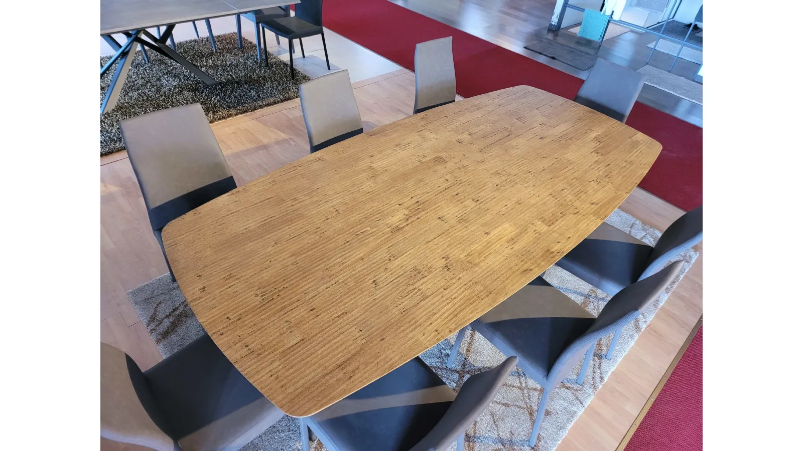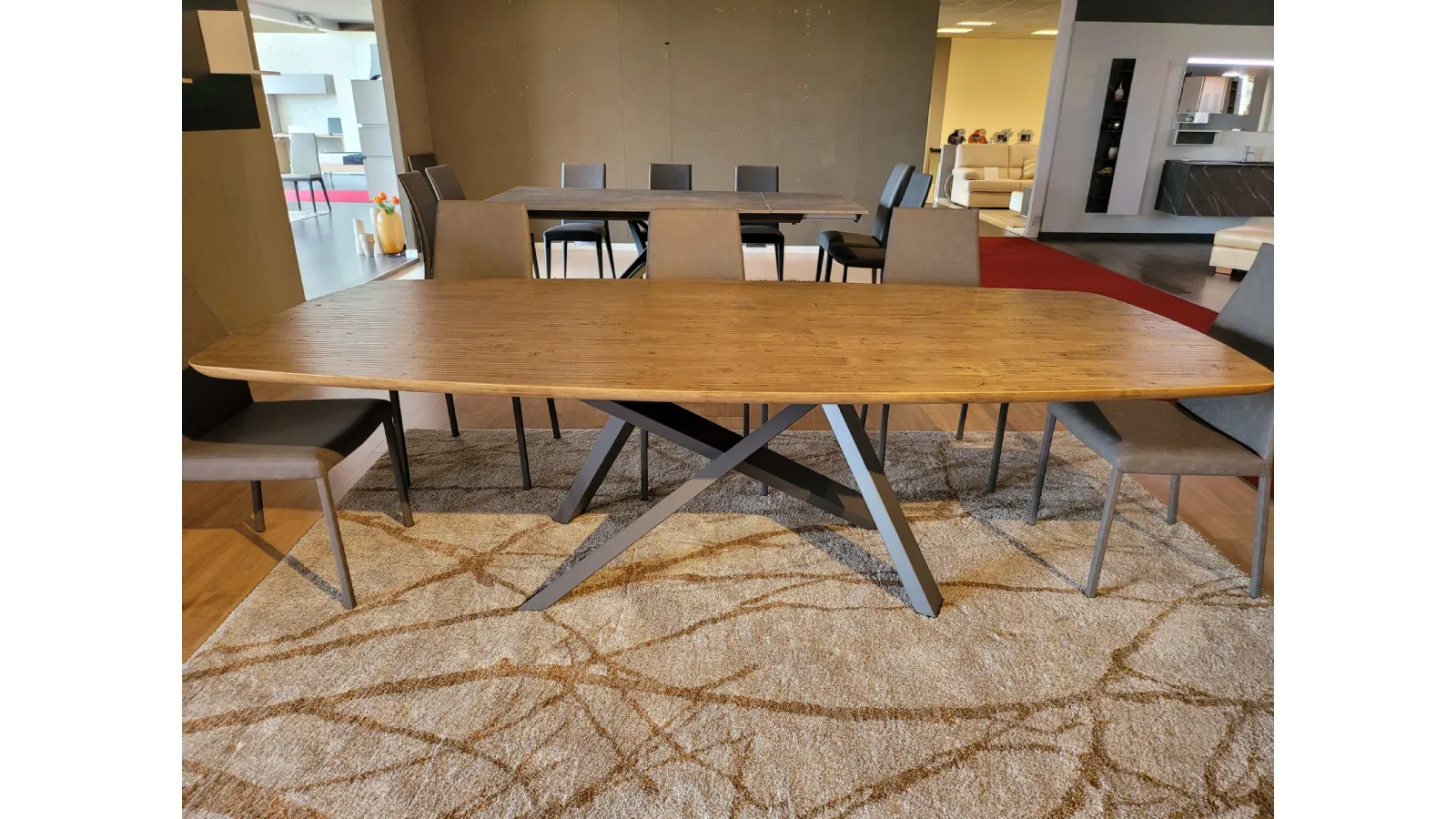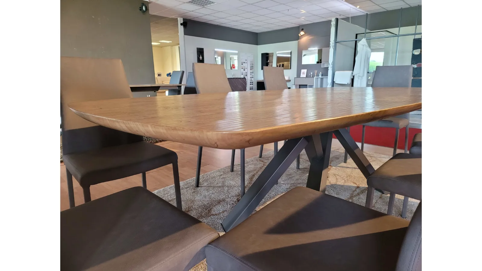 Simmetriche, eleganti e slanciate, le curve del piano rendono leggero anche l’importante spessore del legno massello. Il moderno bordo effetto saponetta accompagna lo sguardo sulle gambe super moderne a contrasto in metallo grafite.