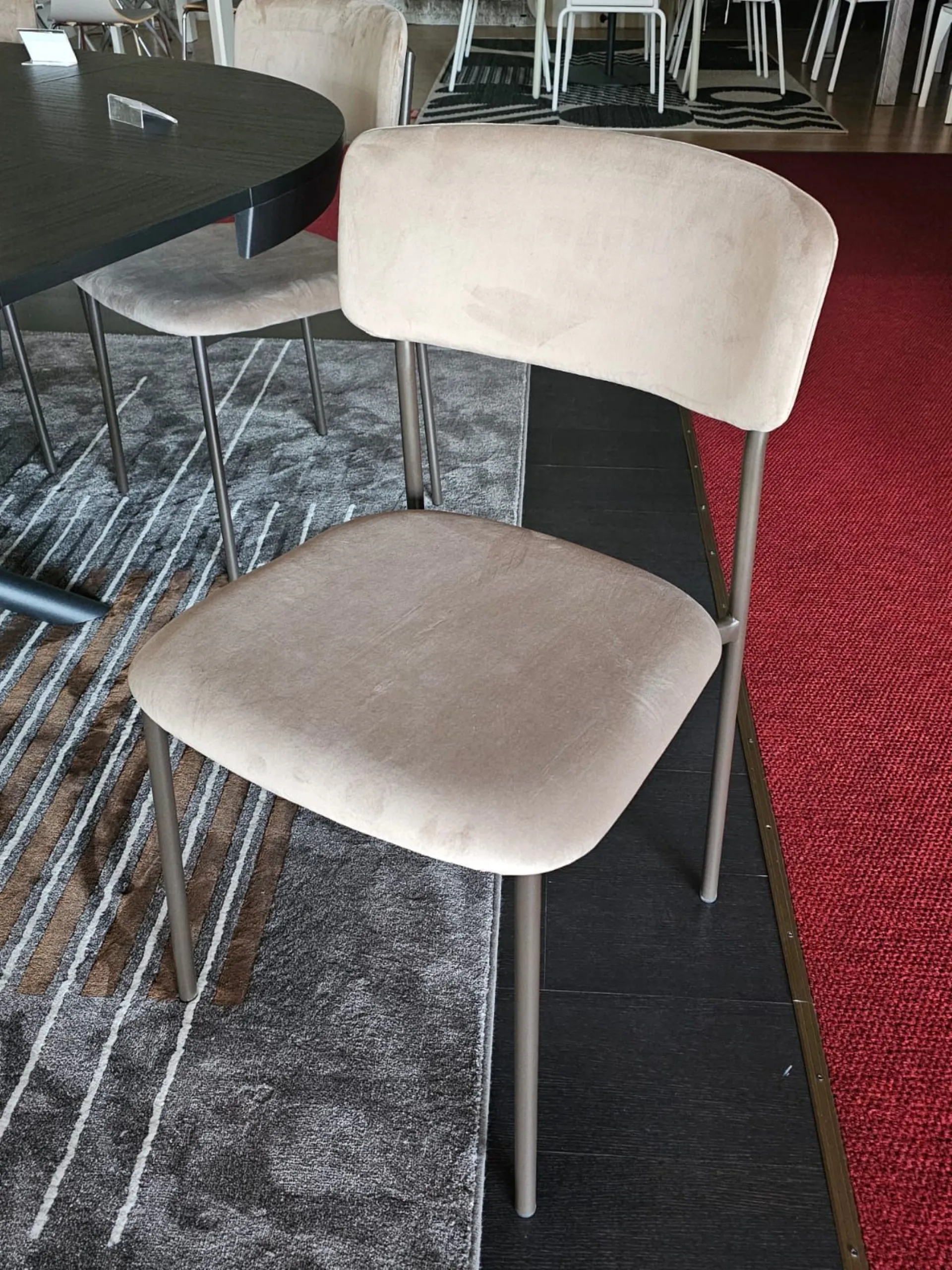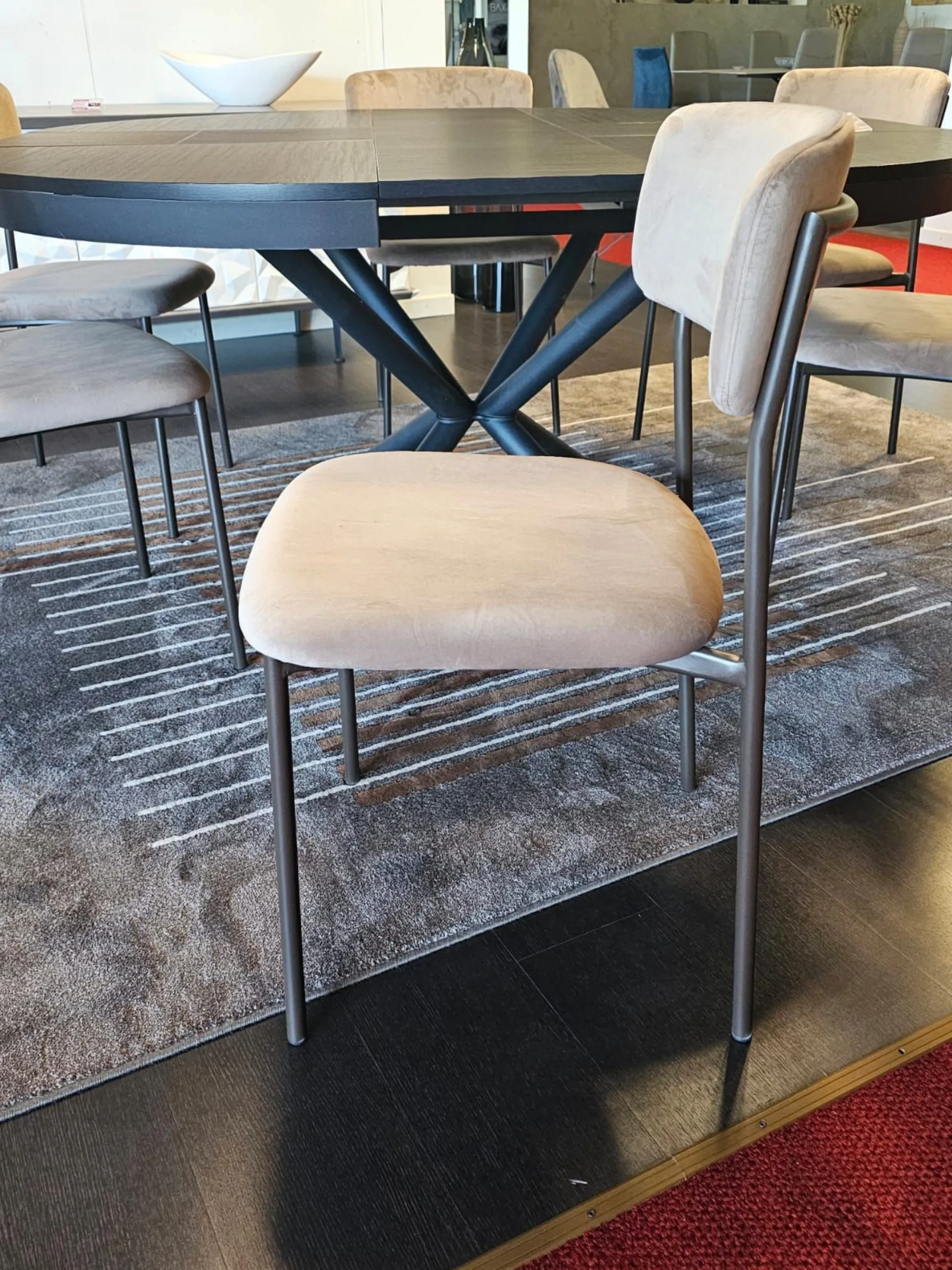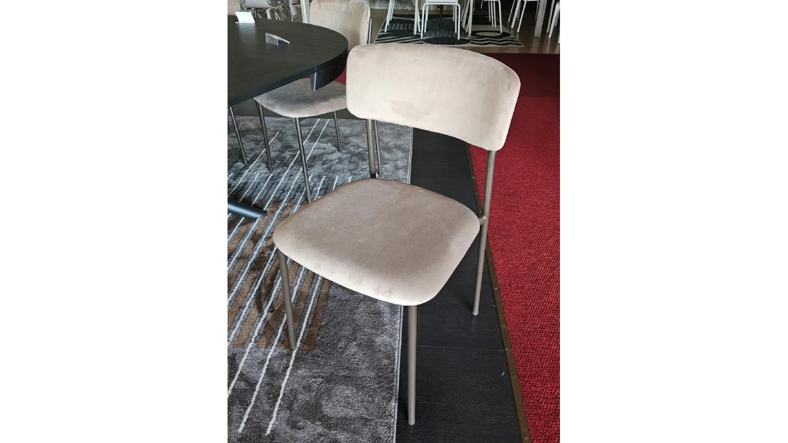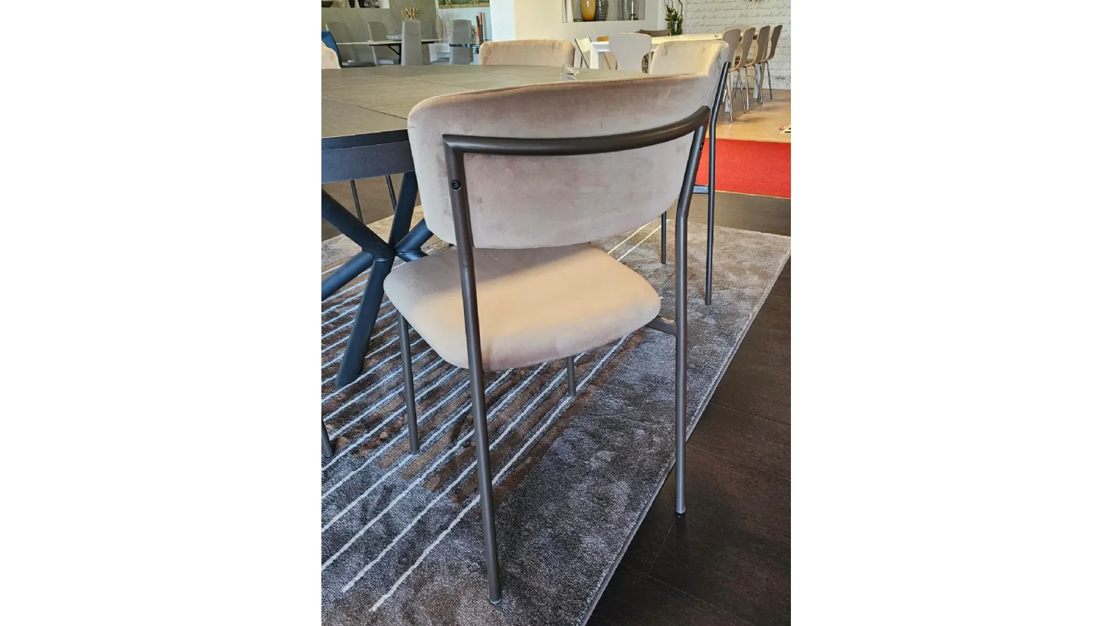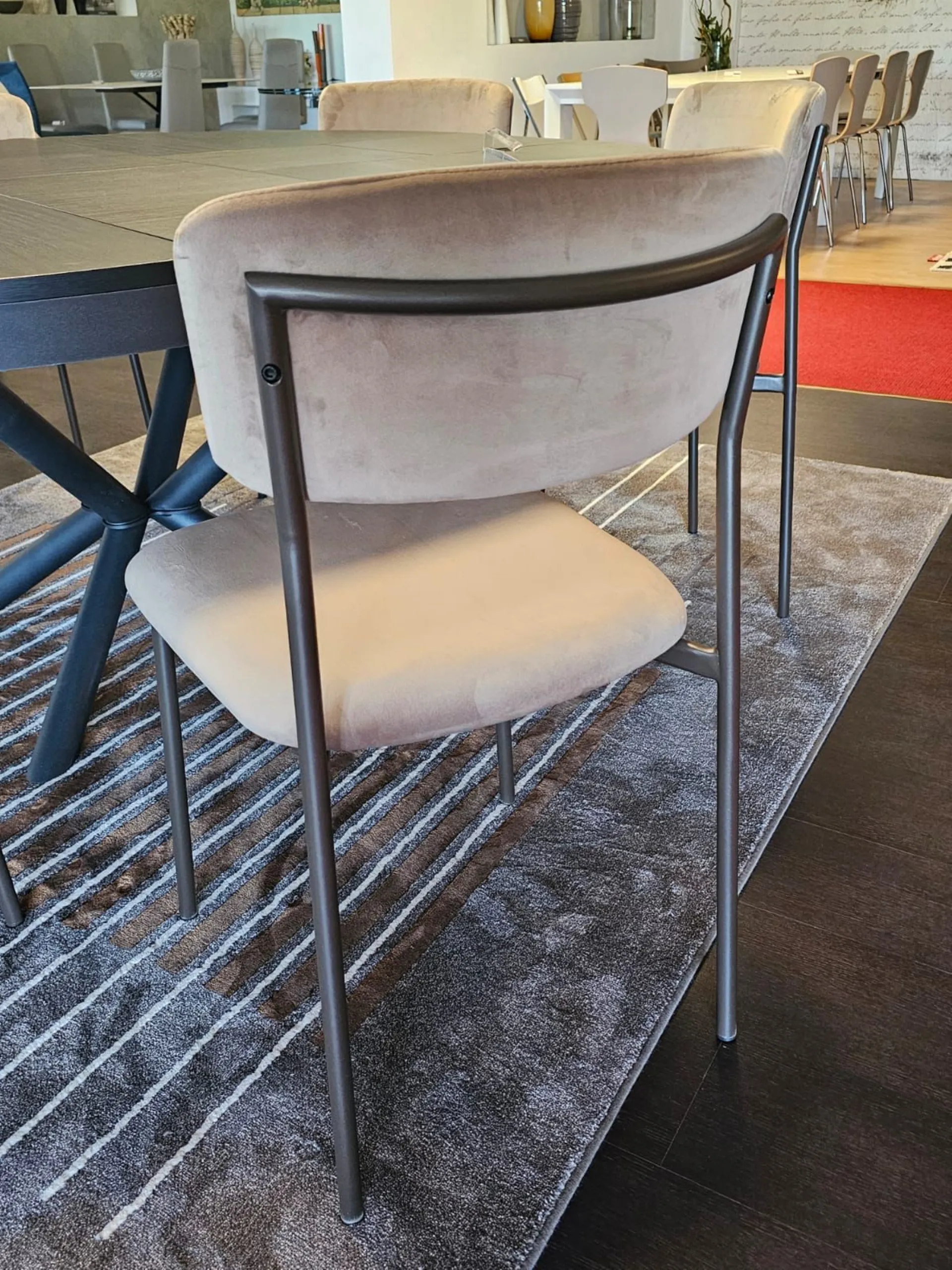 Sedia mod.AURA imbottita e rivestita in tessuto VE03 VELLUTO colore castoro e struttura in metallo MT98 VERNICIATO GRAFITE OPACO