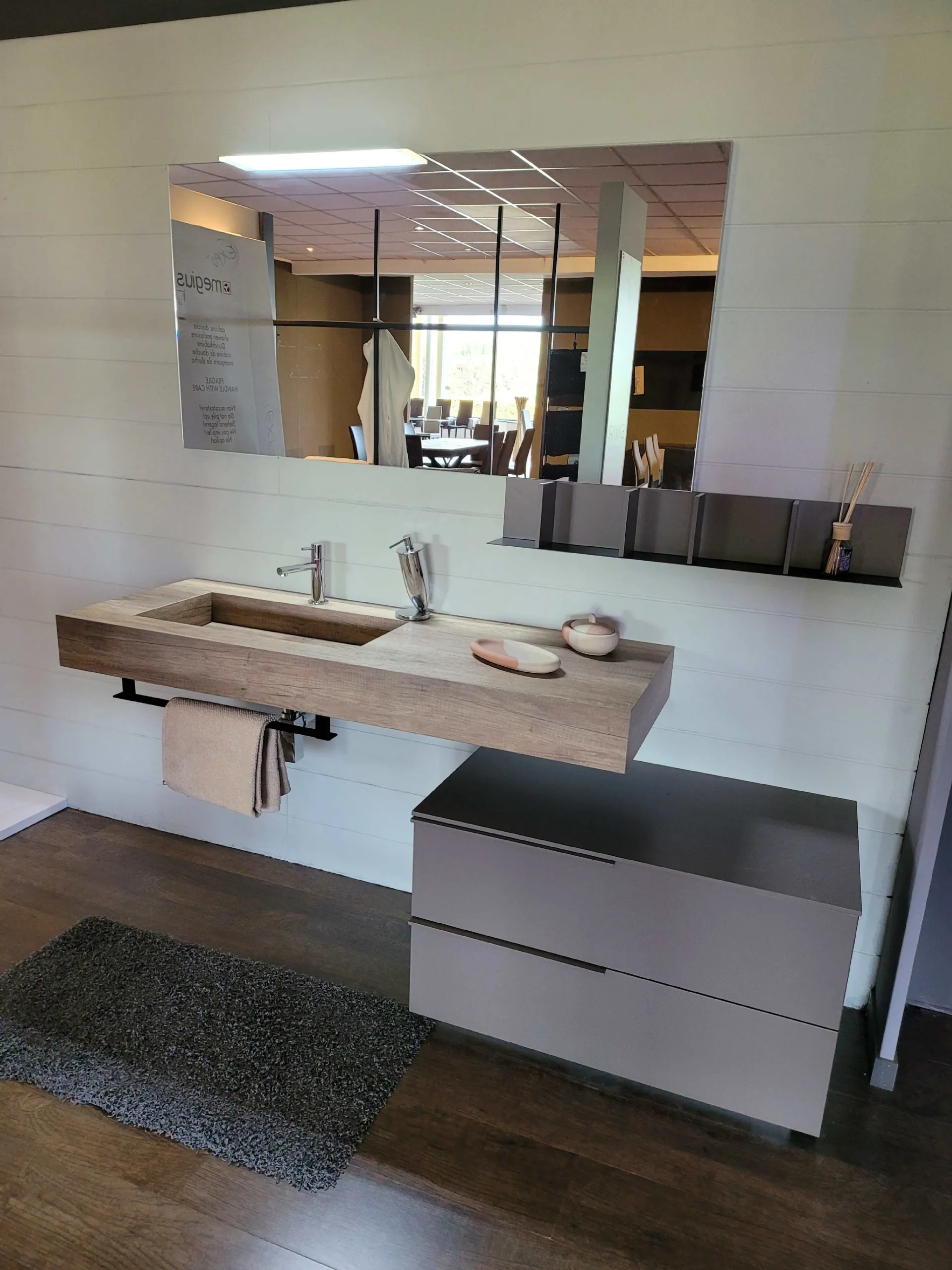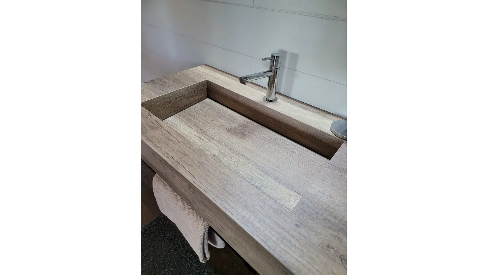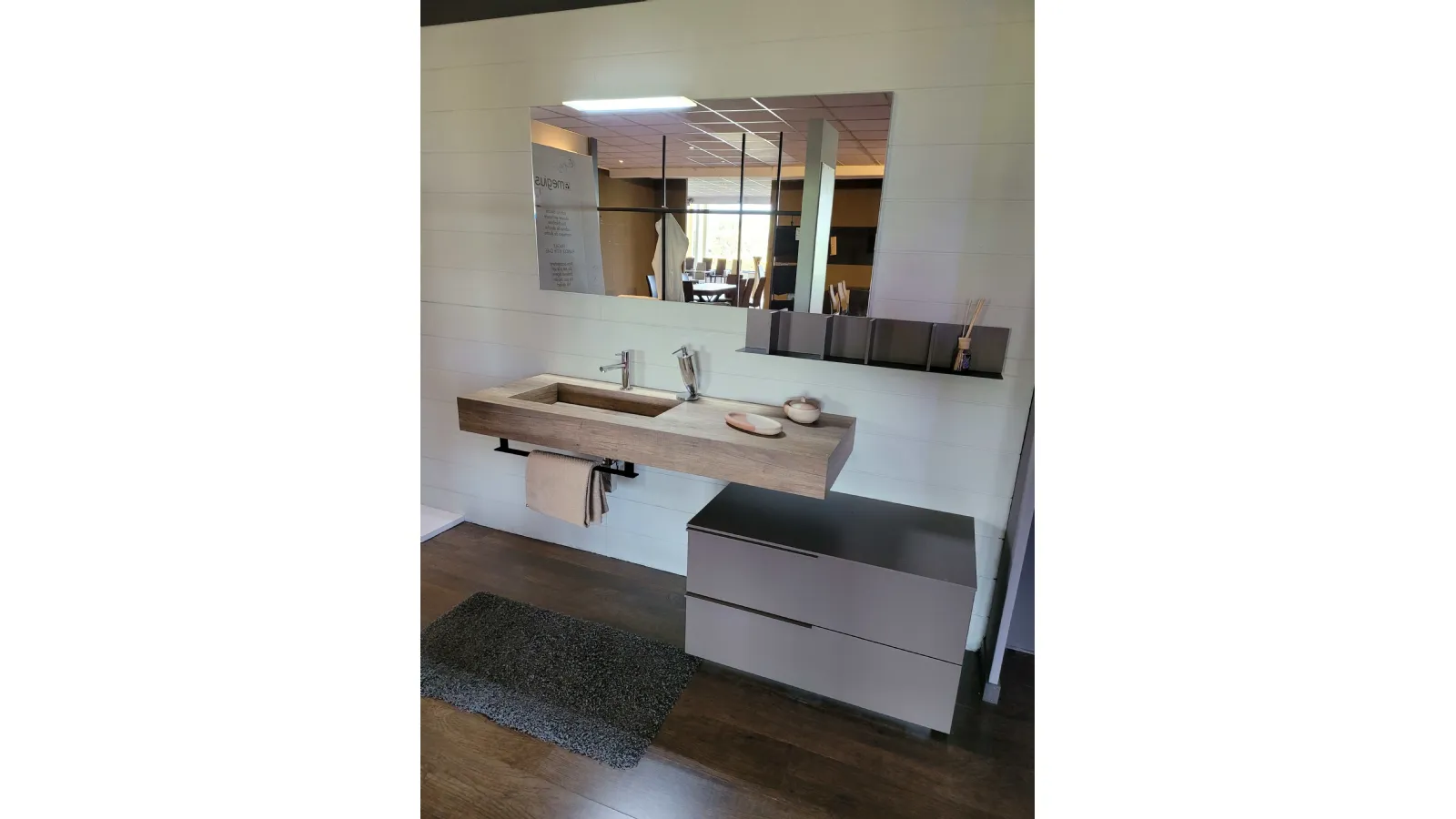Il top sospeso con vasca integrata è in finitura HPL rovere con portasalviette posto nella parte frontale ed inferiore. L’ampia specchiera posta sopra è illuminata da un faretto a LED che ricopre tutto il lato SX della stessa ma che illumina in modo perfetto tutto il mobile.
