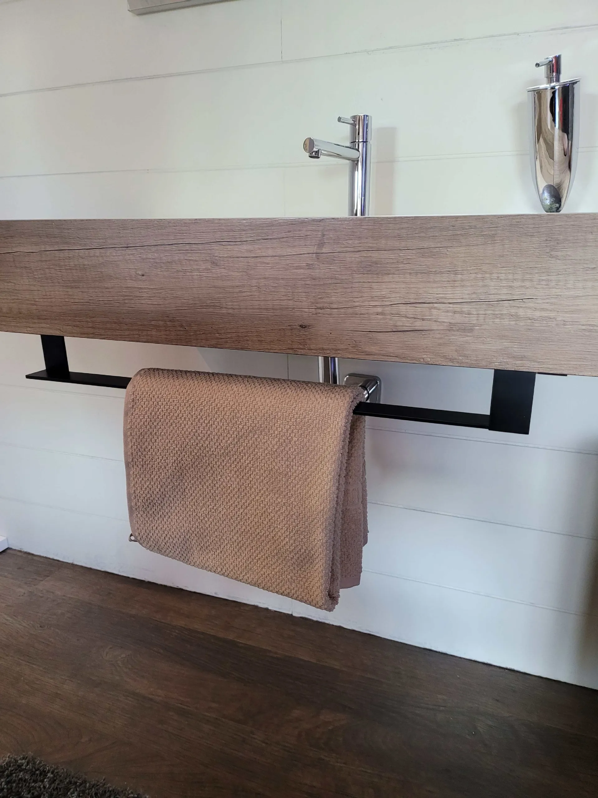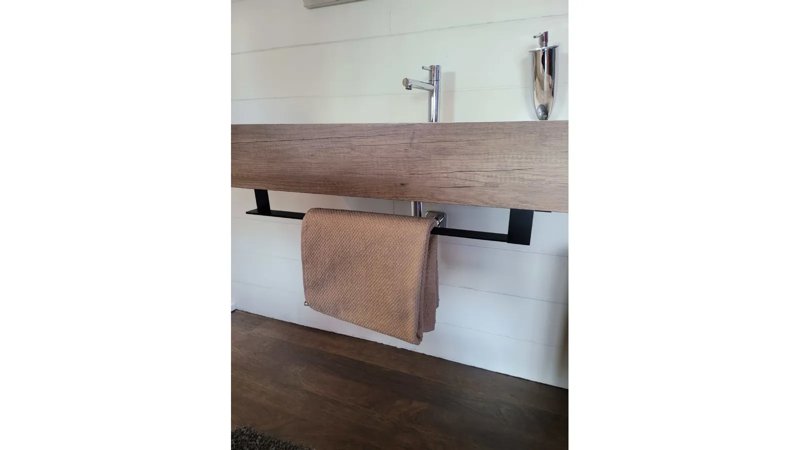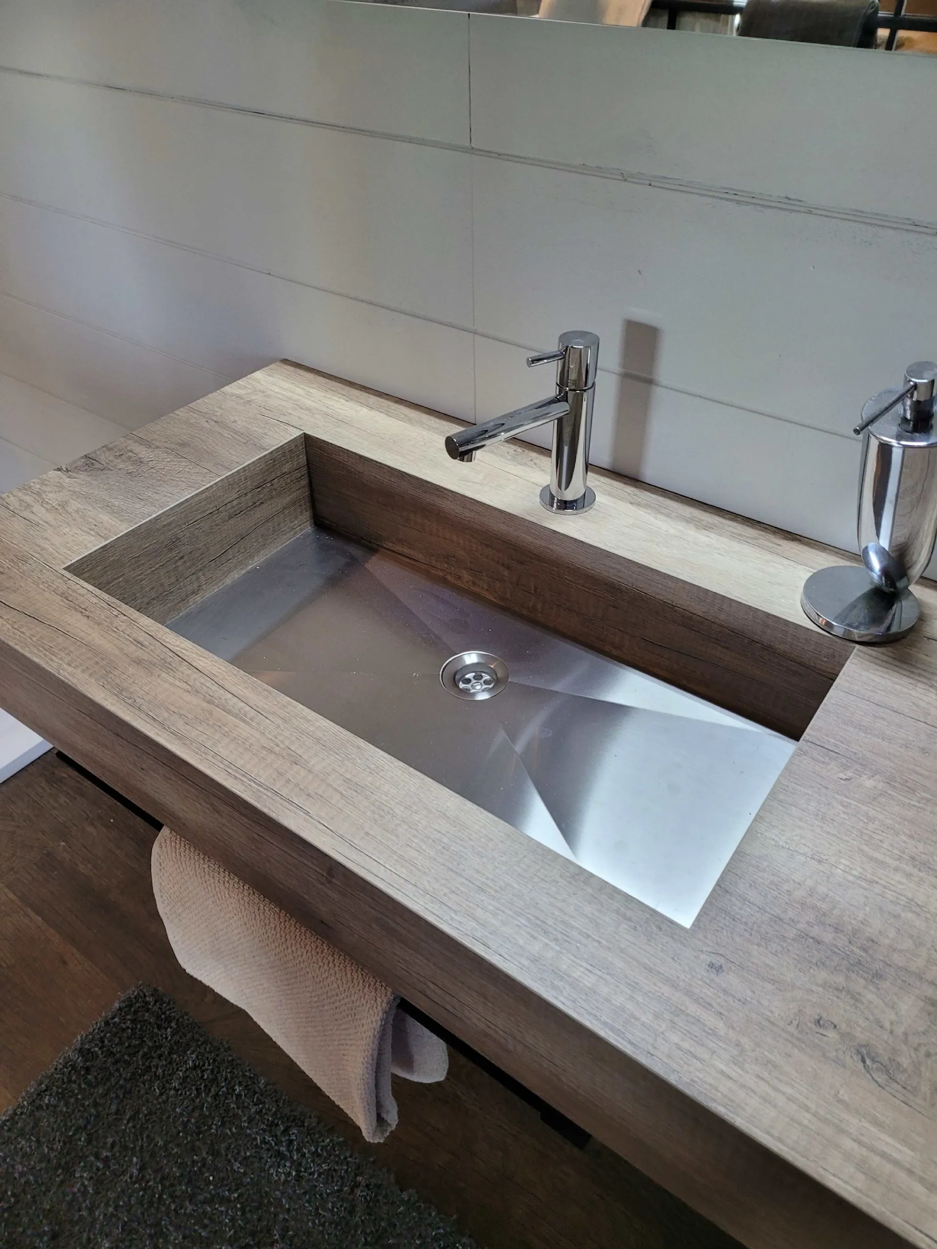 Il top sospeso con vasca integrata è in finitura HPL rovere con portasalviette posto nella parte frontale ed inferiore. L’ampia specchiera posta sopra è illuminata da un faretto a LED che ricopre tutto il lato SX della stessa ma che illumina in modo perfetto tutto il mobile.