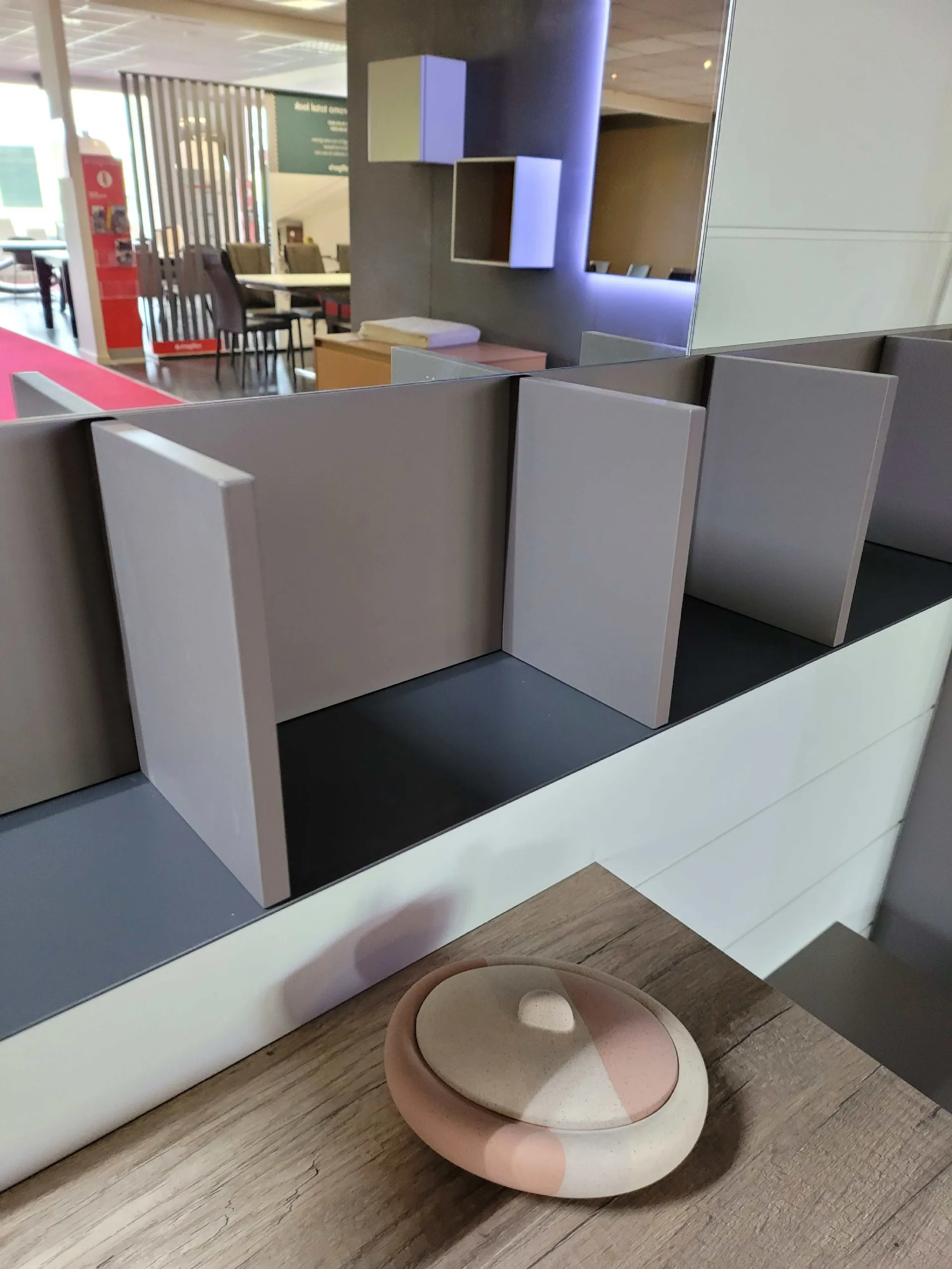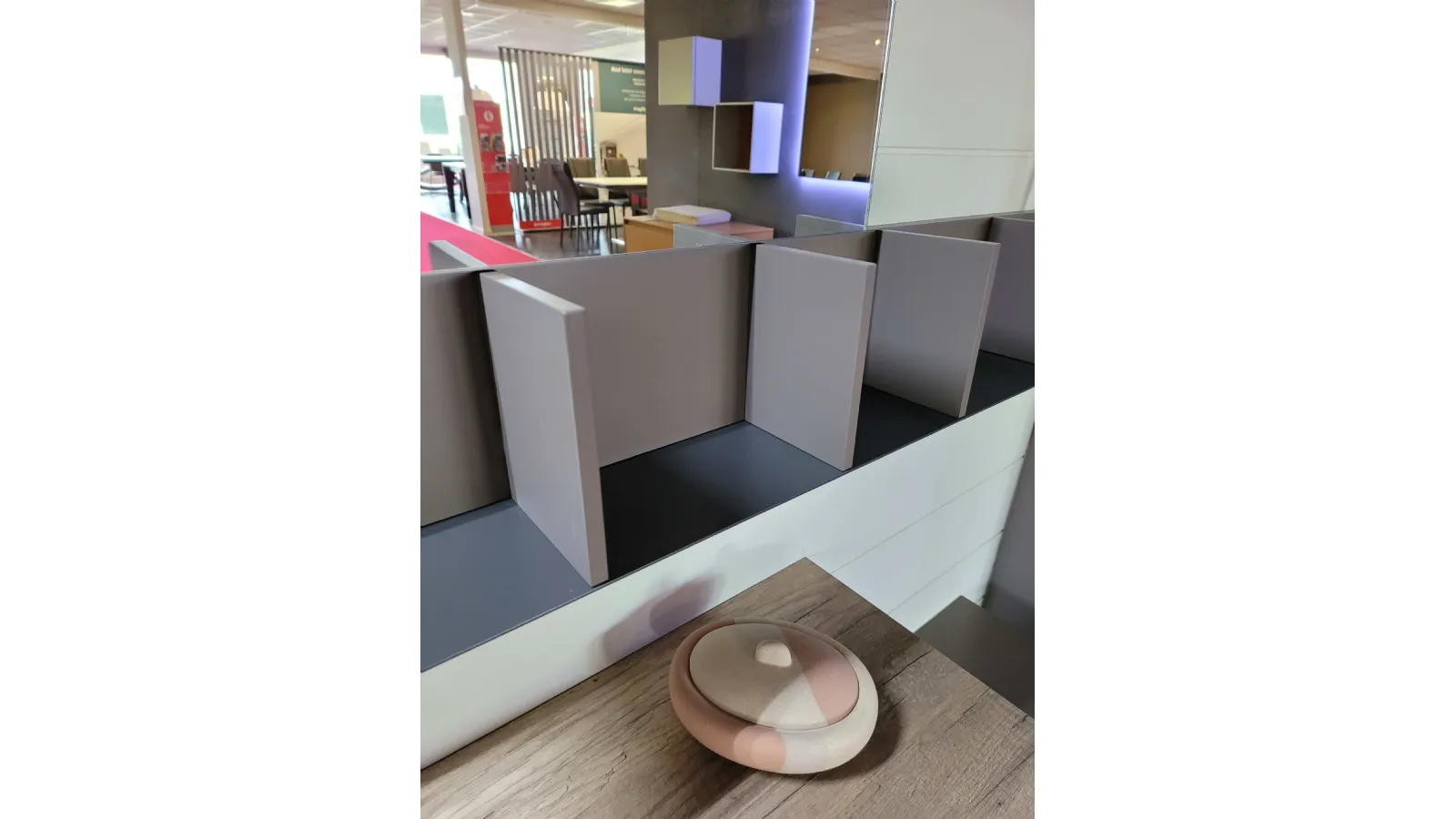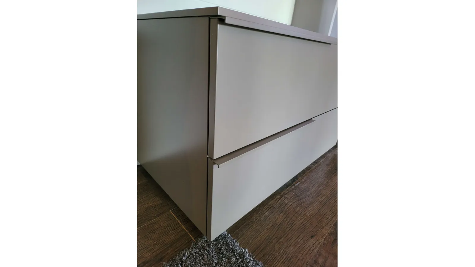 Mobile bagno sospeso mod.LINE con base a terra a due cassetti in finitura laccato opaco colore argilla opaco. L’apertura dei cassetti avviene tramite la comoda maniglia parziale presente sul frontale.