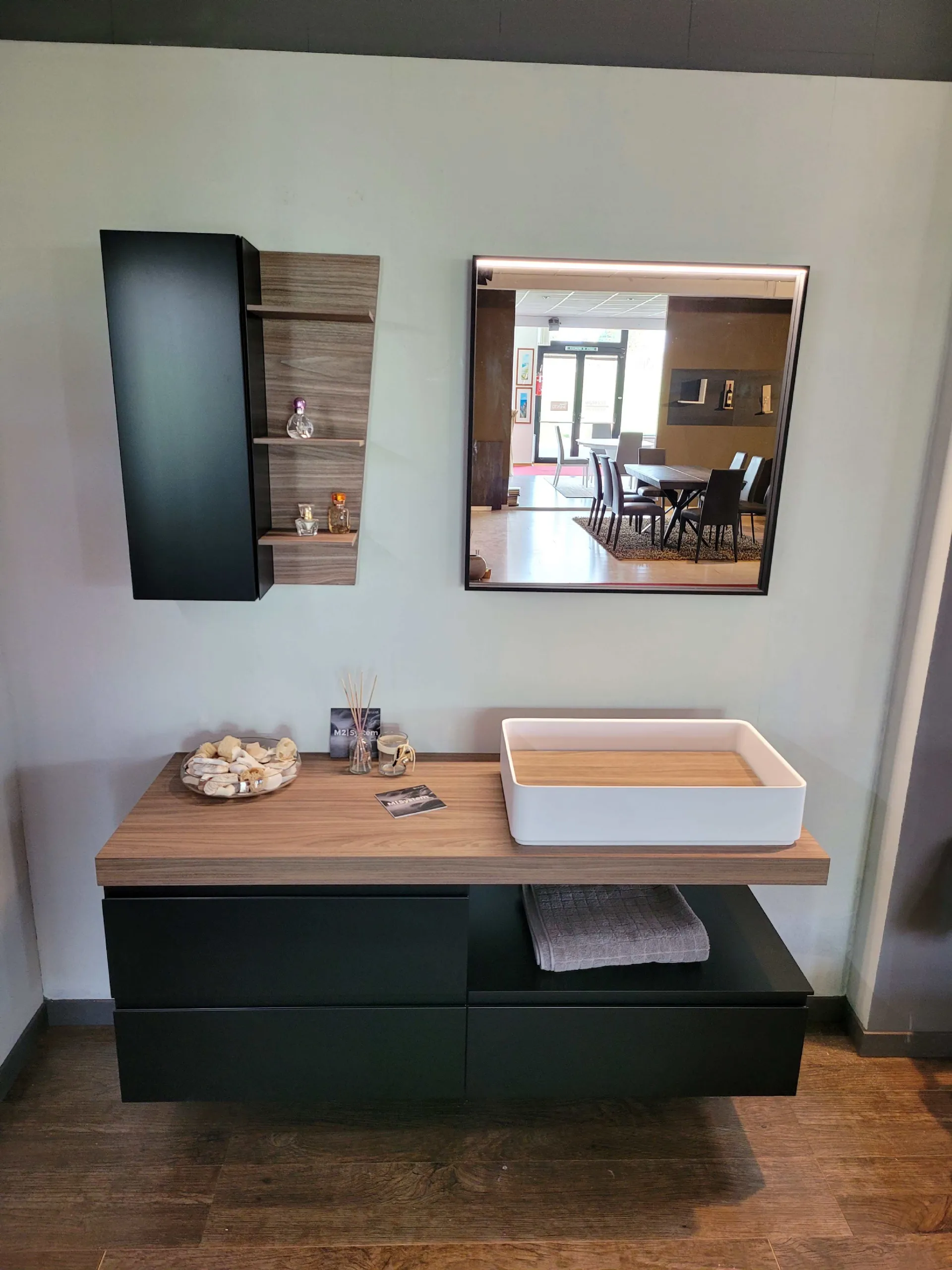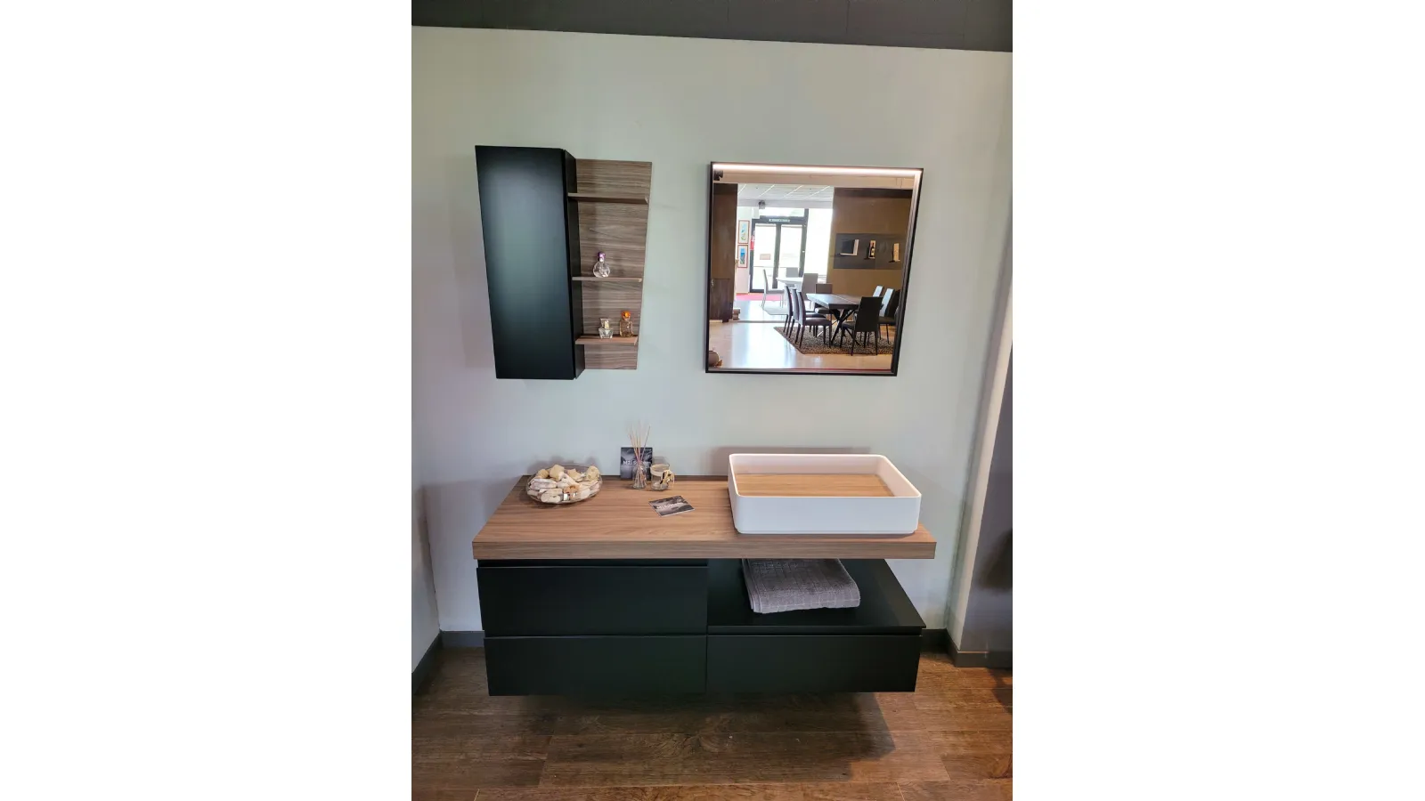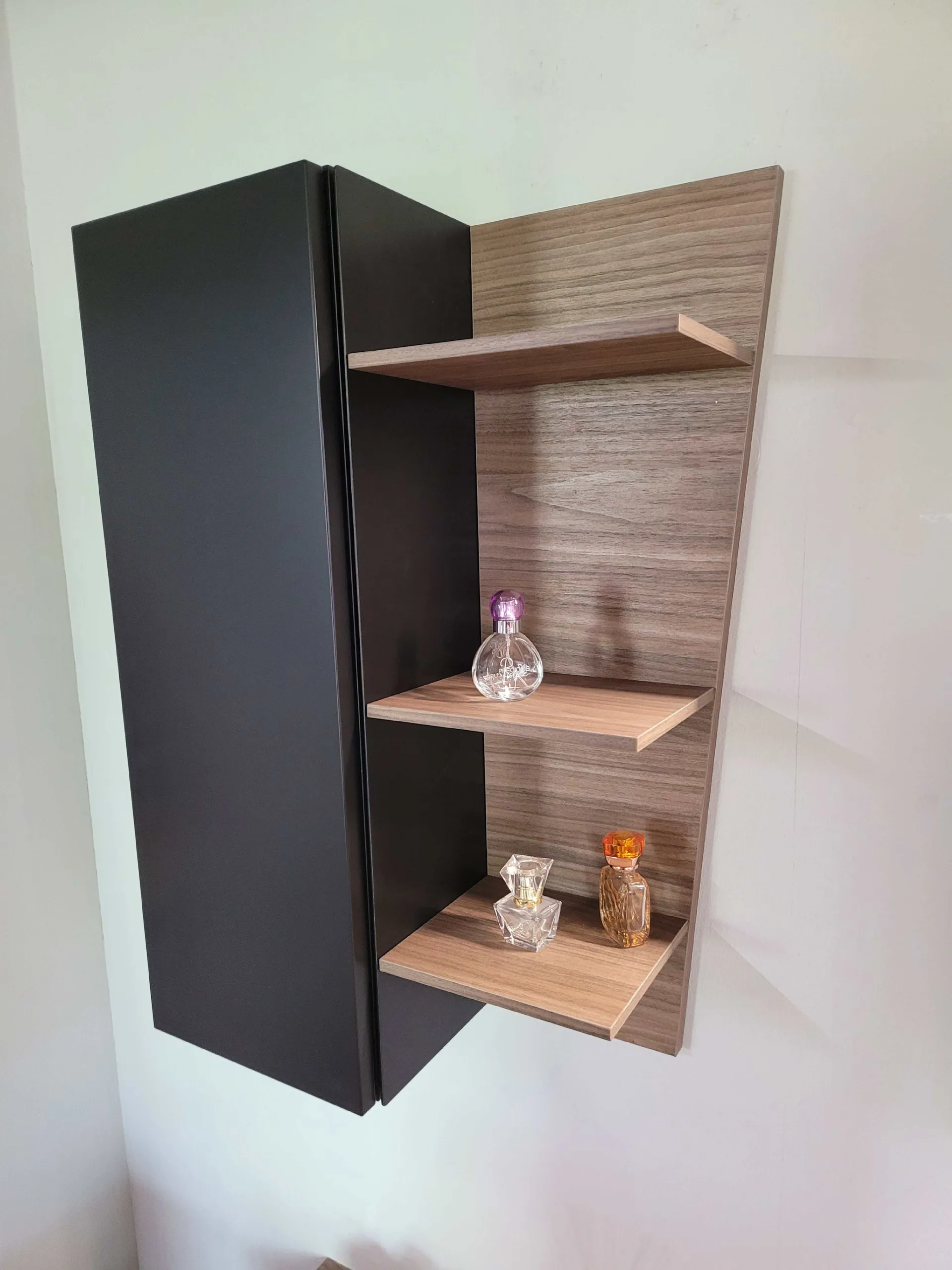 Mobile bagno sospeso mod.SURF con frontali in finitura laccato opaco colore nero e top in finitura nobilitato Noce Canaletto. L’apertura dei tre cestoni è facilitata grazie alla maniglia a gola. Il top del bagno è caratterizzato da un forte spessore di ben 6 cm con appoggiato sulla parte destra il lavello molto ampio in Tekorlux colore bianco opaco con la tavoletta di copertura scarico in Nob.Noce canaletto. Il comodo pensile con anta battente ha al suo interno un ripiano interno in vetro ed esternamente è in finitura laccato colore nero come le basi. Lateralmente trova posto un pensile a giorno molto originale in quanto è tagliato in diagonale donando movimento alla composizione. La specchiera ha la cornice in alluminio colore nero opaco nella stessa colorazione delle basi sospese e con barra a LED superiore