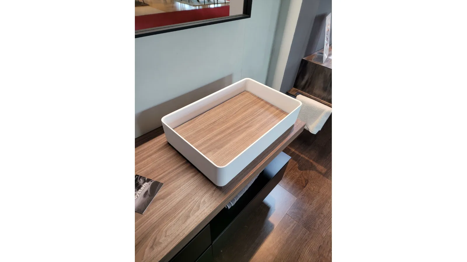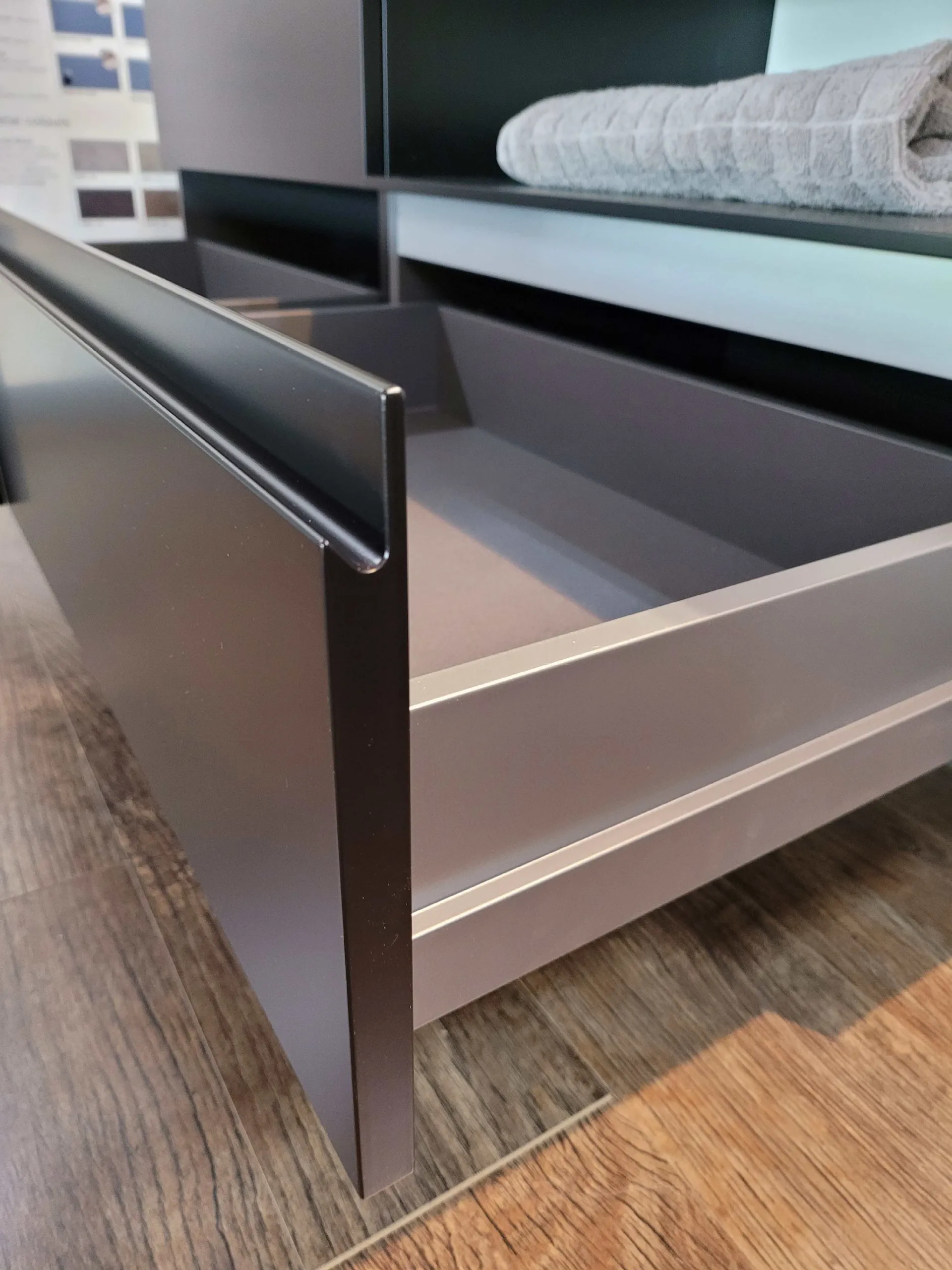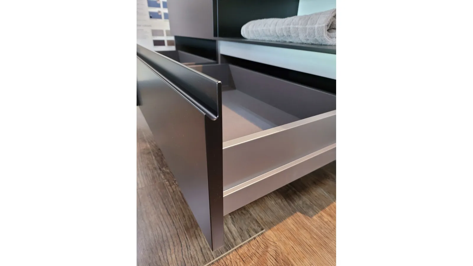 Mobile bagno sospeso mod.SURF con frontali in finitura laccato opaco colore nero e top in finitura nobilitato Noce Canaletto. L’apertura dei tre cestoni è facilitata grazie alla maniglia a gola. Il top del bagno è caratterizzato da un forte spessore di ben 6 cm con appoggiato sulla parte destra il lavello molto ampio in Tekorlux colore bianco opaco con la tavoletta di copertura scarico in Nob.Noce canaletto. Il comodo pensile con anta battente ha al suo interno un ripiano interno in vetro ed esternamente è in finitura laccato colore nero come le basi. Lateralmente trova posto un pensile a giorno molto originale in quanto è tagliato in diagonale donando movimento alla composizione. La specchiera ha la cornice in alluminio colore nero opaco nella stessa colorazione delle basi sospese e con barra a LED superiore