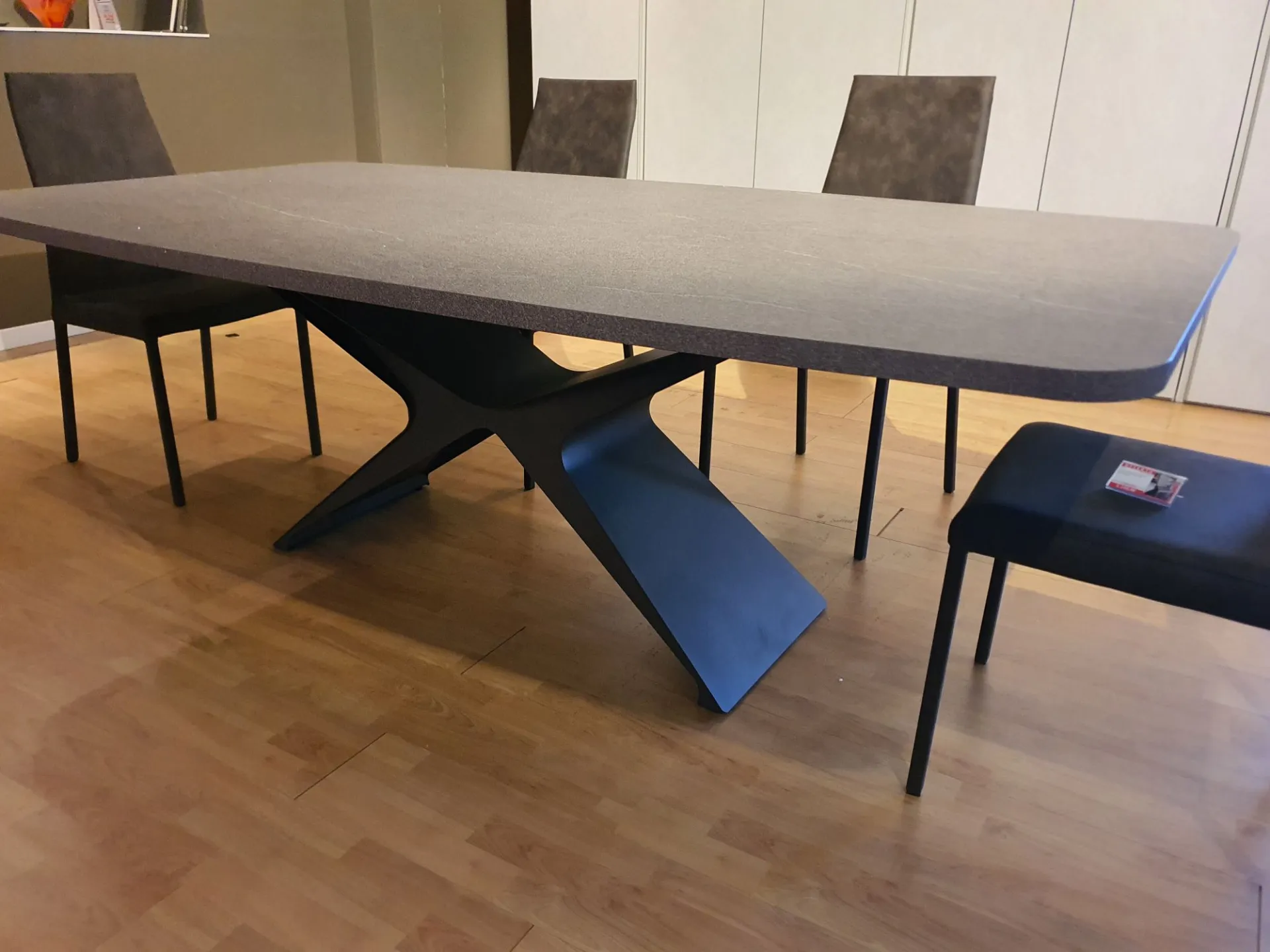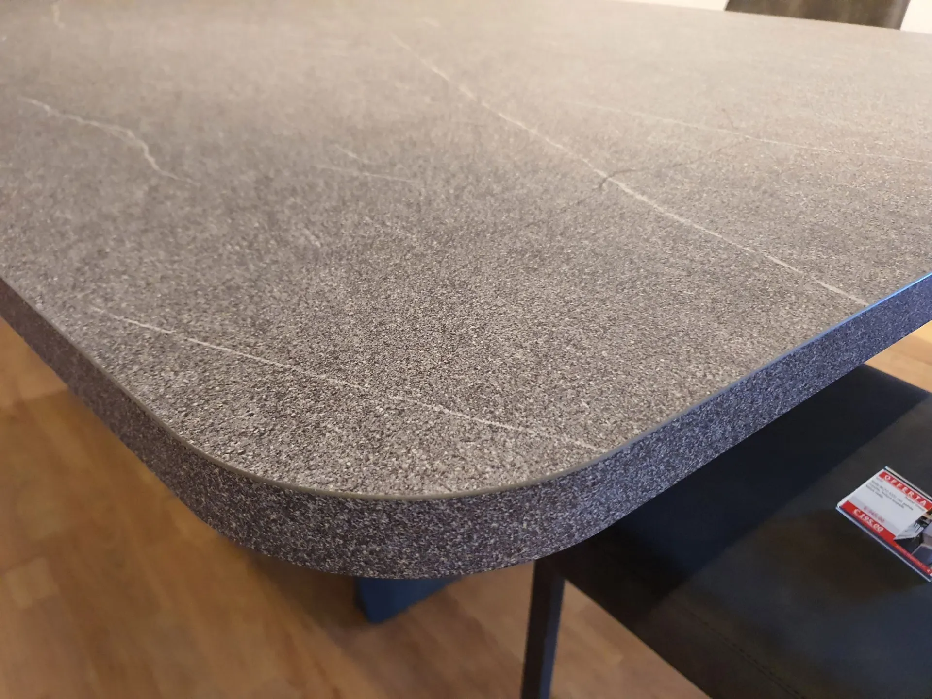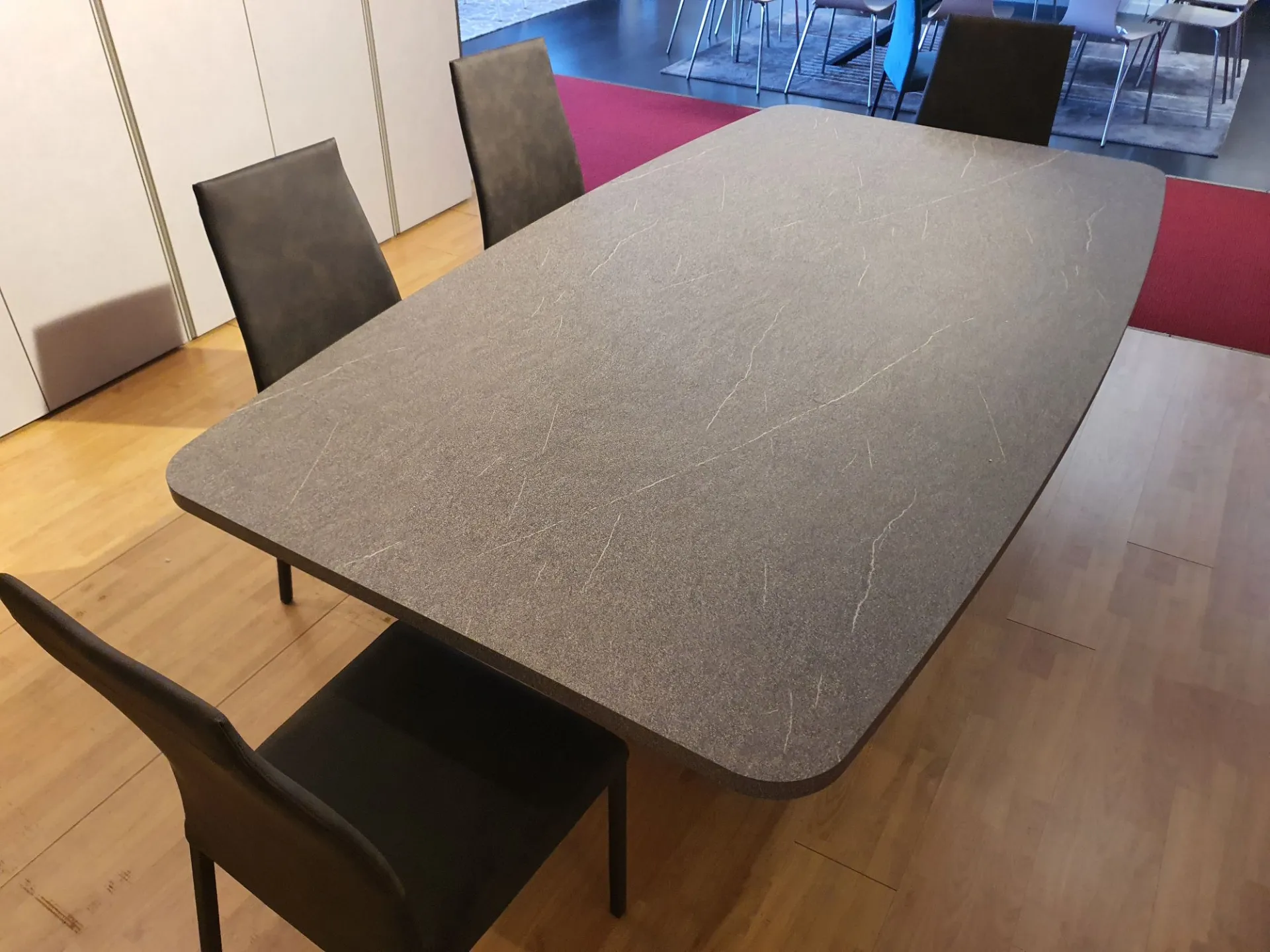 Tavolo fisso mod.BALTIK con piano sagomato a botte in finitura nobilitato materico PIETRA PIASENTINA SCURA e basamento centrale in metallo verniciato antracite