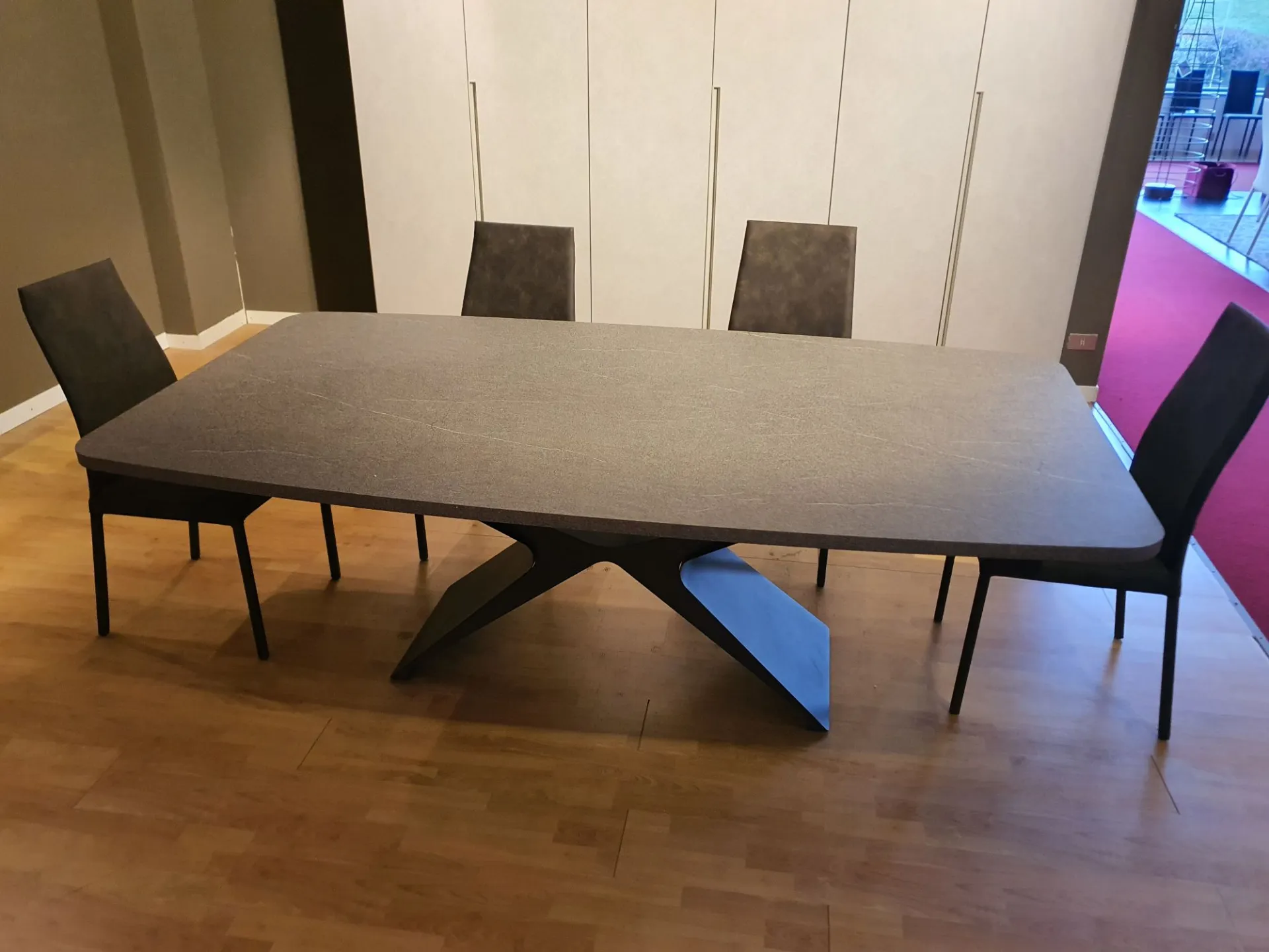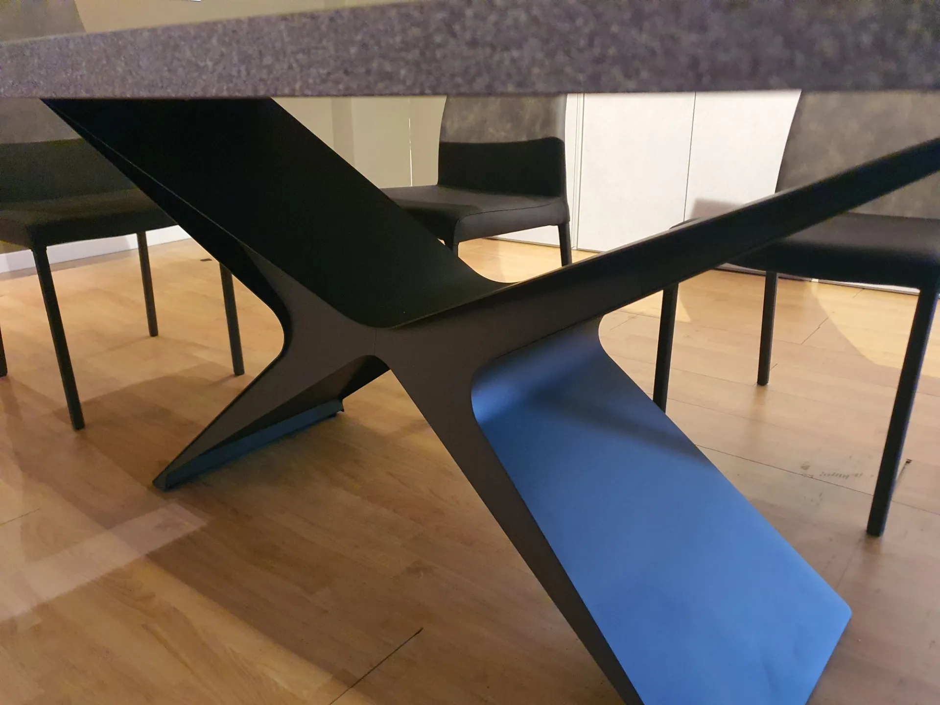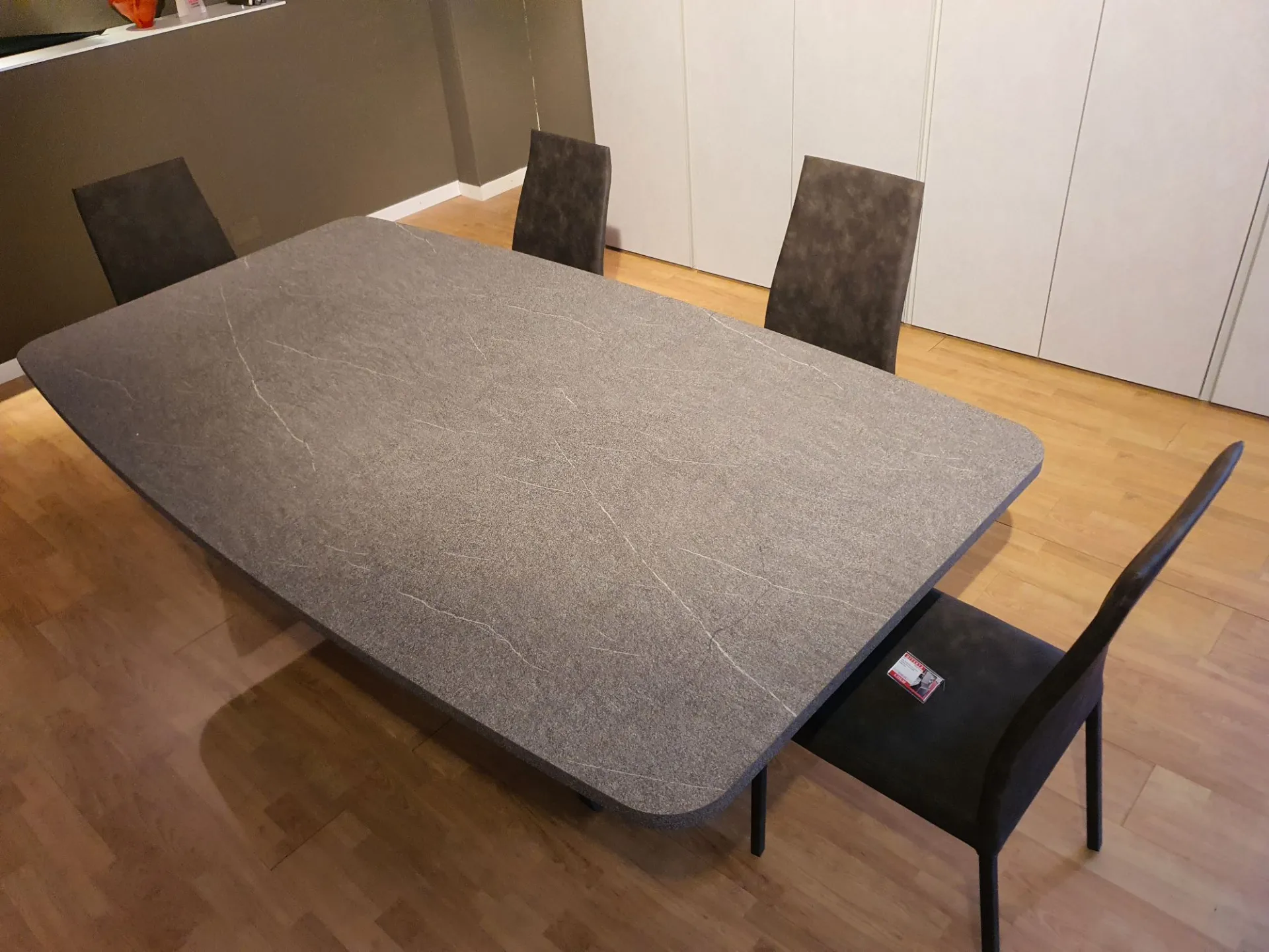 Tavolo fisso mod.BALTIK con piano sagomato a botte in finitura nobilitato materico PIETRA PIASENTINA SCURA e basamento centrale in metallo verniciato antracite
