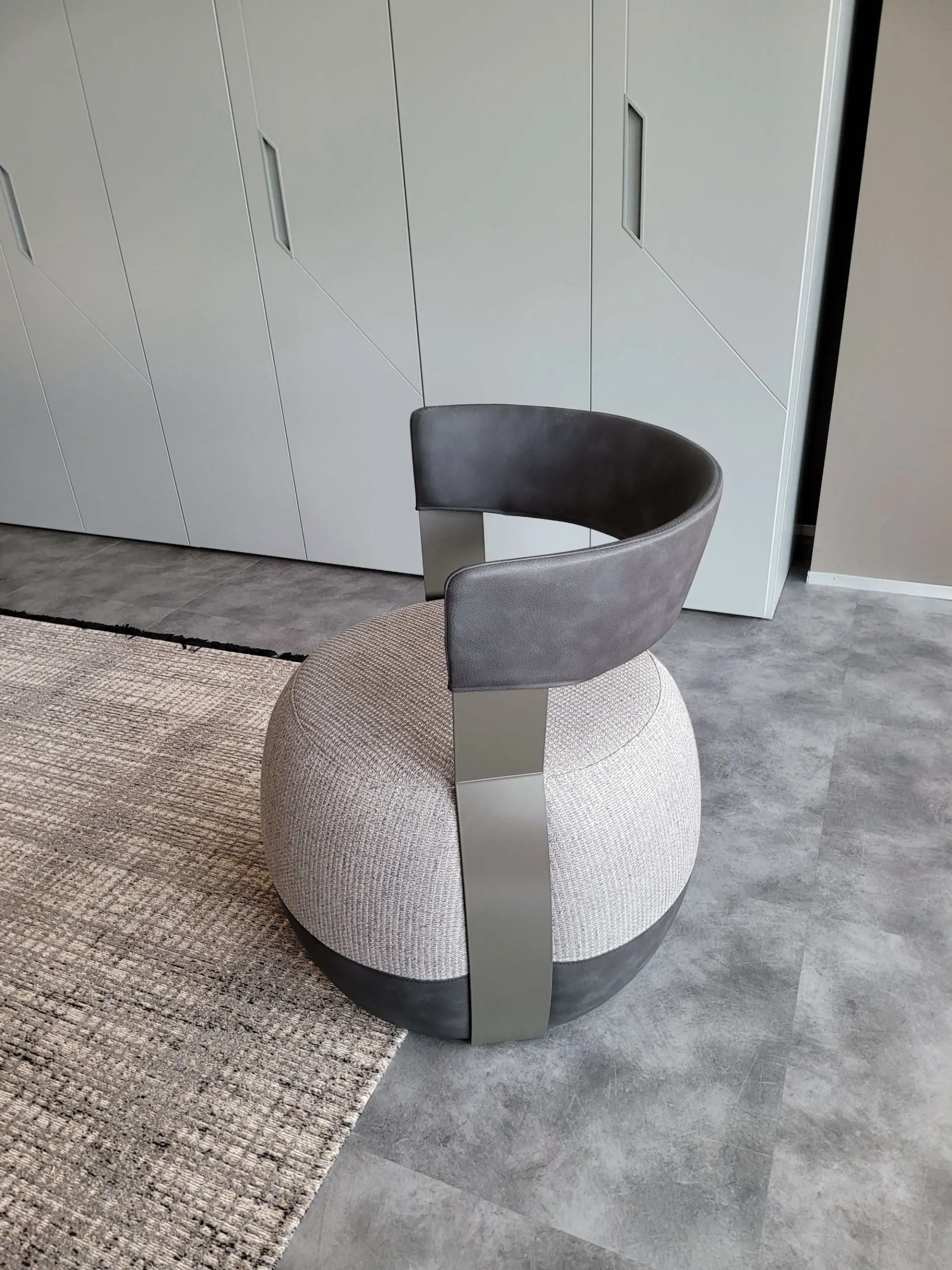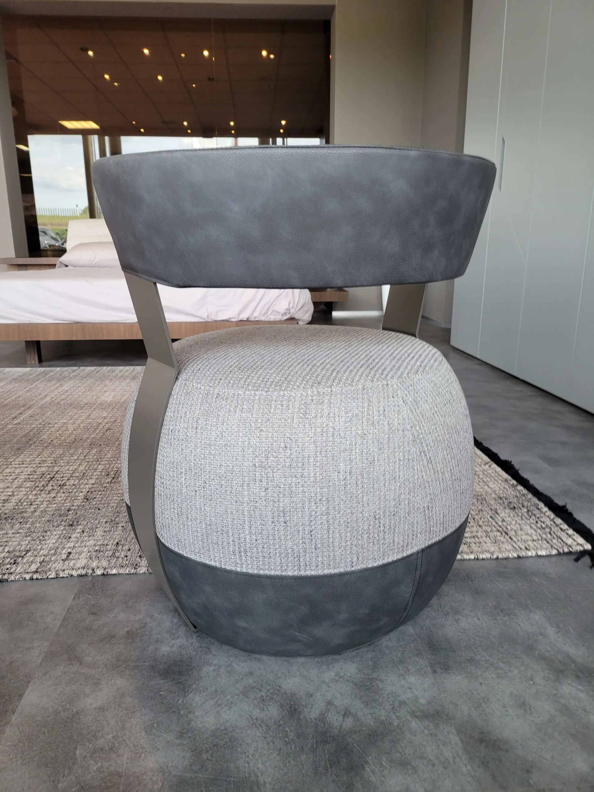 Poltroncina moderna BARRIQUE dalle forme tondeggianti. Seduta e schienale imbottiti e rivestiti in tessuto colore beige e Ecopelle COLORE ANTRACITE.