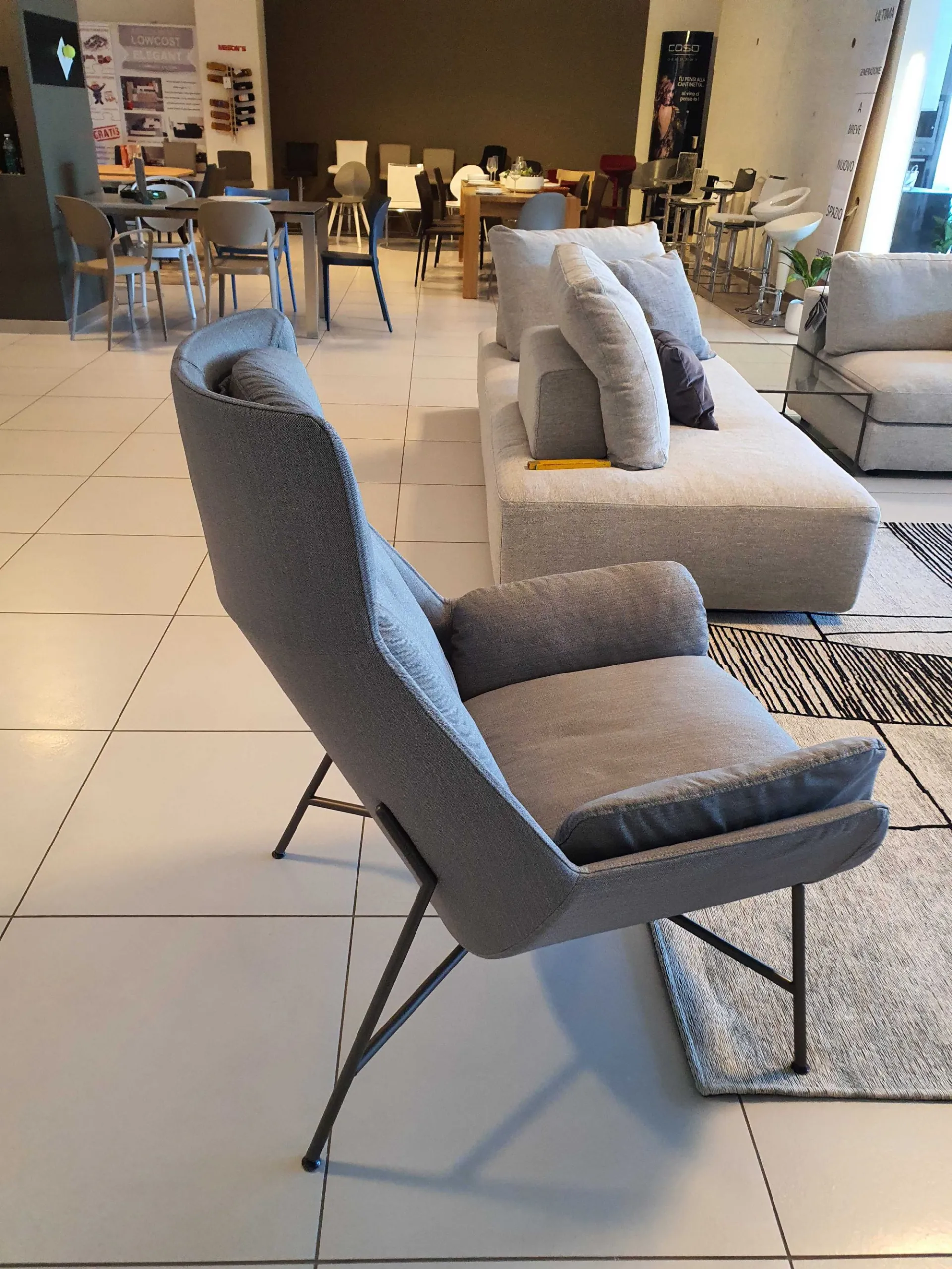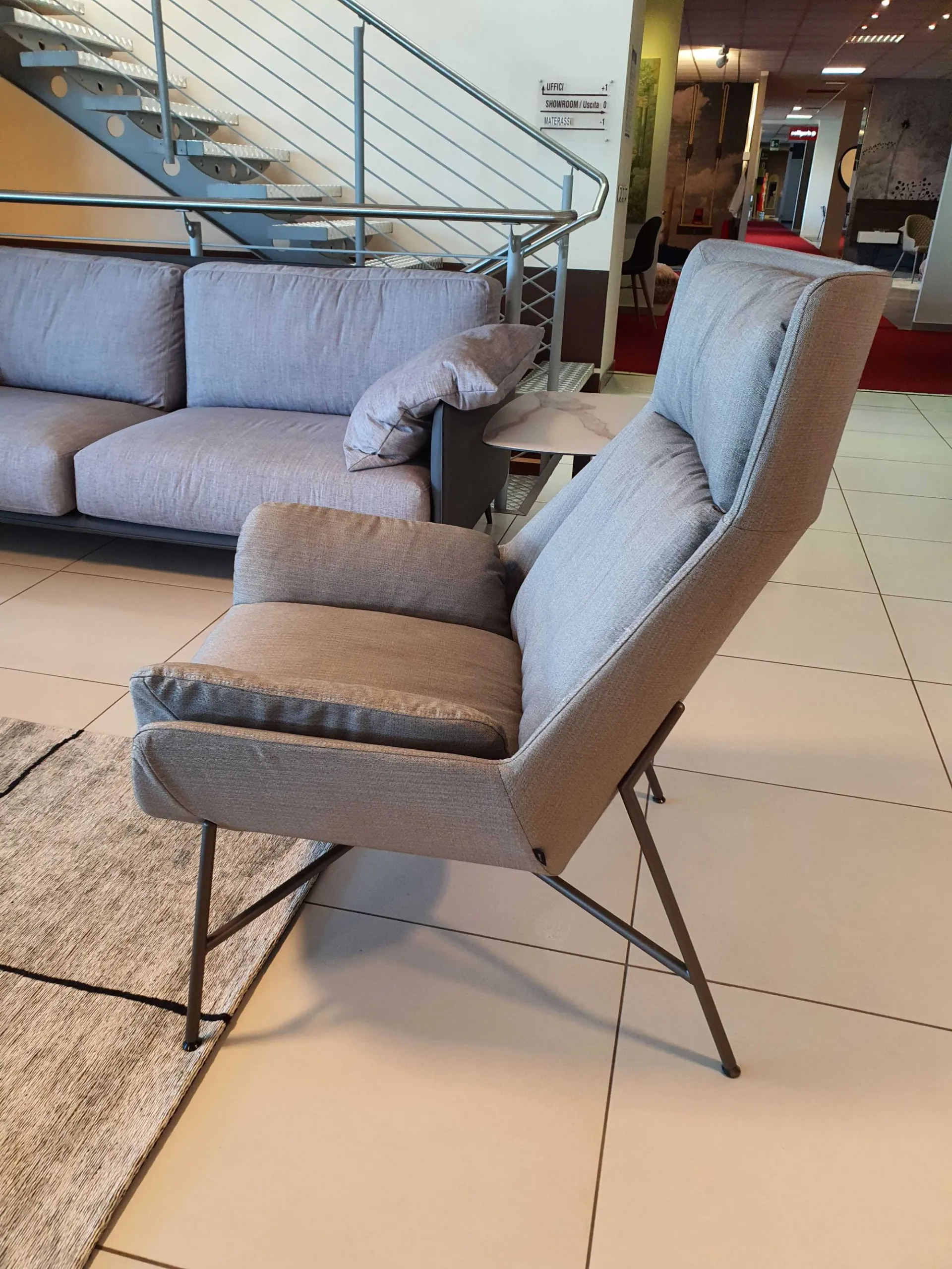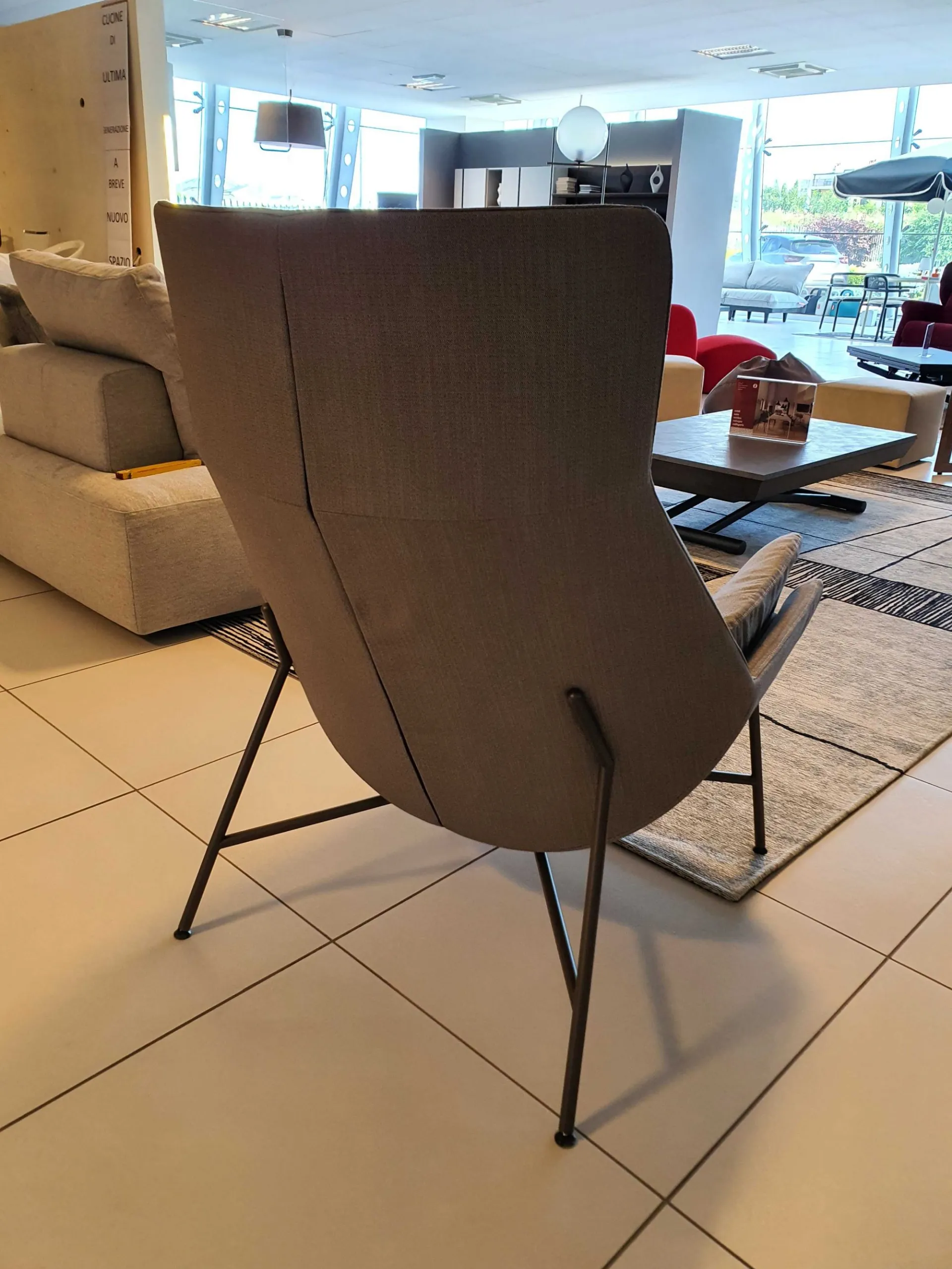 Nuova poltrona BEETLE di Ditre Italia (L=78cm;P=92cm;A=104cm) con imbottitura in piuma. Il sottile ed elegante basamento è in metallo finitura light brown ed è rivestita in tessuto pregiato colore grigio chiaro luminoso