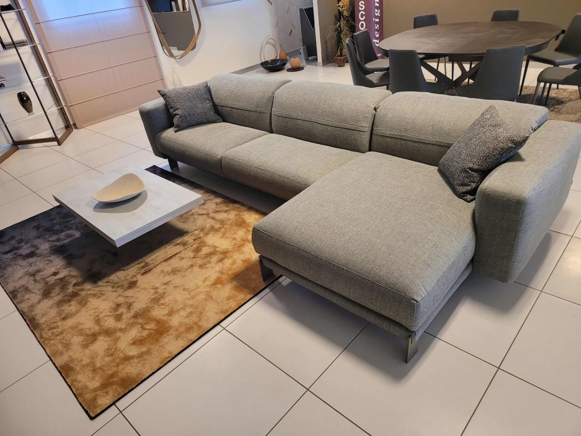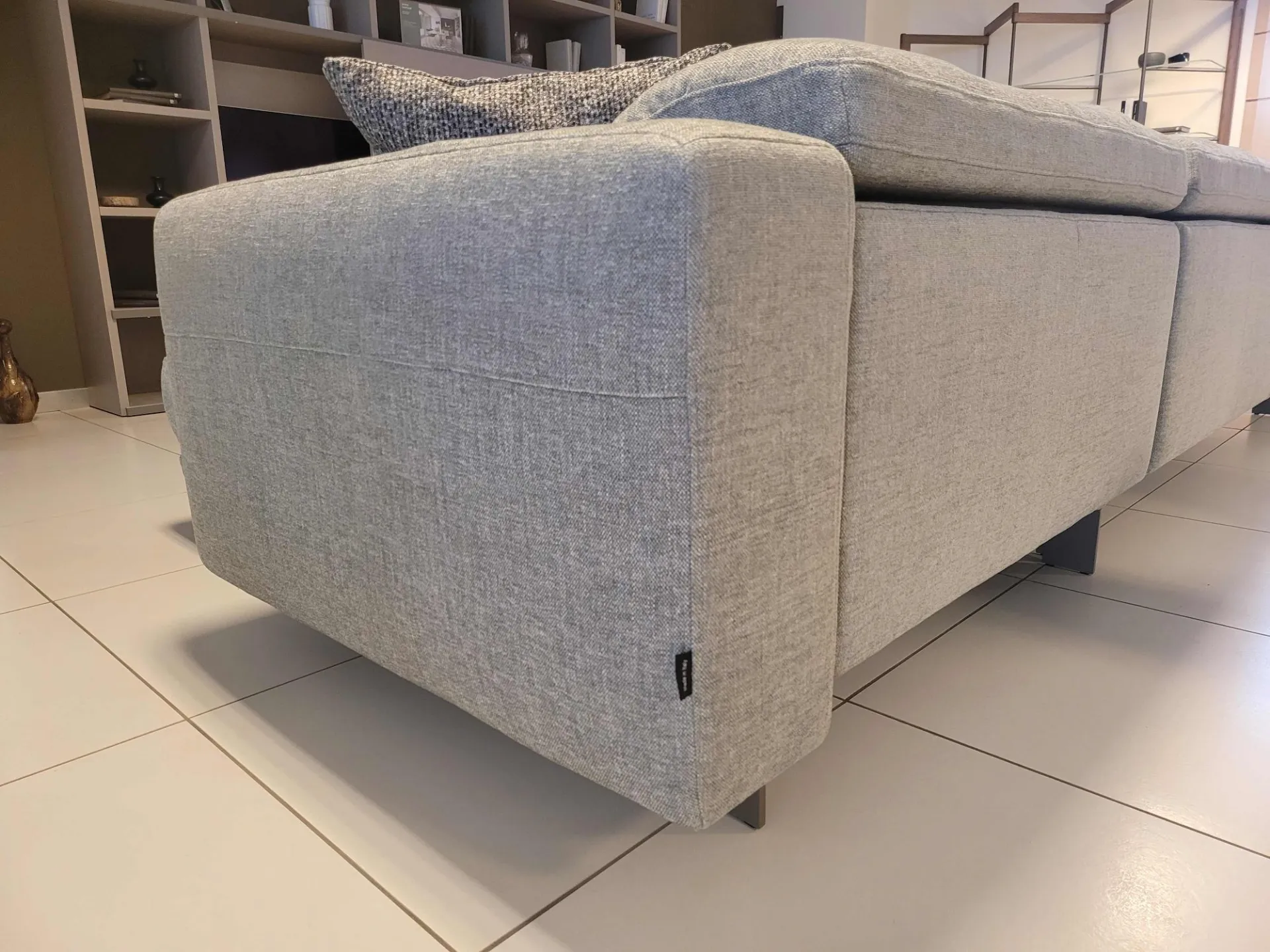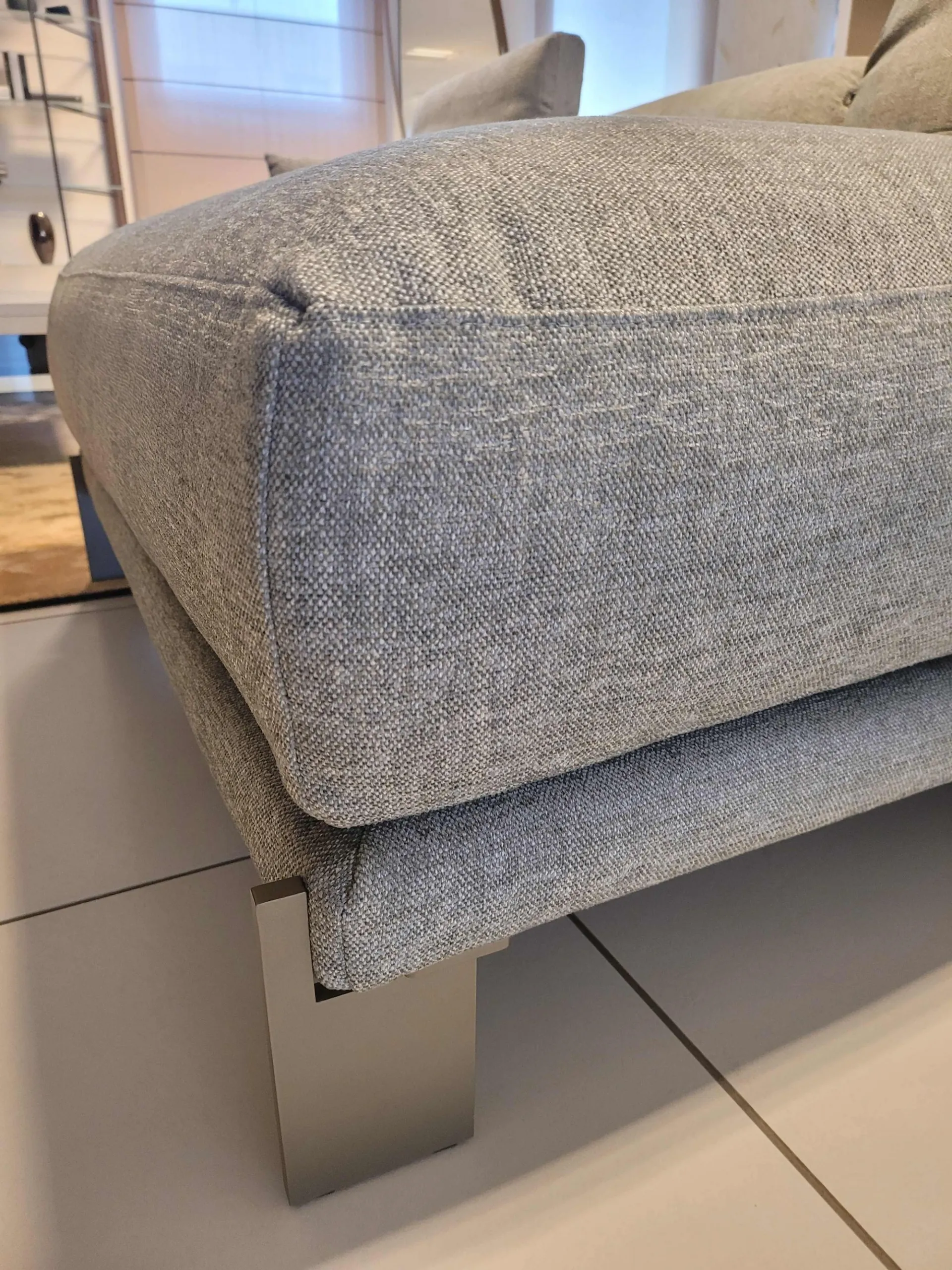 Il divano è sollevato da terra da un piedino in metallo piatto in finitura light brown