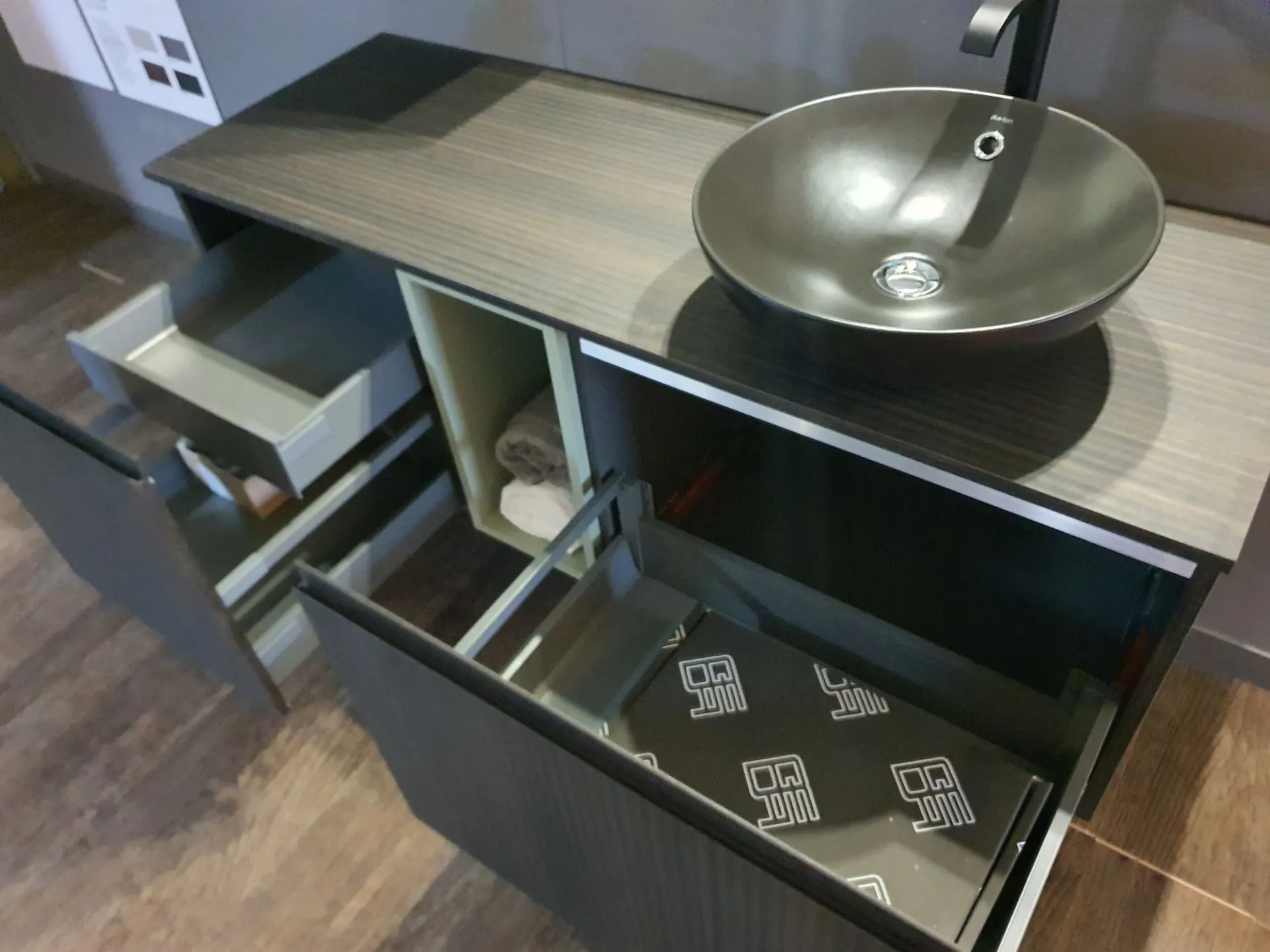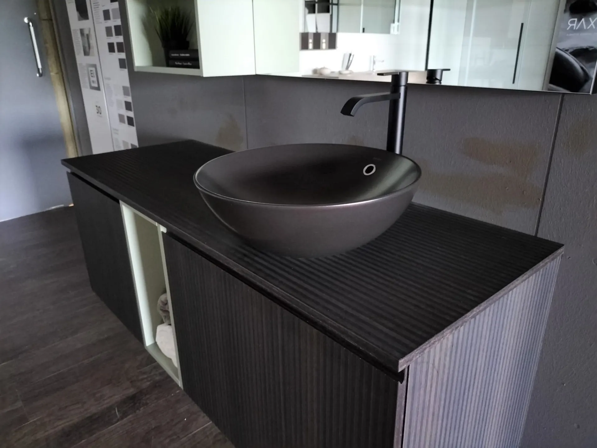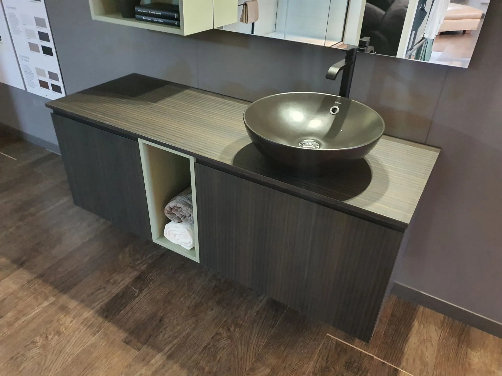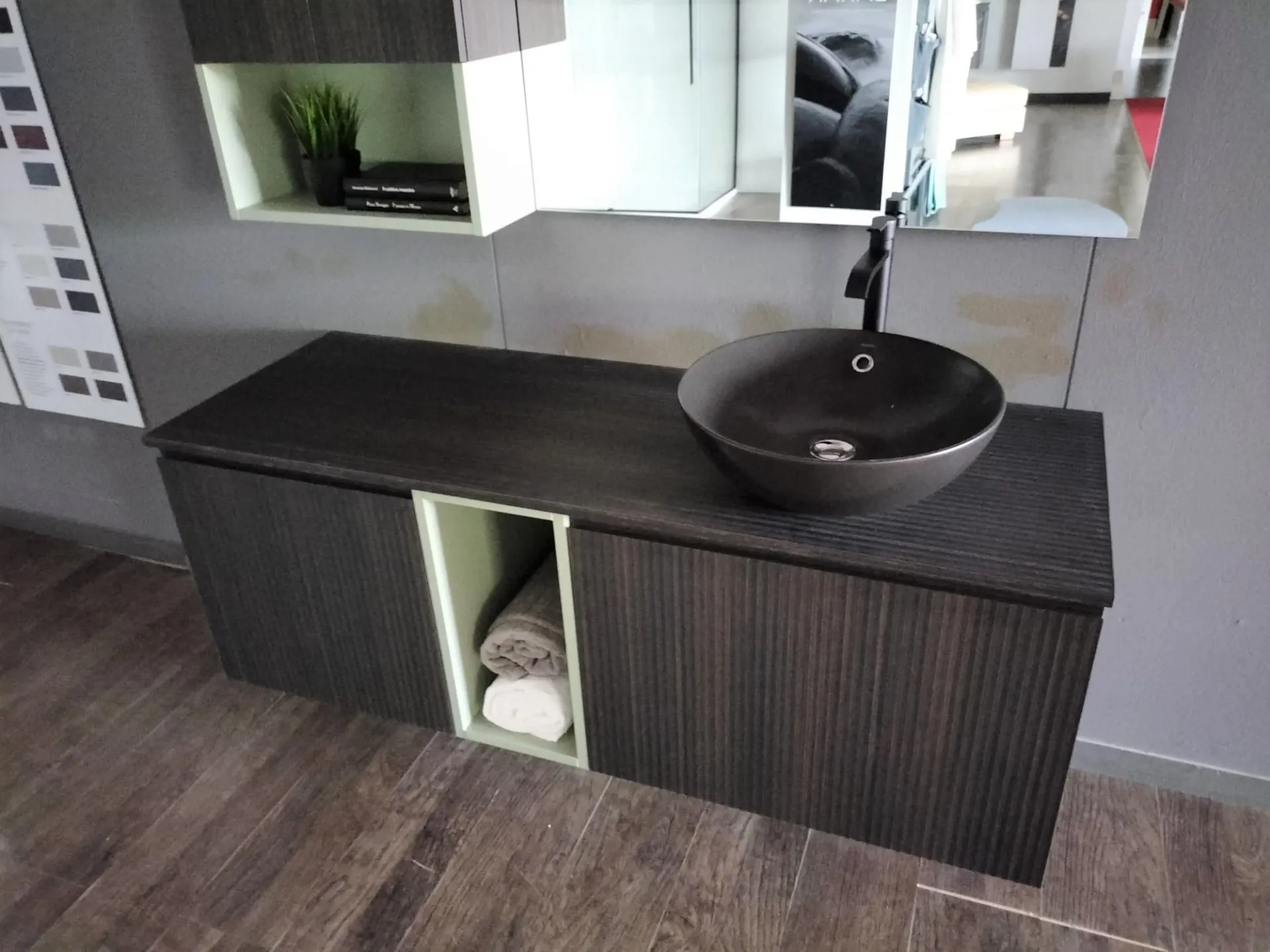 Bagno sospeso B-GO in materico Laos colore 274 e laccato opaco Agave, lavello mod. Firenze in ceramica nero opaco