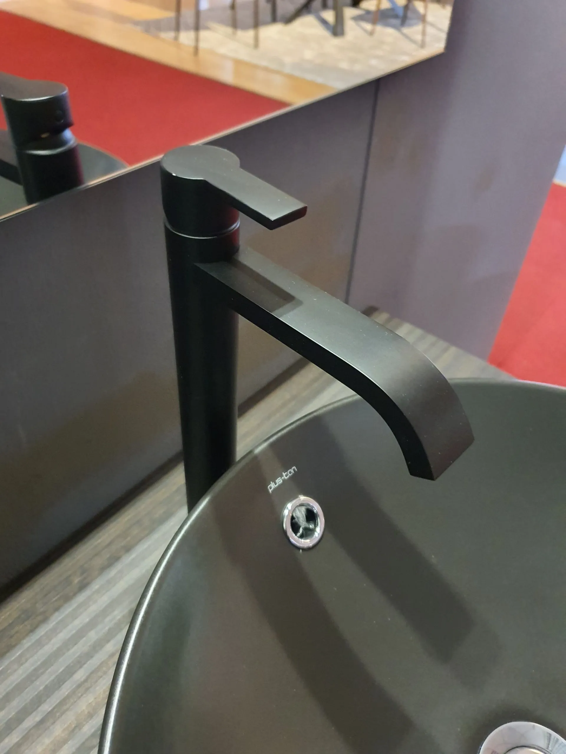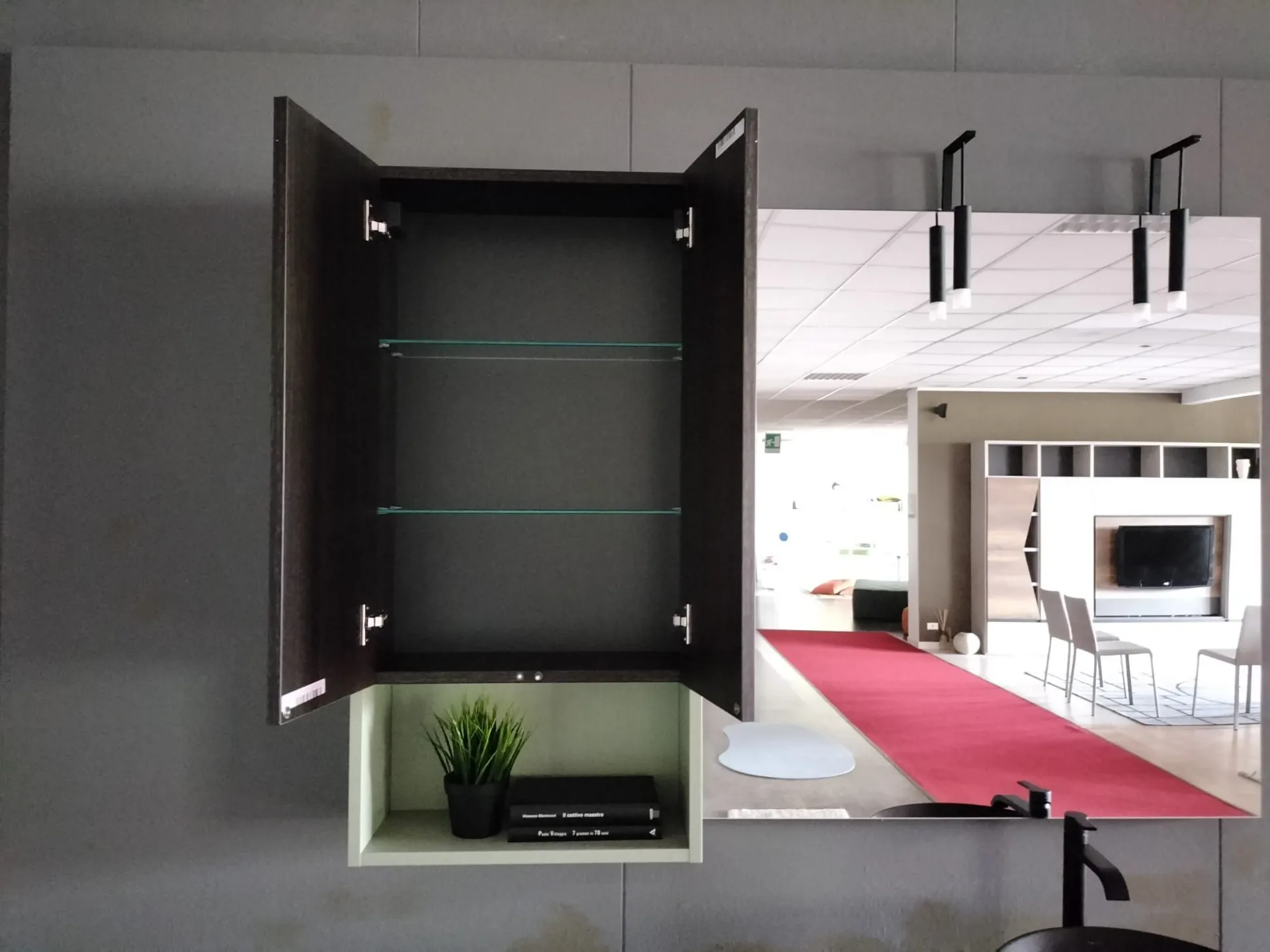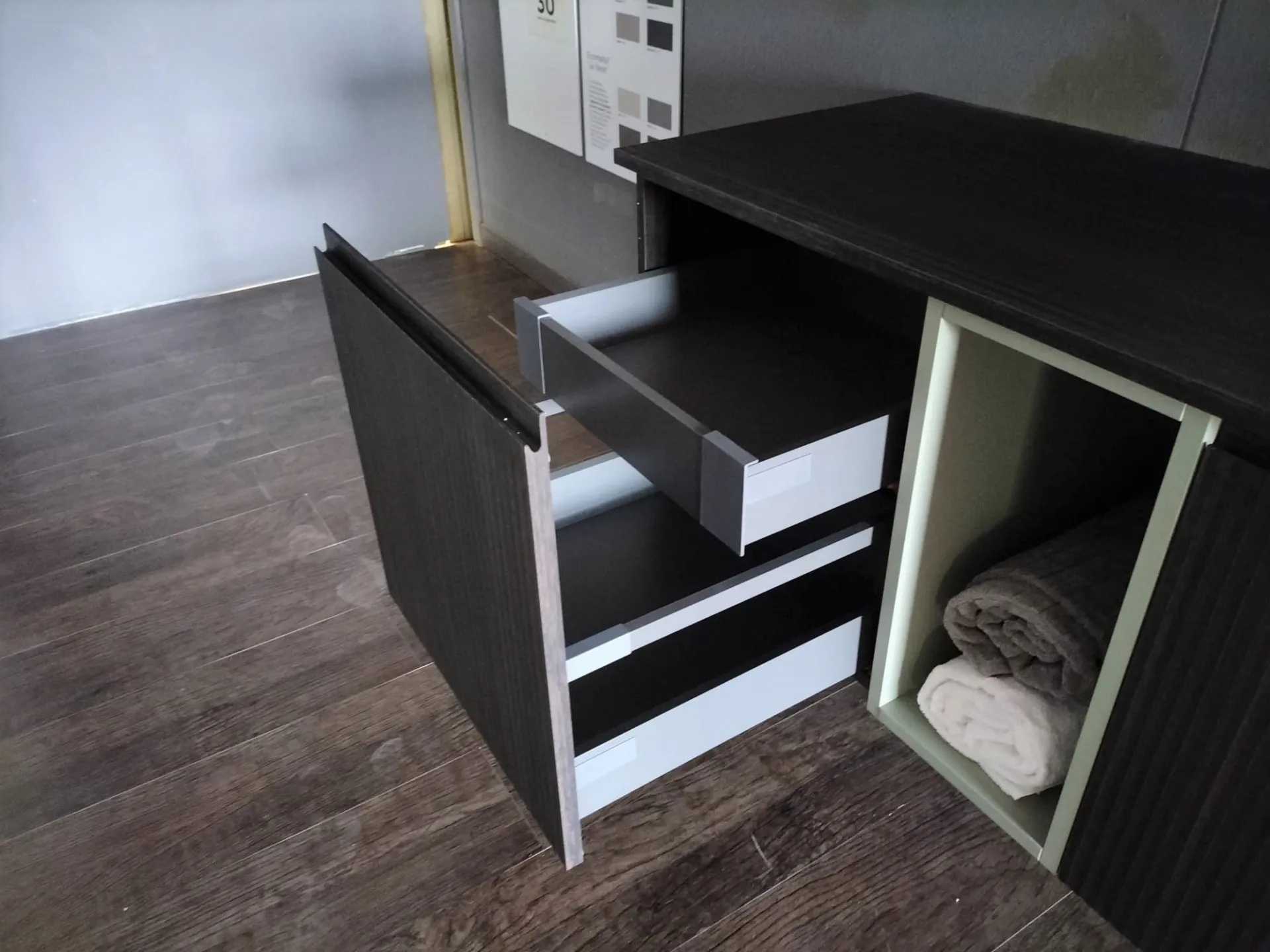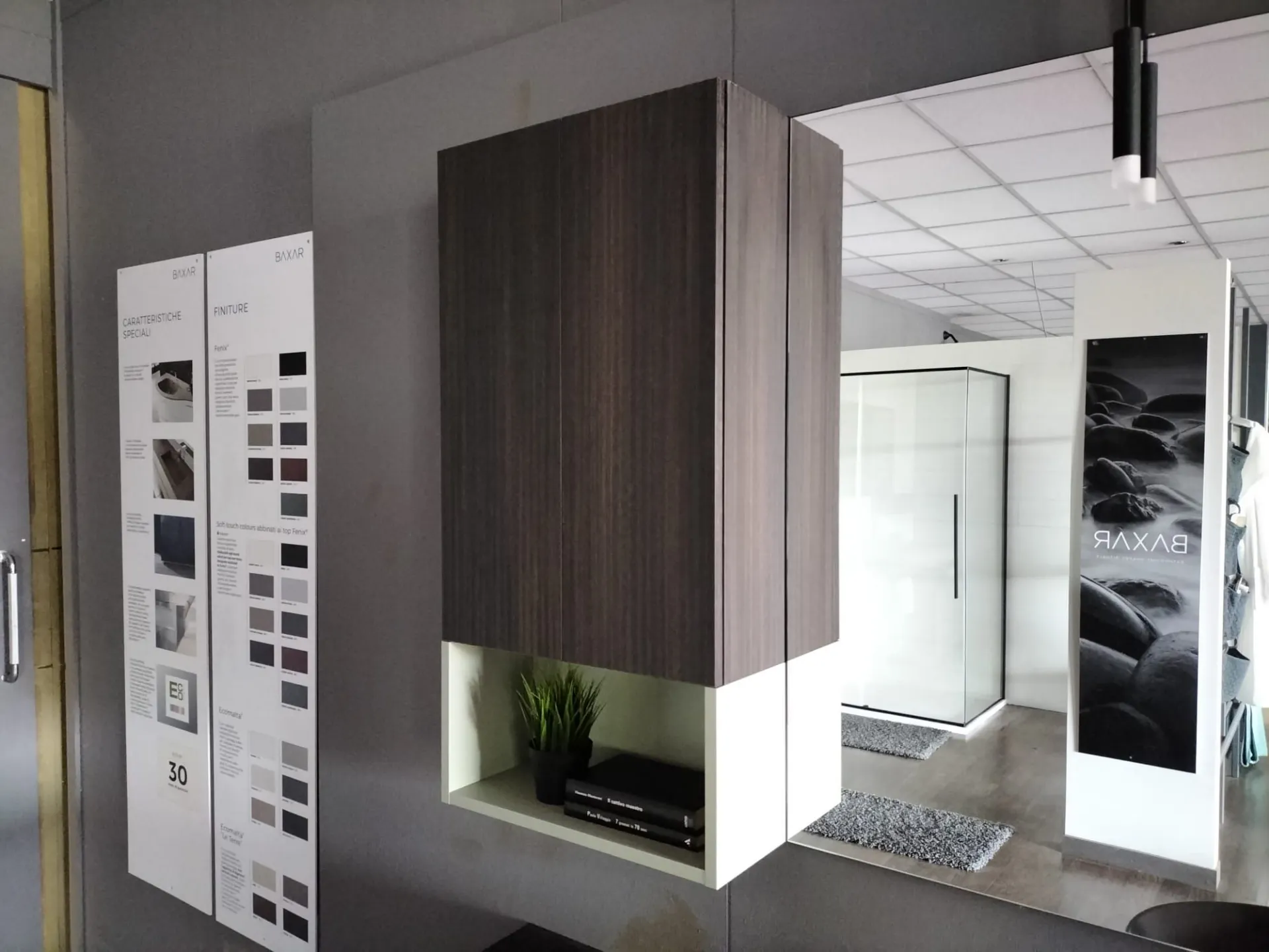Bagno sospeso B-GO in materico Laos colore 274 e laccato opaco Agave, lavello mod. Firenze in ceramica nero opaco