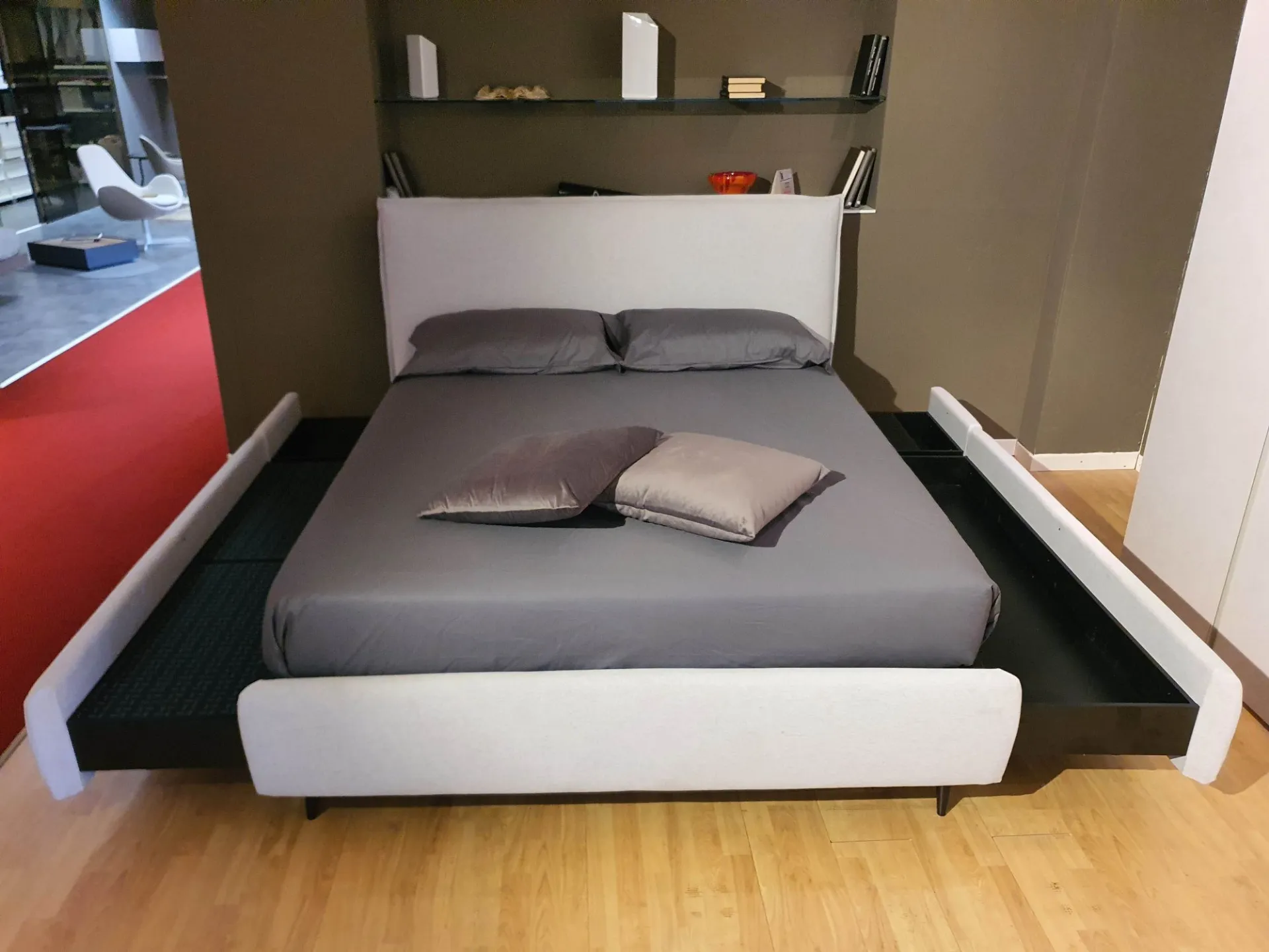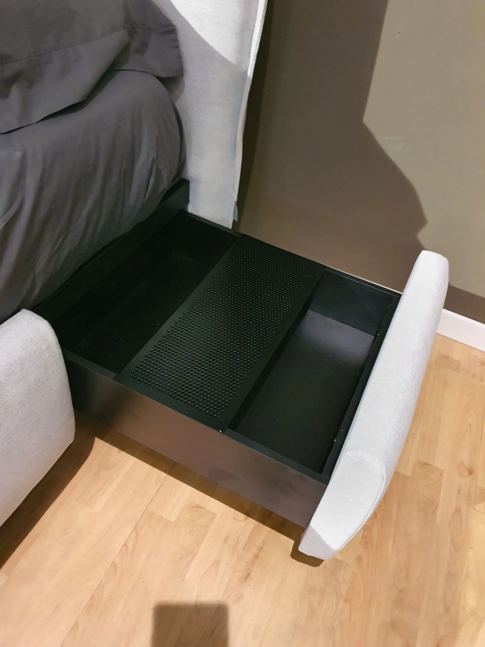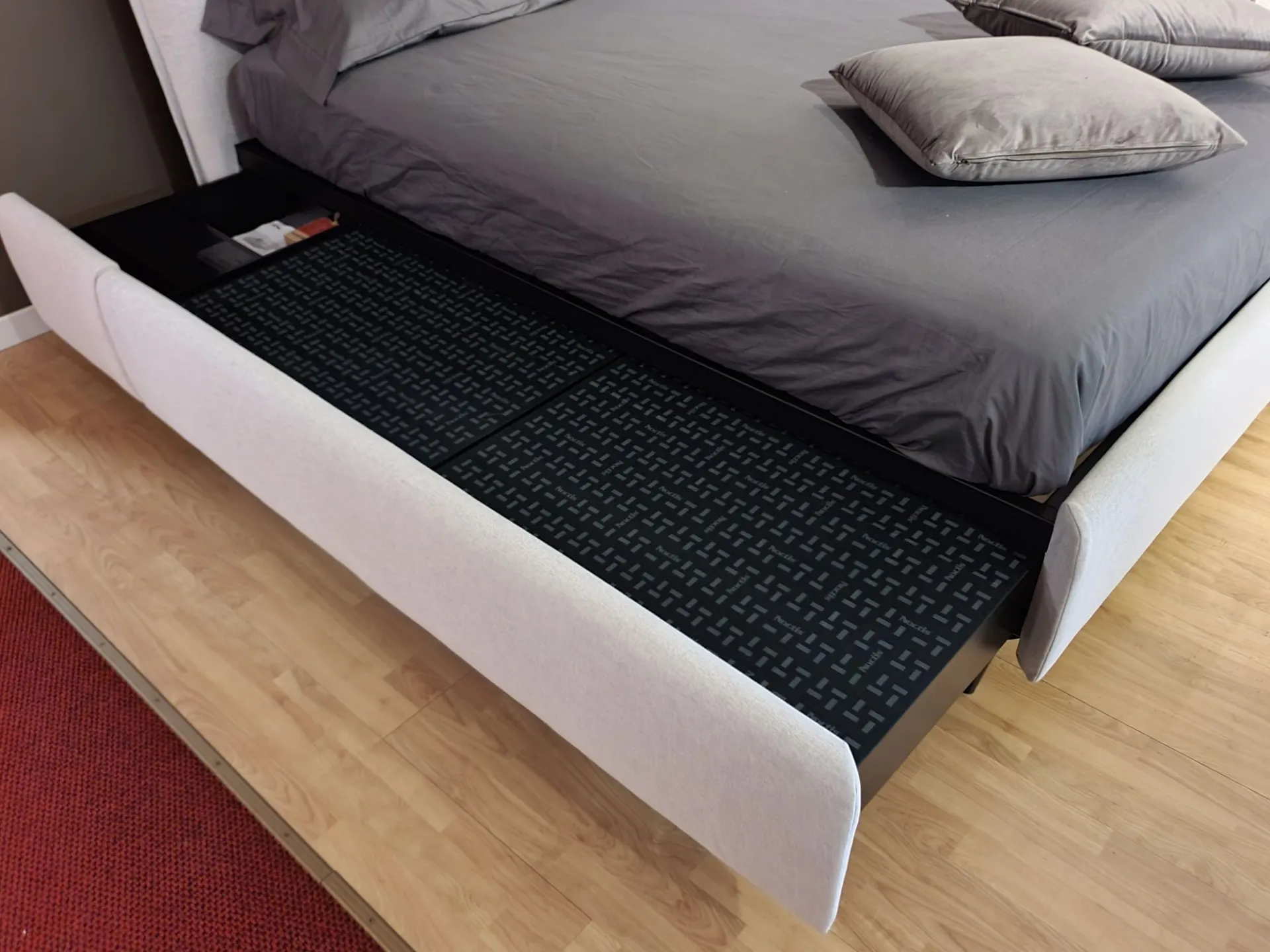 Letto BOB con sistema PopUp®. Alla base del letto sono presenti vani di contenimento scorrevoli: cassetti e cassettoni che vanno a sostituire comodini e comò. Una volta richiusi liberano spazio nella stanza.