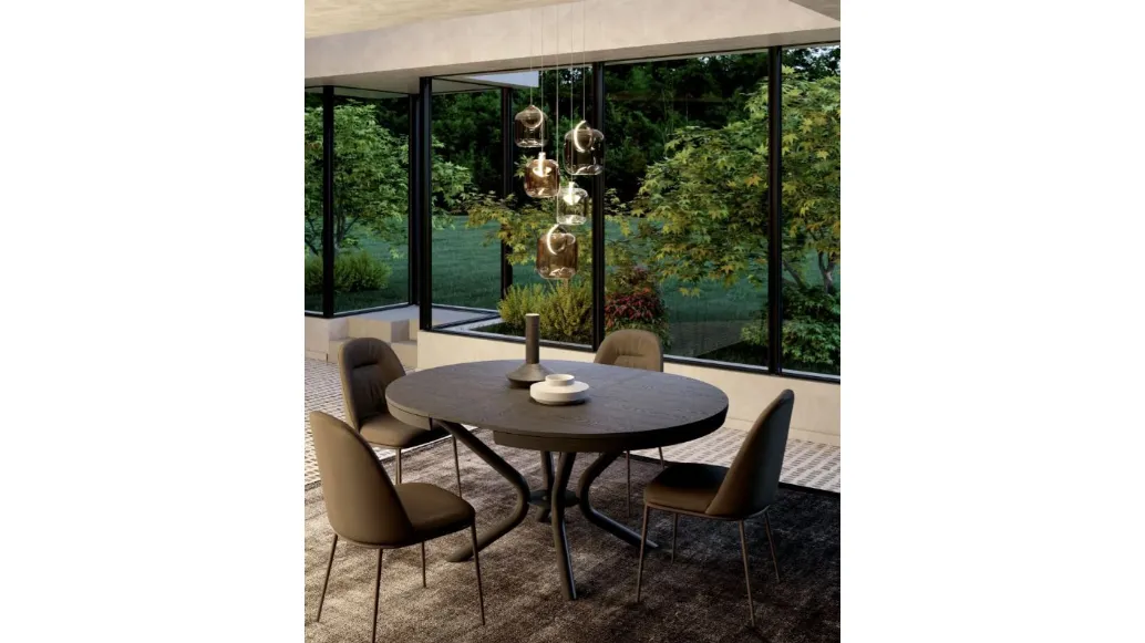 Lampadario con corpo illuminante in metallo e paralumi in vetro soffiato in 3 colorazioni.