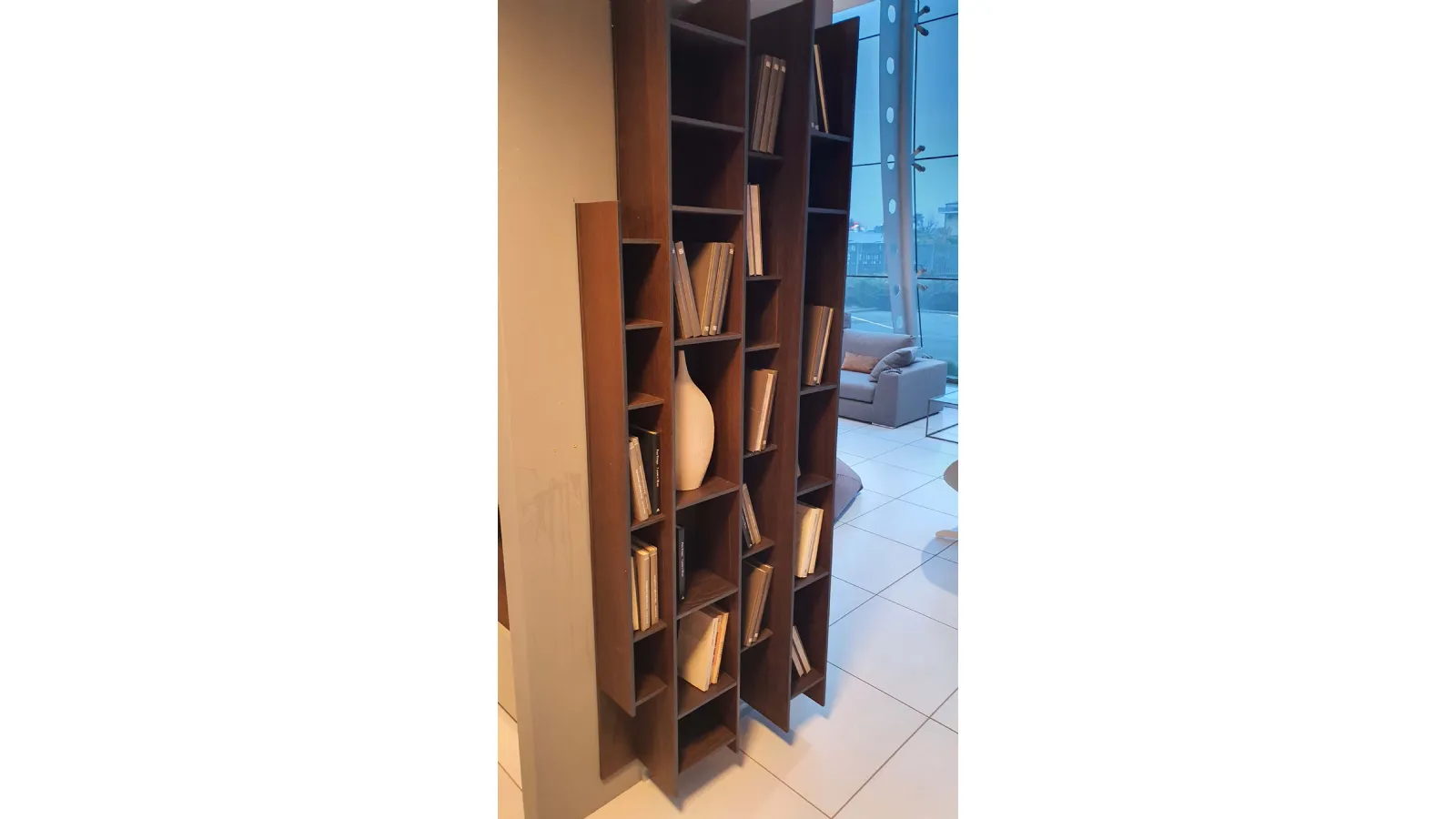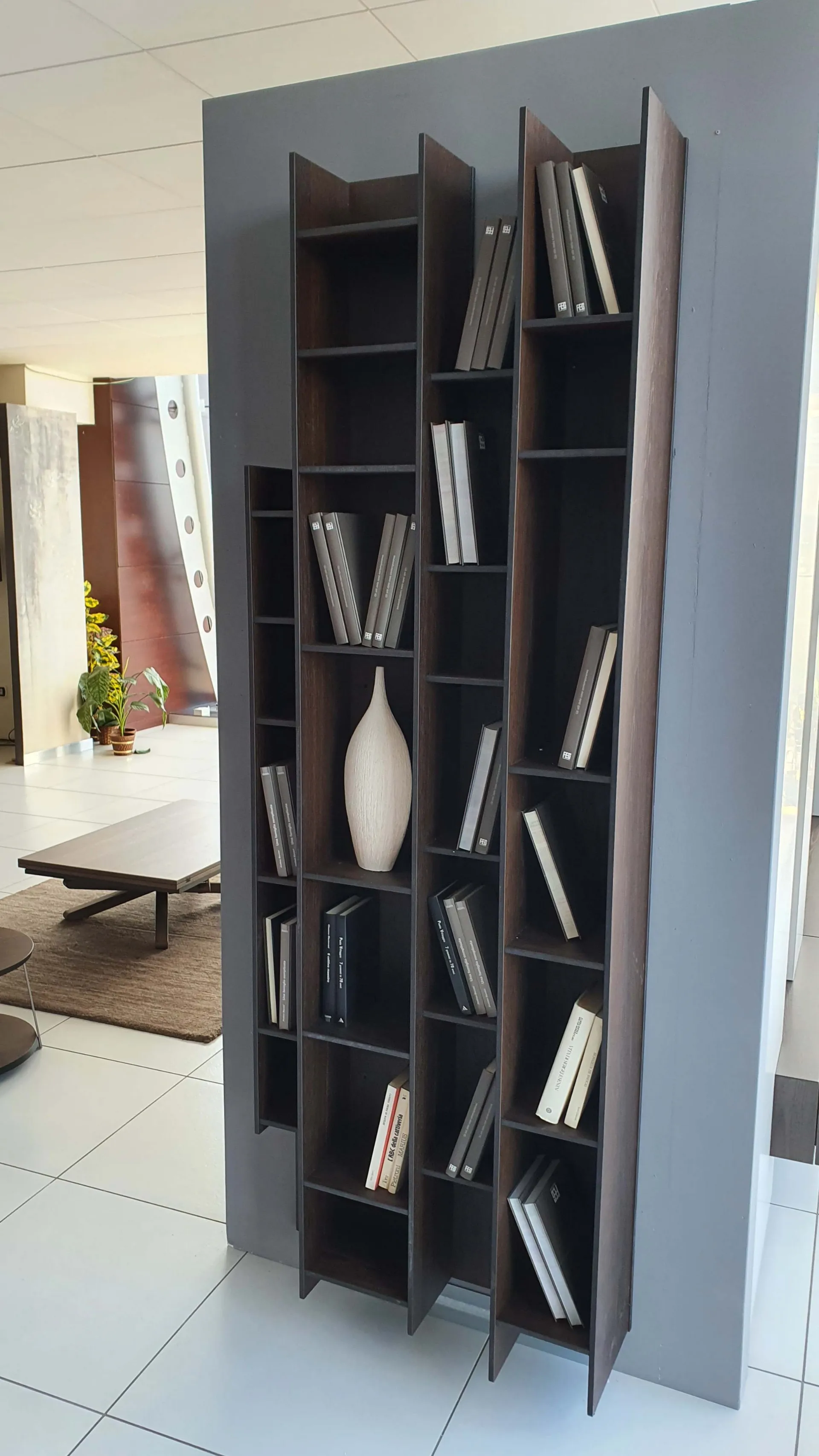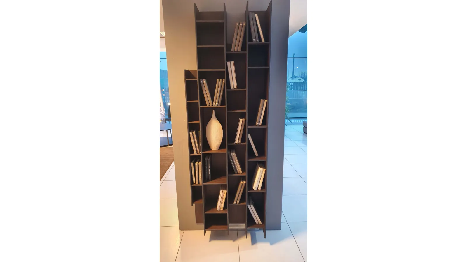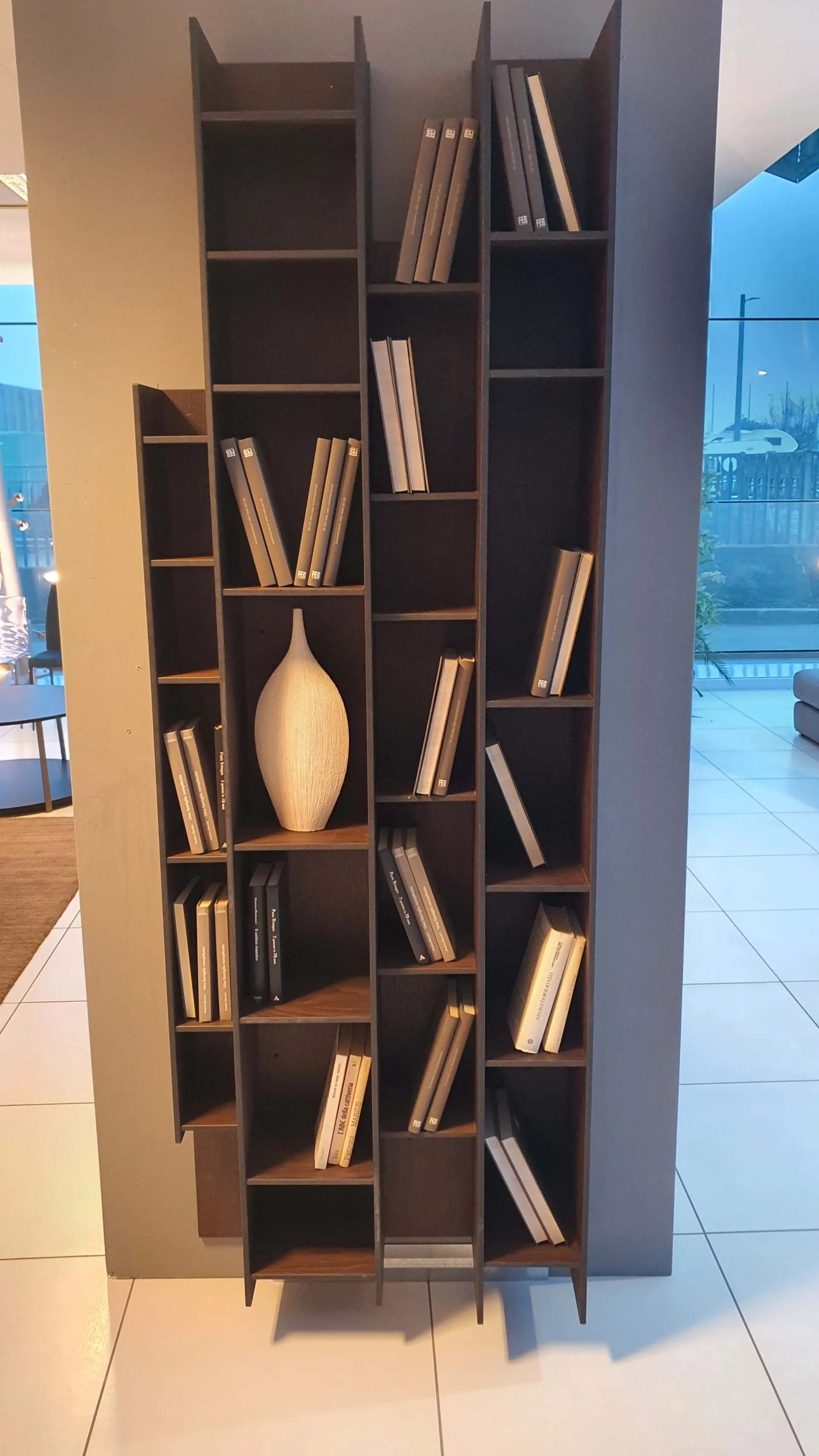 Libreria BYBLOS in legno di rovere termocotto ideale per arredare ambienti moderni ed eleganti. Particolarità di questa libreria è la possibilità di montarla sia in orizzontale che in verticale.