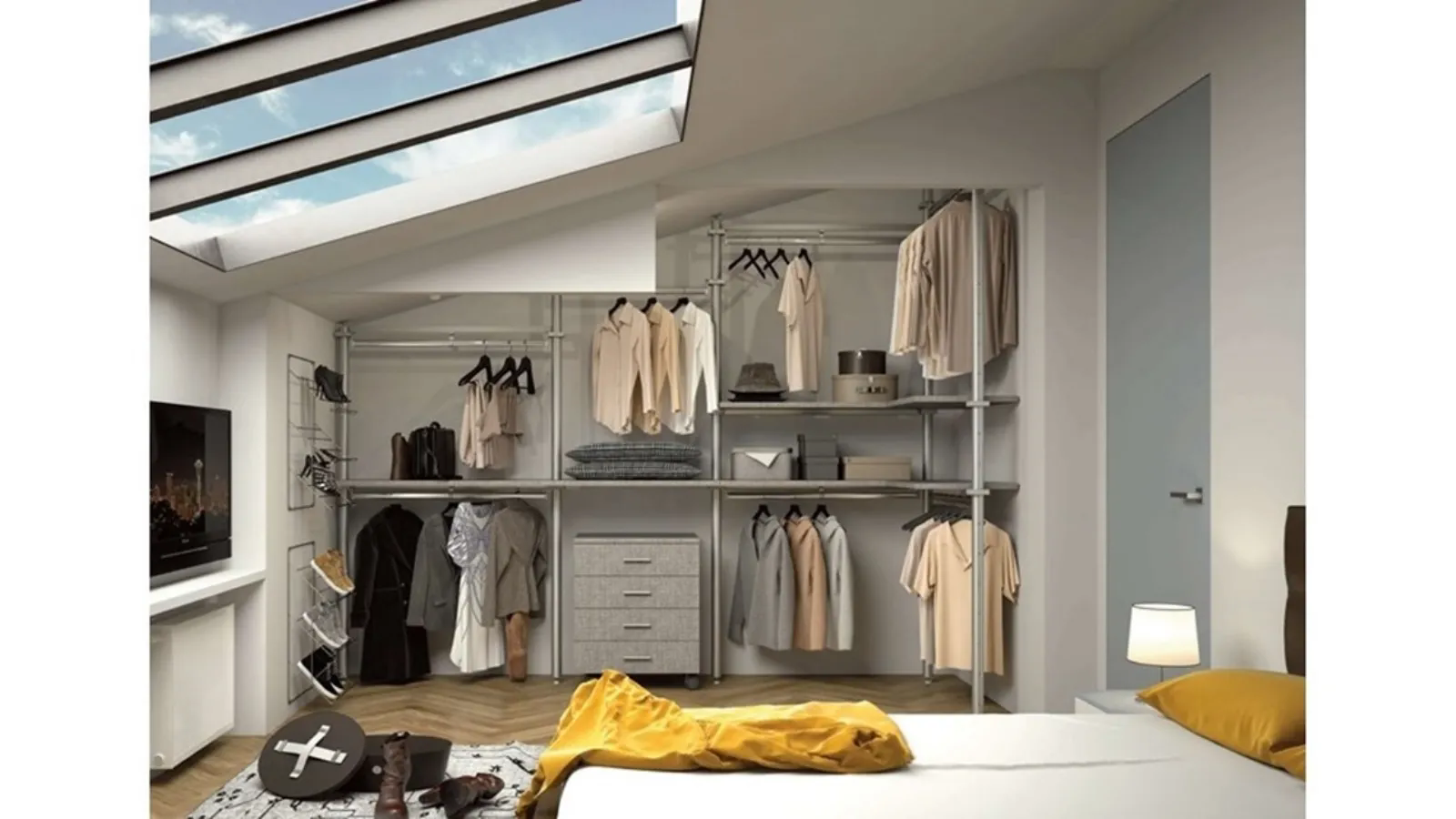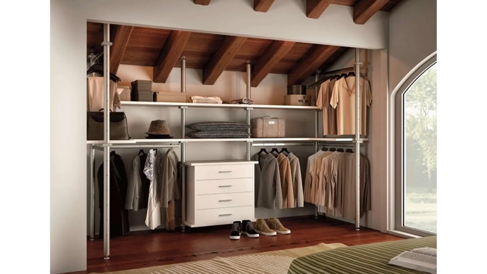 Cabina armadio ricavata in una nicchia sotto tetto grazie a speciali pali in metallo che si ancorano tra pavimento e soffitto senza rovinare la superficie a terra e riuscendo a seguire la randa del tetto senza nessun problema. I pali sono attrezzabili con speciali ganasce per sorreggere vassoi, cassetti, tubi appendiabiti, porta scarpe e quant'altro. Ordine e pulizia estetica sono garantiti poi da chiusure a soffitto in cartongesso e porte scorrevoli realizzate a misura e disponibili in tantissime finiture e materiali. Realizziamo arredi di mansarde e sotto tetti con soluzioni chiavi in mano.