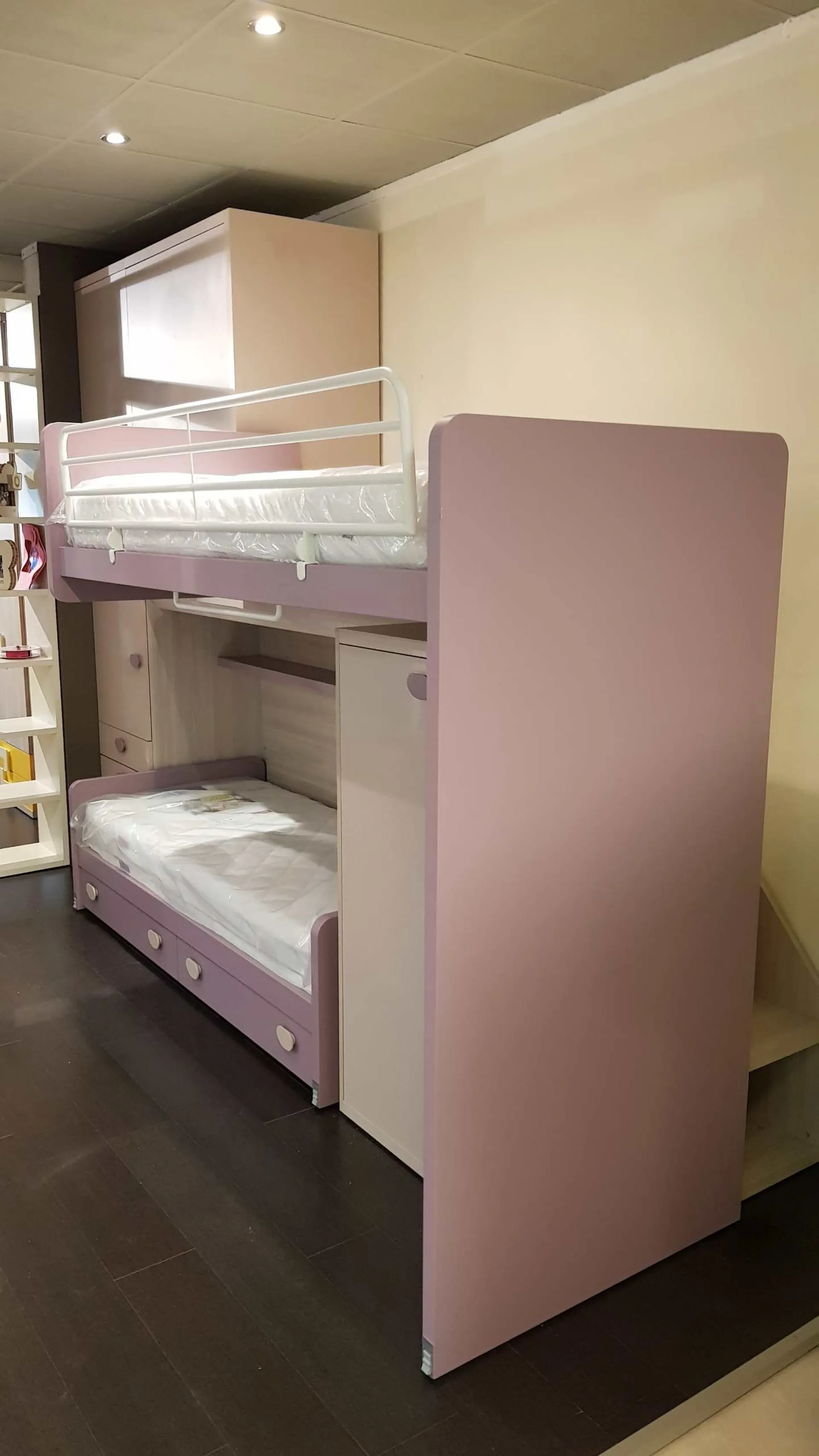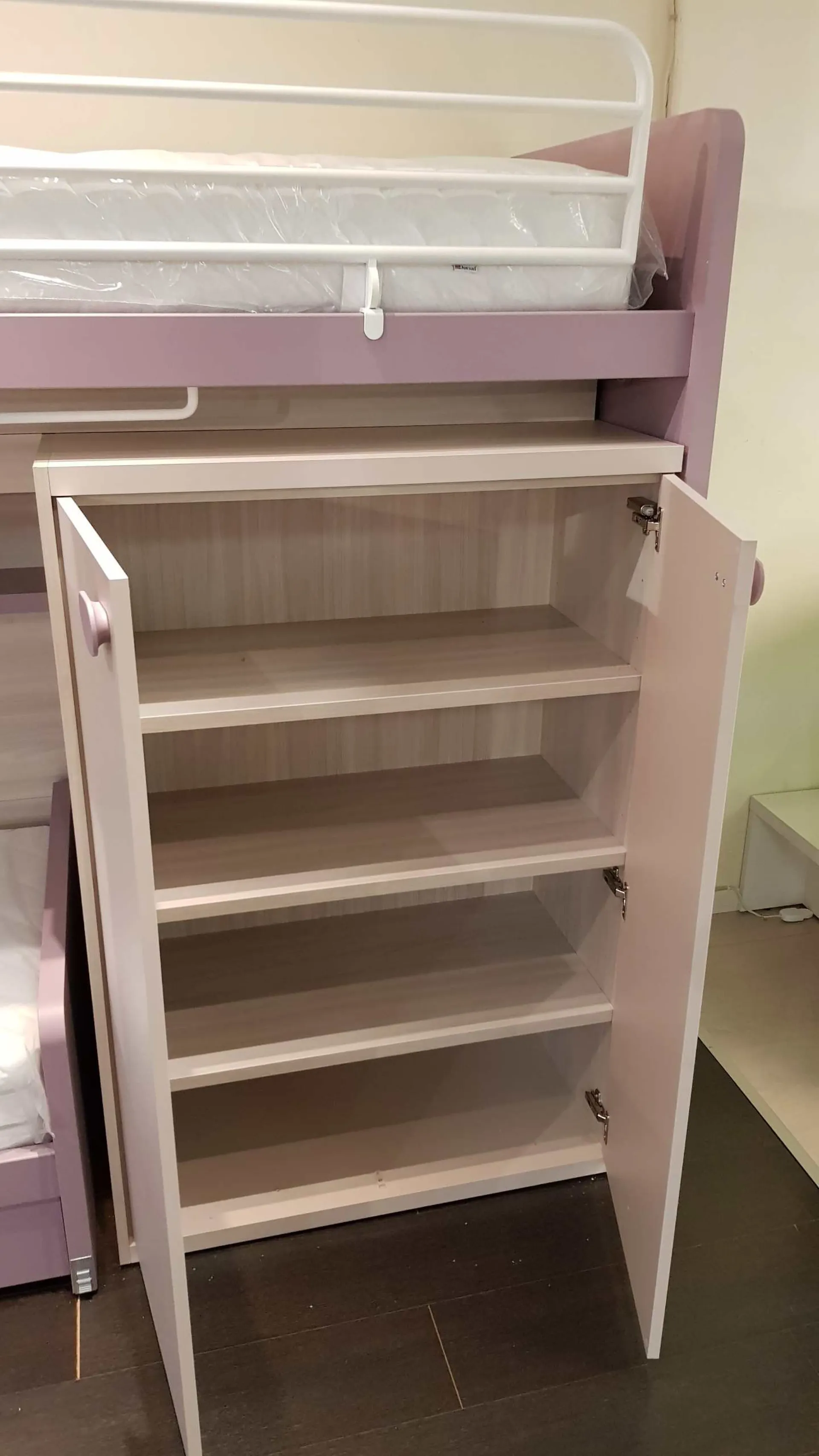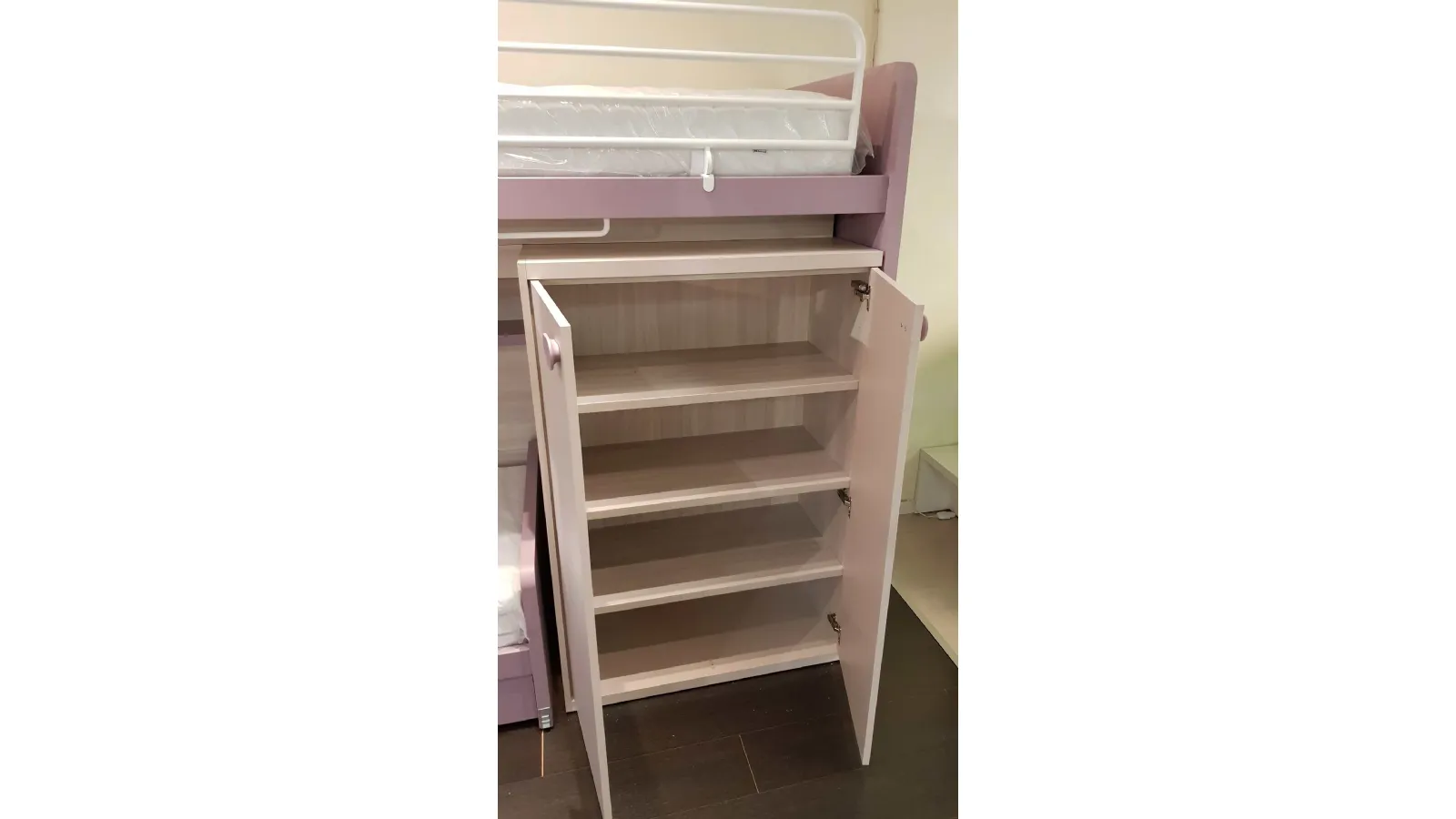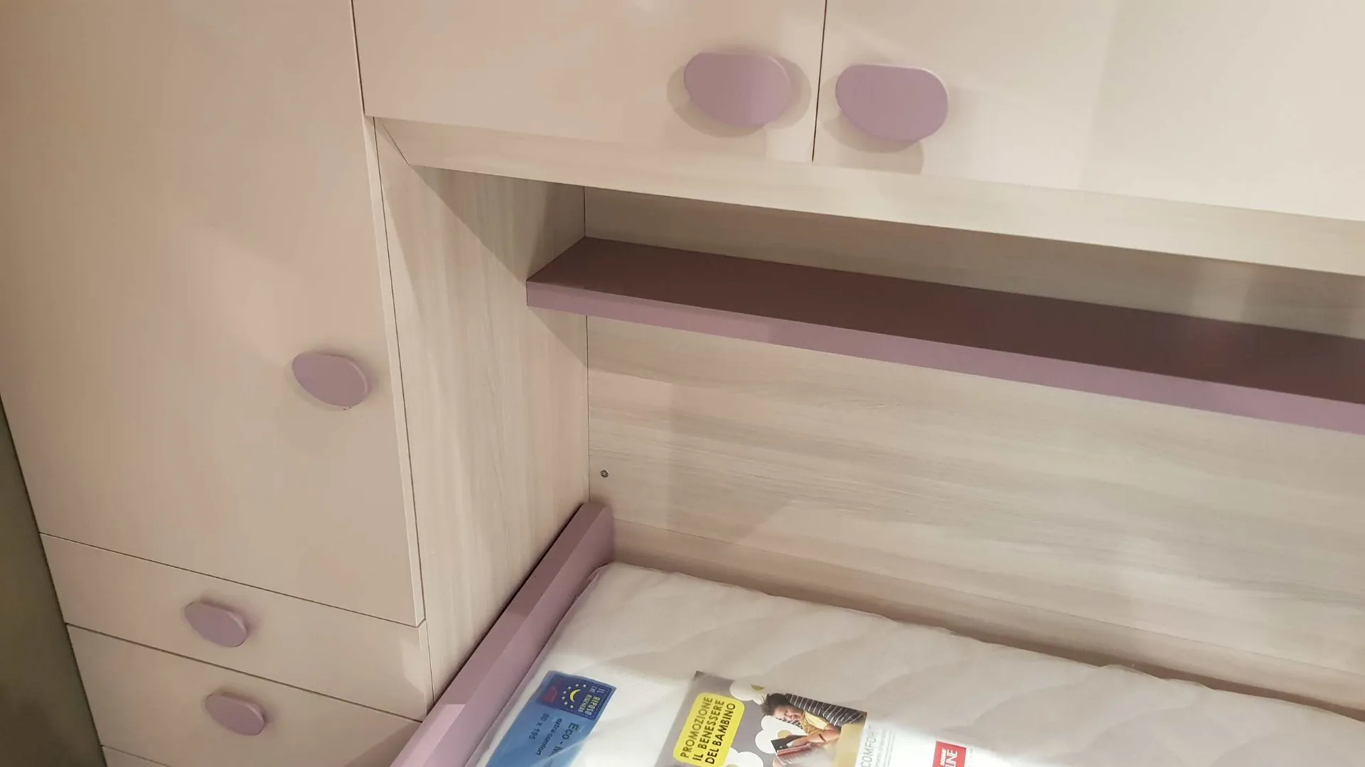 Le finiture sono bianco opaco e ciclamino opaco, la maniglia è a forma di bottone in colore bianco, nel caso può essere sostituita con un altro modello compatibile. Il letto a soppalco è montato su di un meccanismo a scorrimento brevettato che consente di essere estratto per liberare una pratica e comoda scaletta posteriore per salire in tutta sicurezza anche per la mamma che deve rifare il letto.