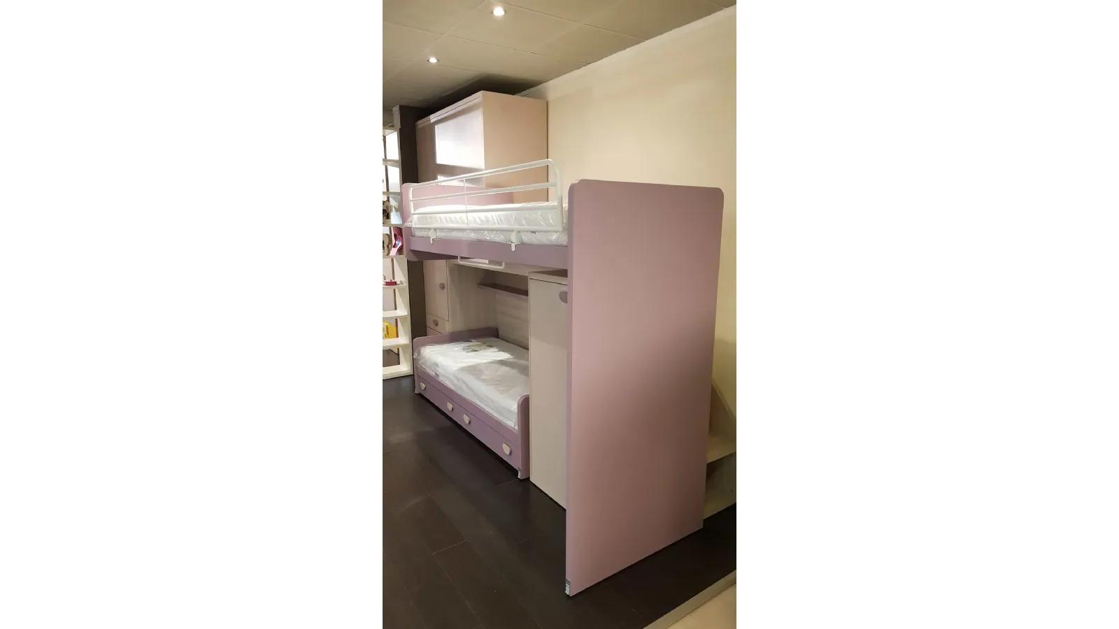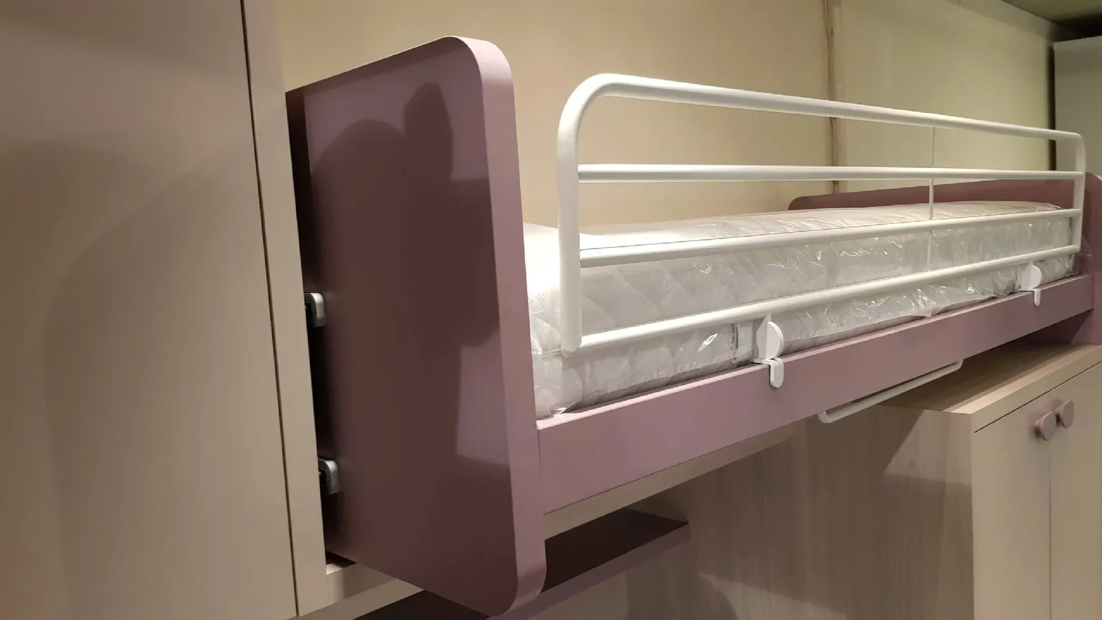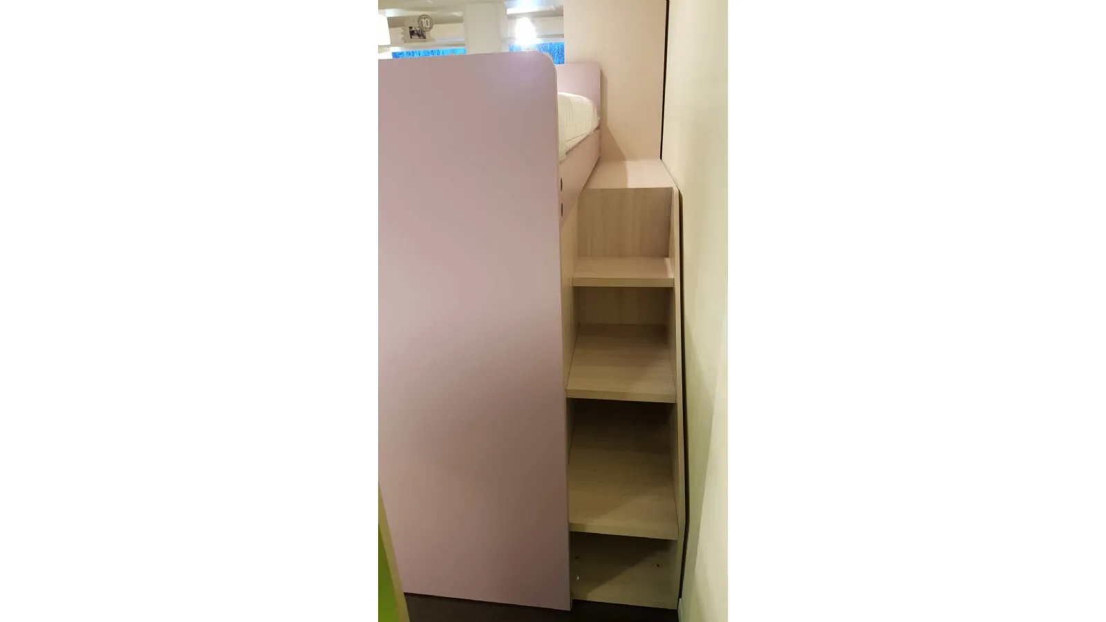 Le finiture sono bianco opaco e ciclamino opaco, la maniglia è a forma di bottone in colore bianco, nel caso può essere sostituita con un altro modello compatibile. Il letto a soppalco è montato su di un meccanismo a scorrimento brevettato che consente di essere estratto per liberare una pratica e comoda scaletta posteriore per salire in tutta sicurezza anche per la mamma che deve rifare il letto.