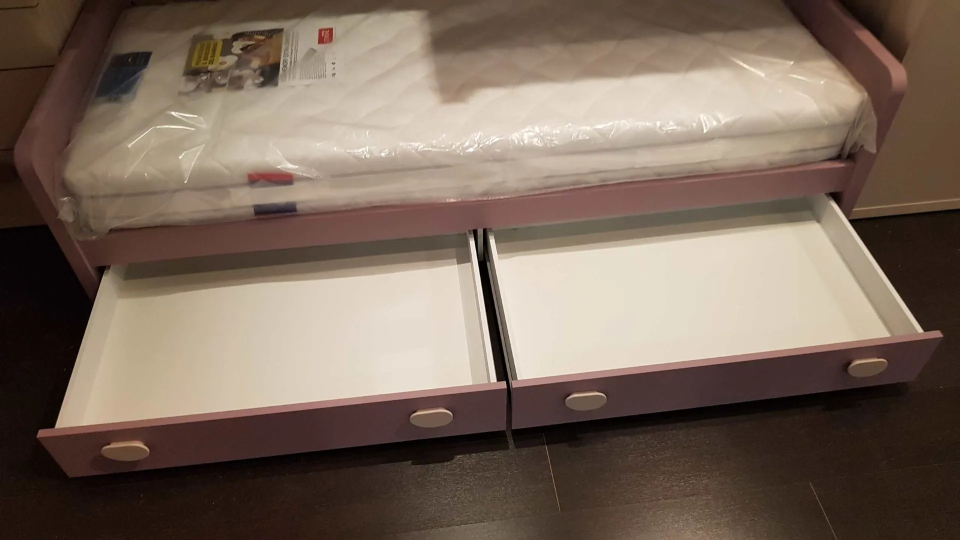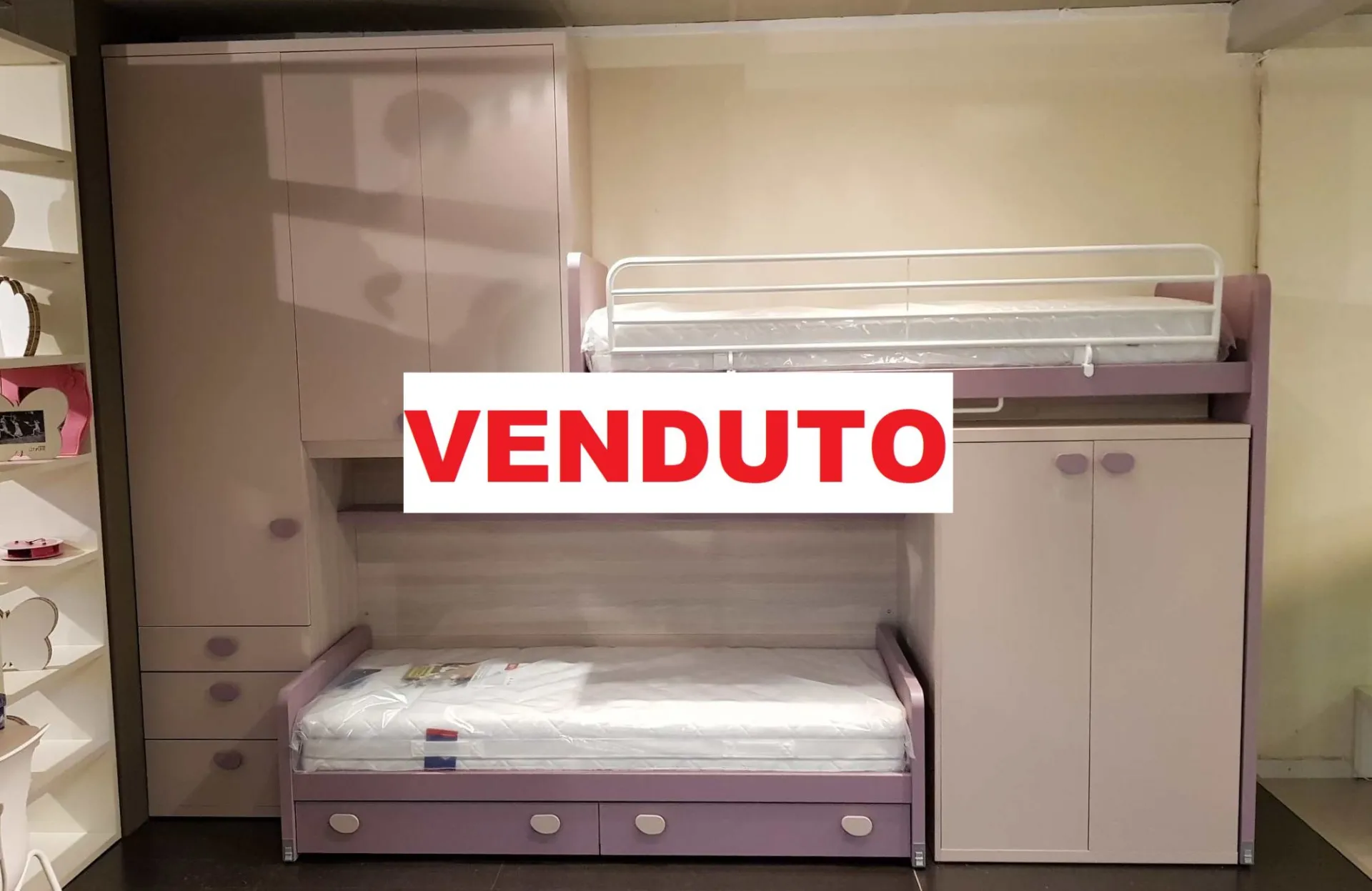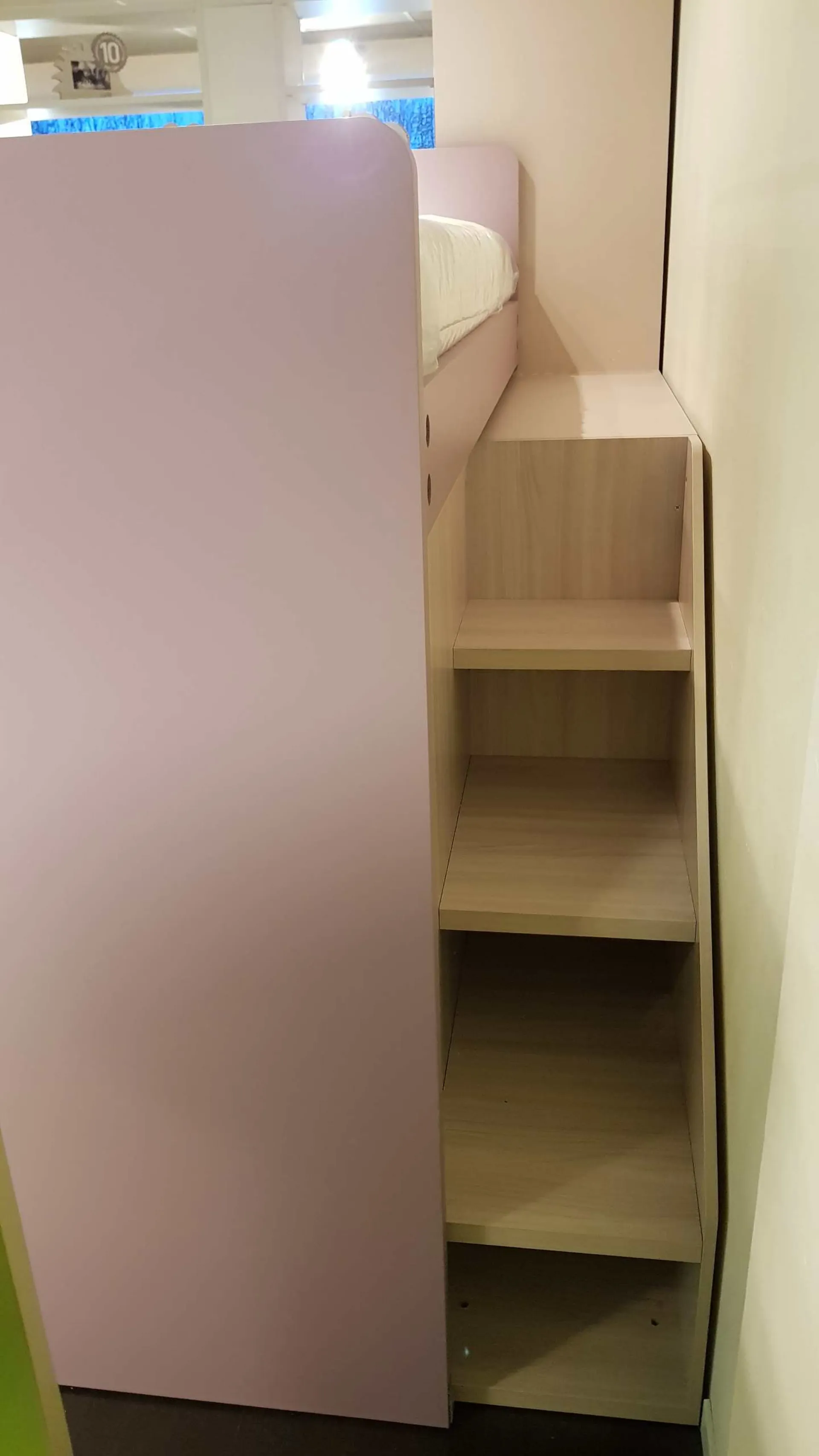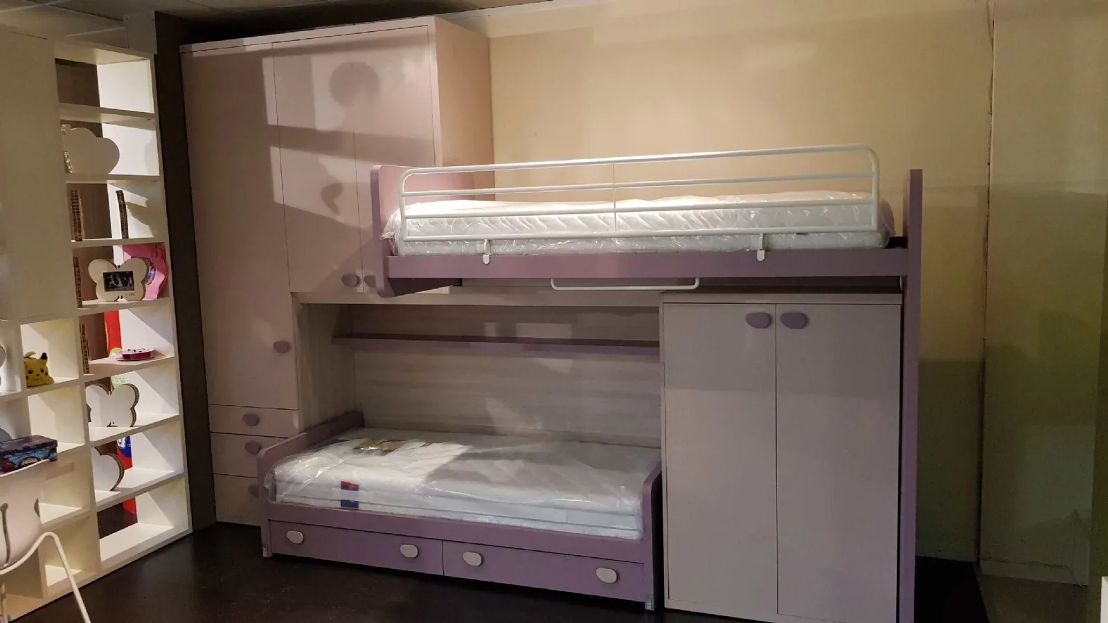 Le finiture sono bianco opaco e ciclamino opaco, la maniglia è a forma di bottone in colore bianco, nel caso può essere sostituita con un altro modello compatibile. Il letto a soppalco è montato su di un meccanismo a scorrimento brevettato che consente di essere estratto per liberare una pratica e comoda scaletta posteriore per salire in tutta sicurezza anche per la mamma che deve rifare il letto.
