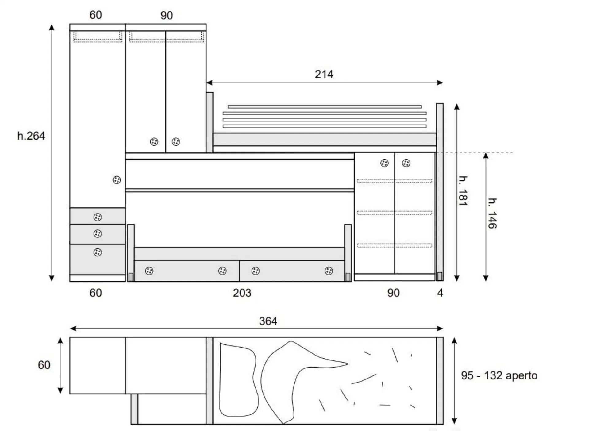La protezione è in metallo e copre bene la lunghezza del materasso per non lasciare spiragli pericolosi per il bambino, inoltre può essere ribaltata per facilitare il rimbocco delle coperte. Il secondo letto a terra è invece dotato di robuste ruote a scomparsa con rivestimento in gomma e sistema di bloccaggio, può scorrere avanti e indietro per consentire una comoda sistemazione delle lenzuola e facilitare le pulizie giornaliere. La struttura è robusta e completa di quattro cassettoni capienti montati su guide esterne che si muovono unitamente al letto. Sono incluse due reti ortopediche a doghe predisposte per materassi da cm. 80x190-195 L'armadio si articola per sfruttare al massimo lo spazio a disposizione, una colonna a terra è predisposta di 4 cassetti e 1 anta con appenderia interna, l'elemento a ponte è composto da 2 ante a battente con appenderia interna, mentre l'elemento a terra sotto il letto a soppalco è molto profondo e dotato di ripiani. È inclusa anche la scrivania composta da piano sagomato a 'fagiolo' con speciale gamba di supporto con ruote girevoli, completa di cassettiera girevole su ruote con tre cassetti e sedia in multistrati laccato opaco con ruote ed alzo a gas Una composizione intelligente perchè in un ingombro di soli cm. 300x90prof. riesce a farci stare tutto lasciando anche lo spazio per il gioco.