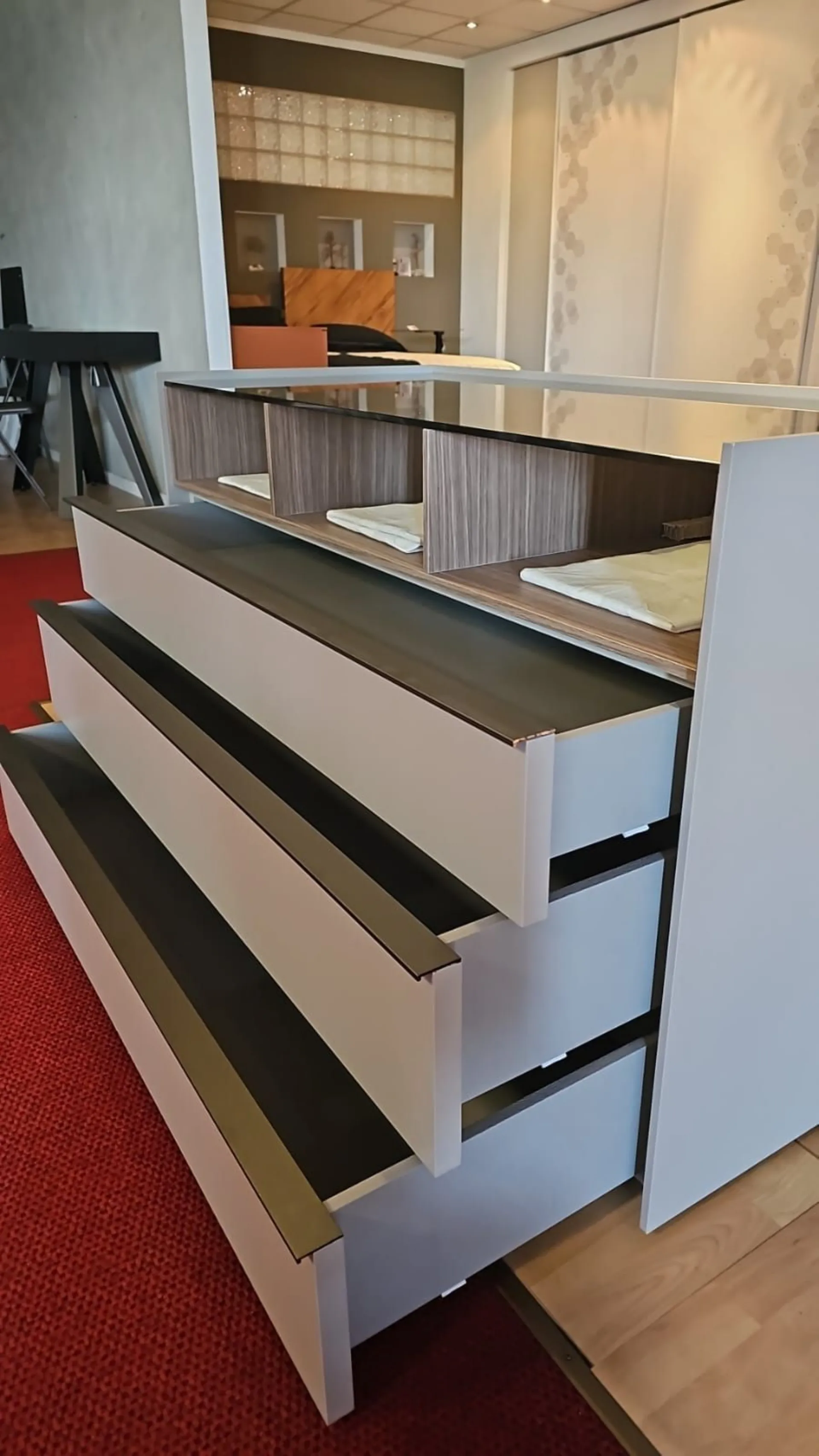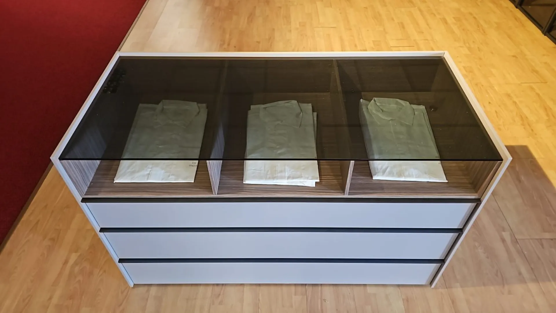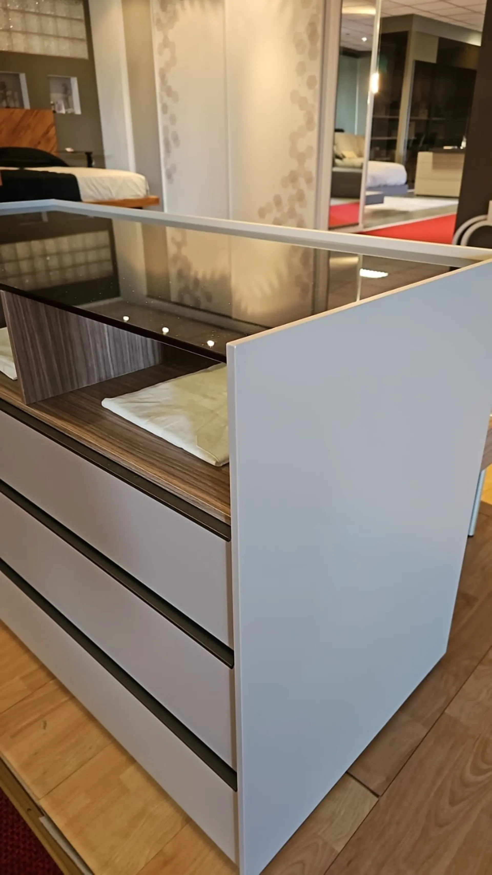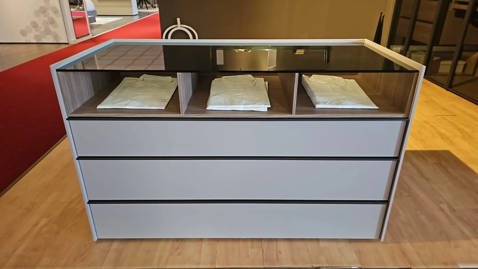Comò Adok mod. Stream, dotato di 3 cassetti con 3 vani a giorno, top in vetro trasparente fumè, struttura materico titanio, elemento a giorno finitura caramel, maniglia dei cassetti in metallo.