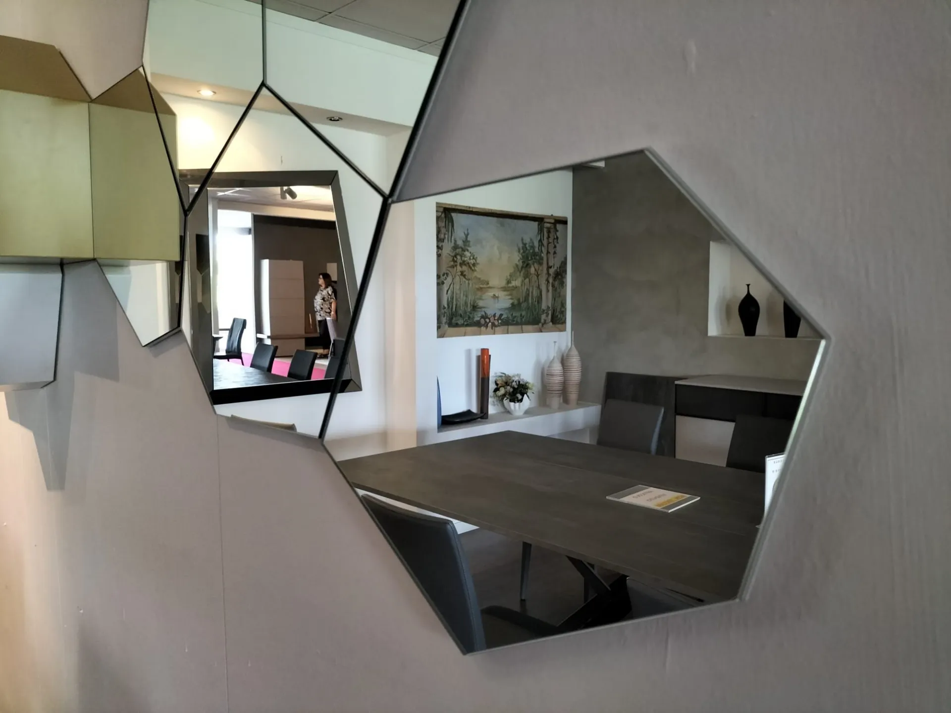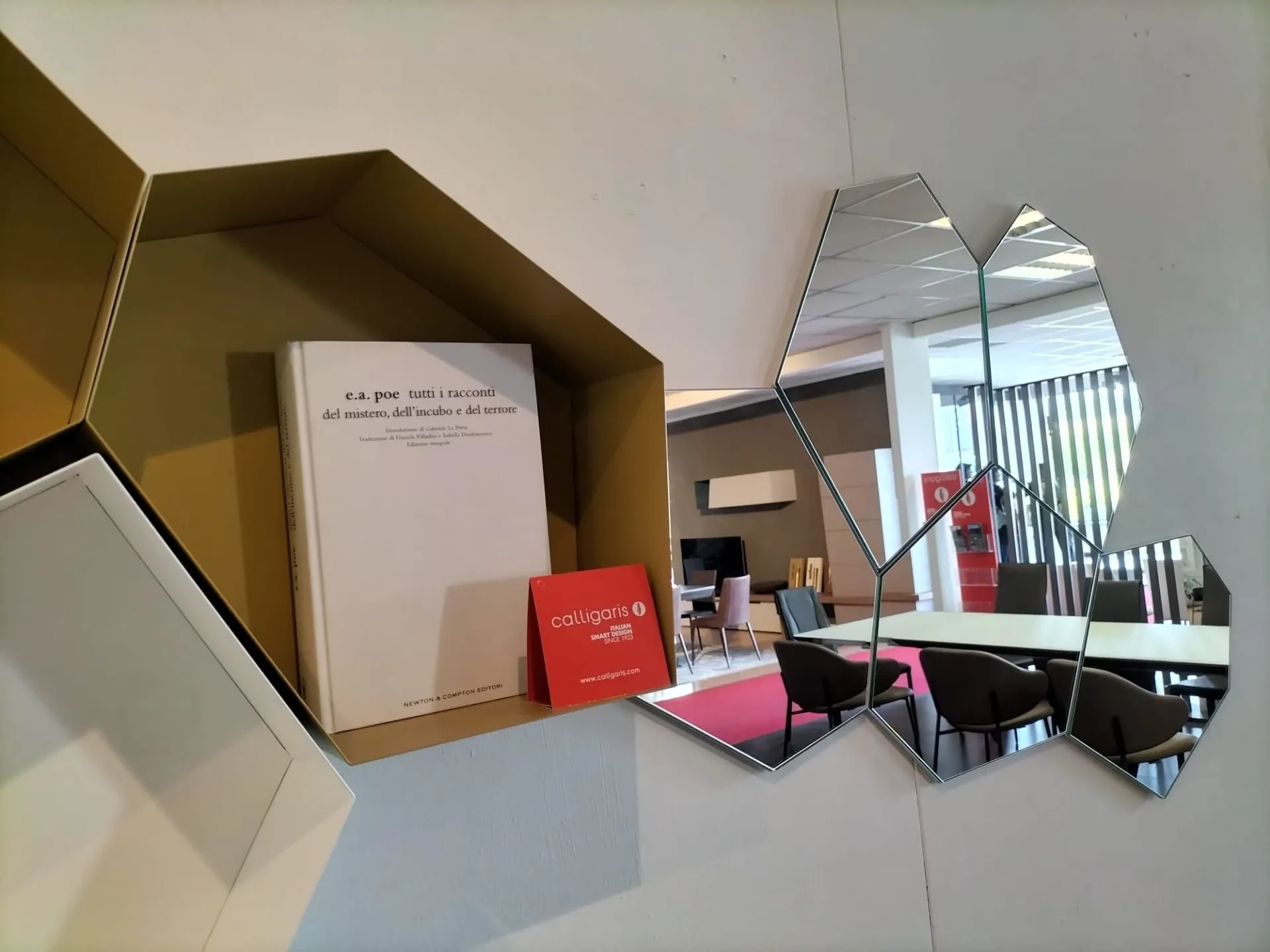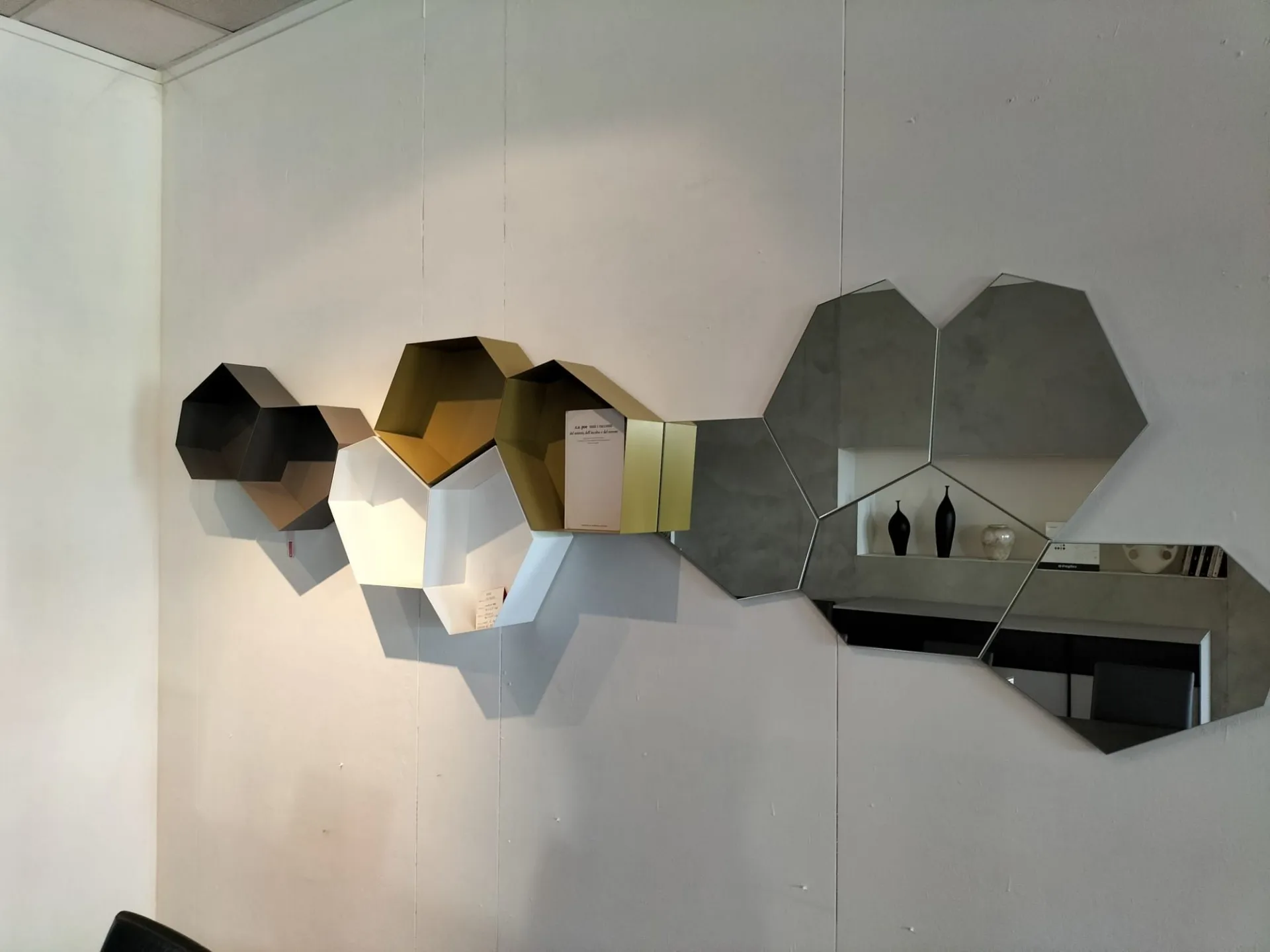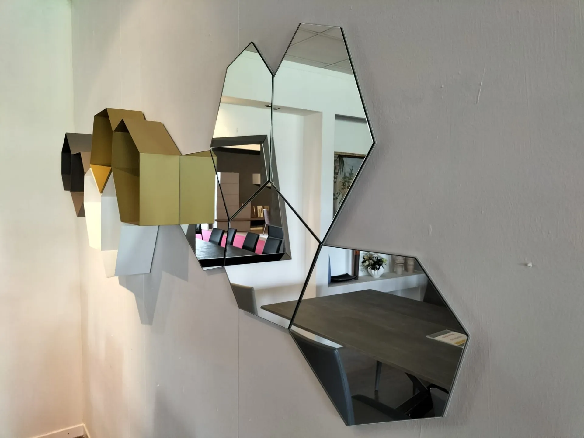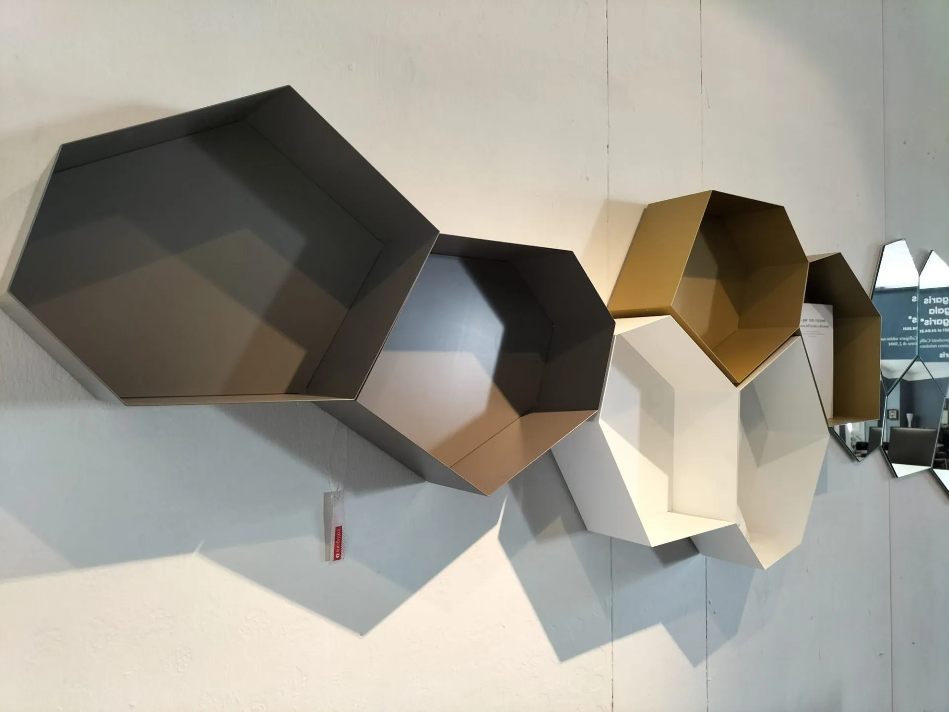 Contenitori a giorno in metallo laccato bianco, tortora e senape con specchi di forma irregolare