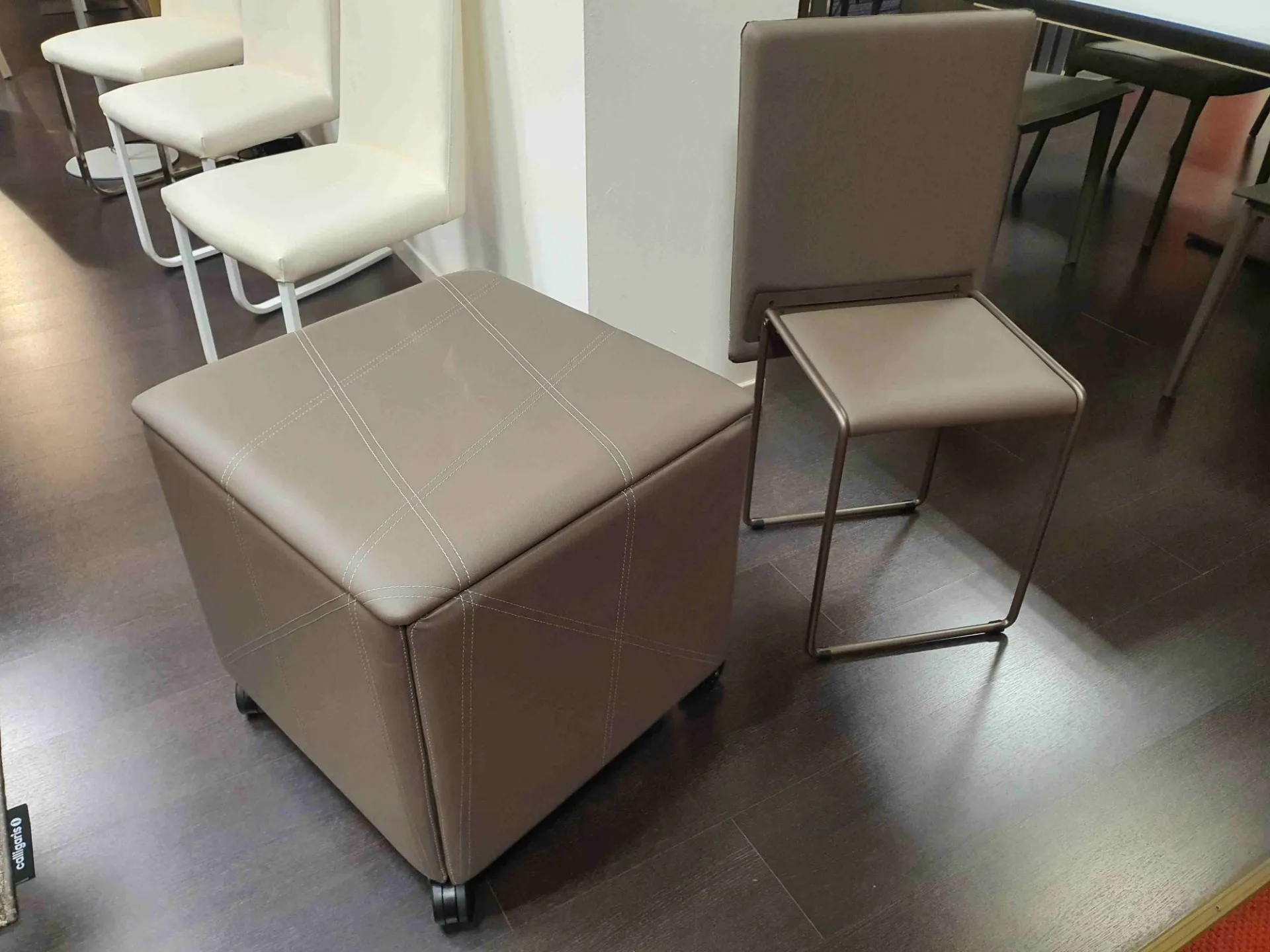 Pouff Cubix rivestito in ecopelle mastice con struttura in metallo bronzo, contenente n.4 sedie pieghevoli con seduta e poggia schiena imbottiti, n.5 sedute complessive, ruote per movimentarlo facilmente quando è chiuso