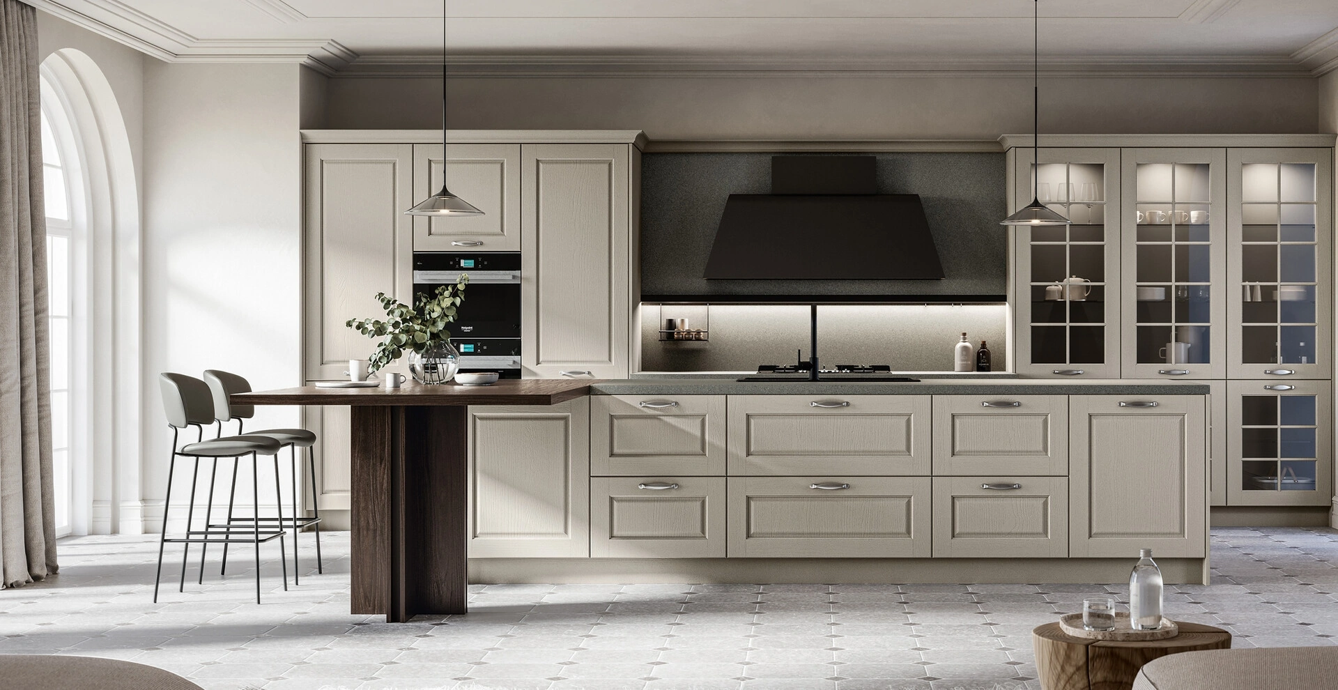 È possibile personalizzare i materiali e le finiture della cucina Asolo 03?Sì, la cucina Asolo 03 è disponibile in materiali come legno massello o laccato. Presso il nostro negozio puoi visionare i campioni di materiali e finiture, e personalizzare le dimensioni standard degli arredi per adattarli al tuo spazio.