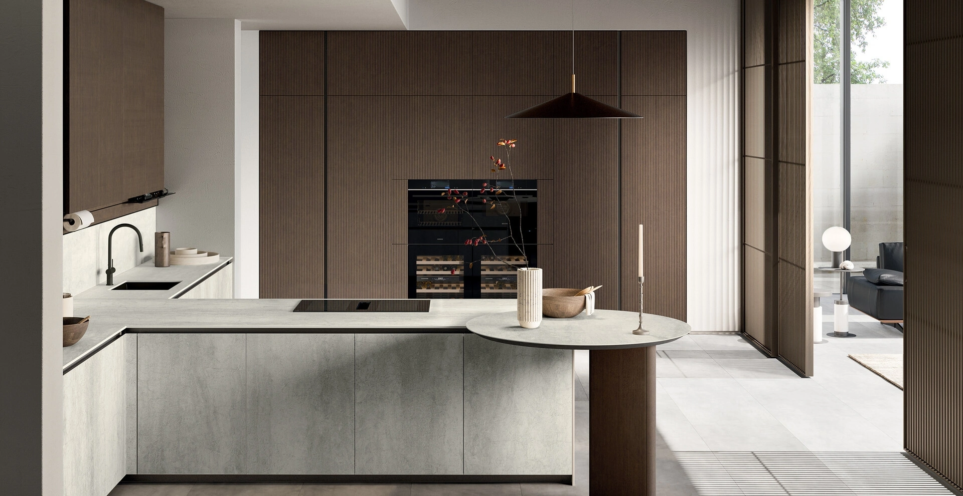 | Materiale: | Ante in vetro lucido o satinato; possibilità di piani in laminato, HPL, quarzo, gres. |